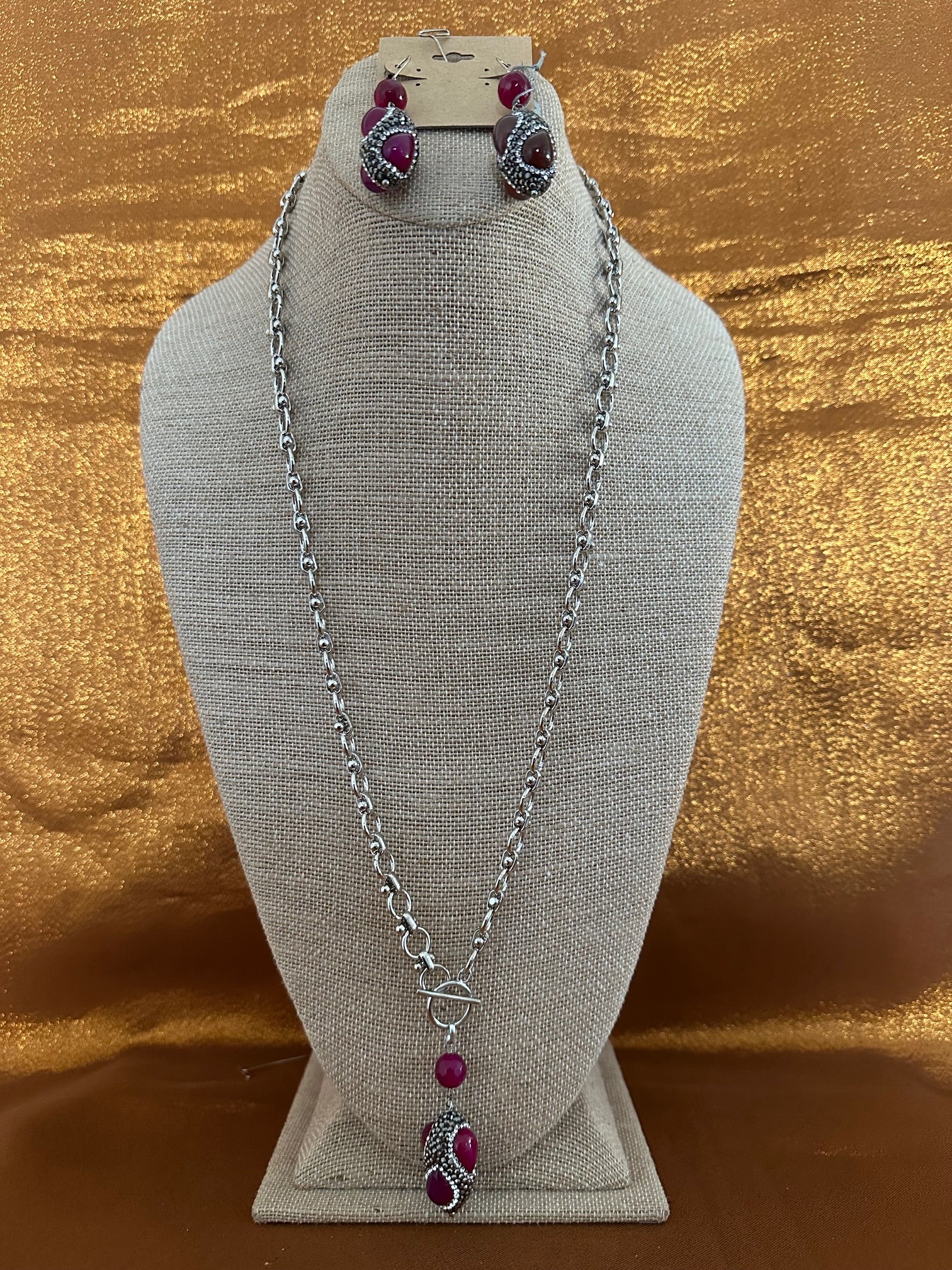 Introducing the 117 B52 Fuschia Agate Chain—where bold color meets effortless elegance. This stunning piece from the Rumae Gemstone collection pairs a captivating necklace with matching earrings, each showcasing the rich beauty of fuschia agate with refined silver accents. Perfect for those who love to mix gemstone glamour with everyday wear, this set lets your personality shine. Handcrafted in Los Angeles with care, it's designed for anyone ready to make a statement.