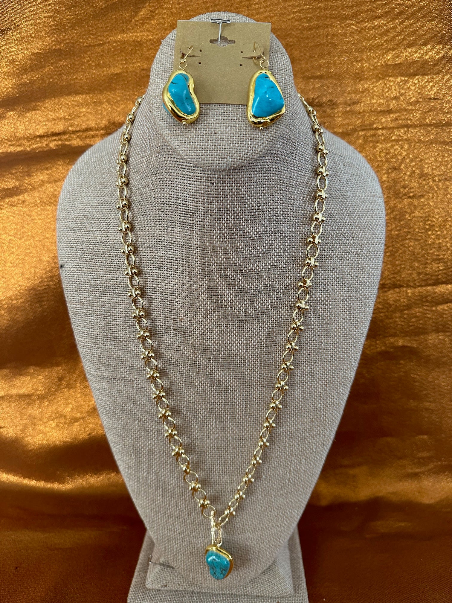 Discover effortless elegance with this captivating gemstone ensemble from Rumae's curated collection. Featuring a coordinated necklace and earring set adorned with turquoise, this piece celebrates individuality with understated sophistication. Crafted in Los Angeles with meticulous attention to quality, it's designed for those who appreciate timeless style with a contemporary edge. Express your unique aesthetic with jewelry that speaks to your refined taste.