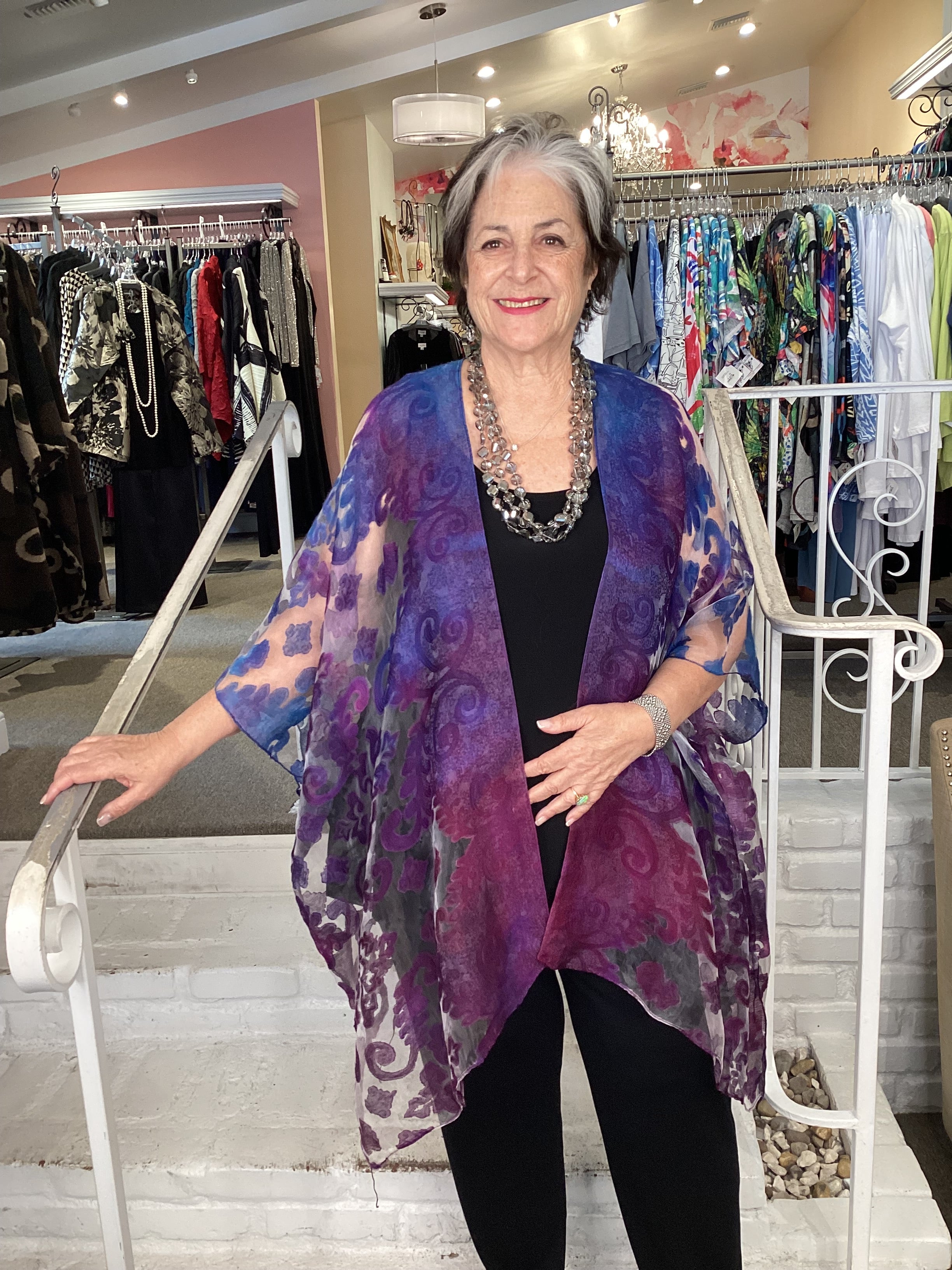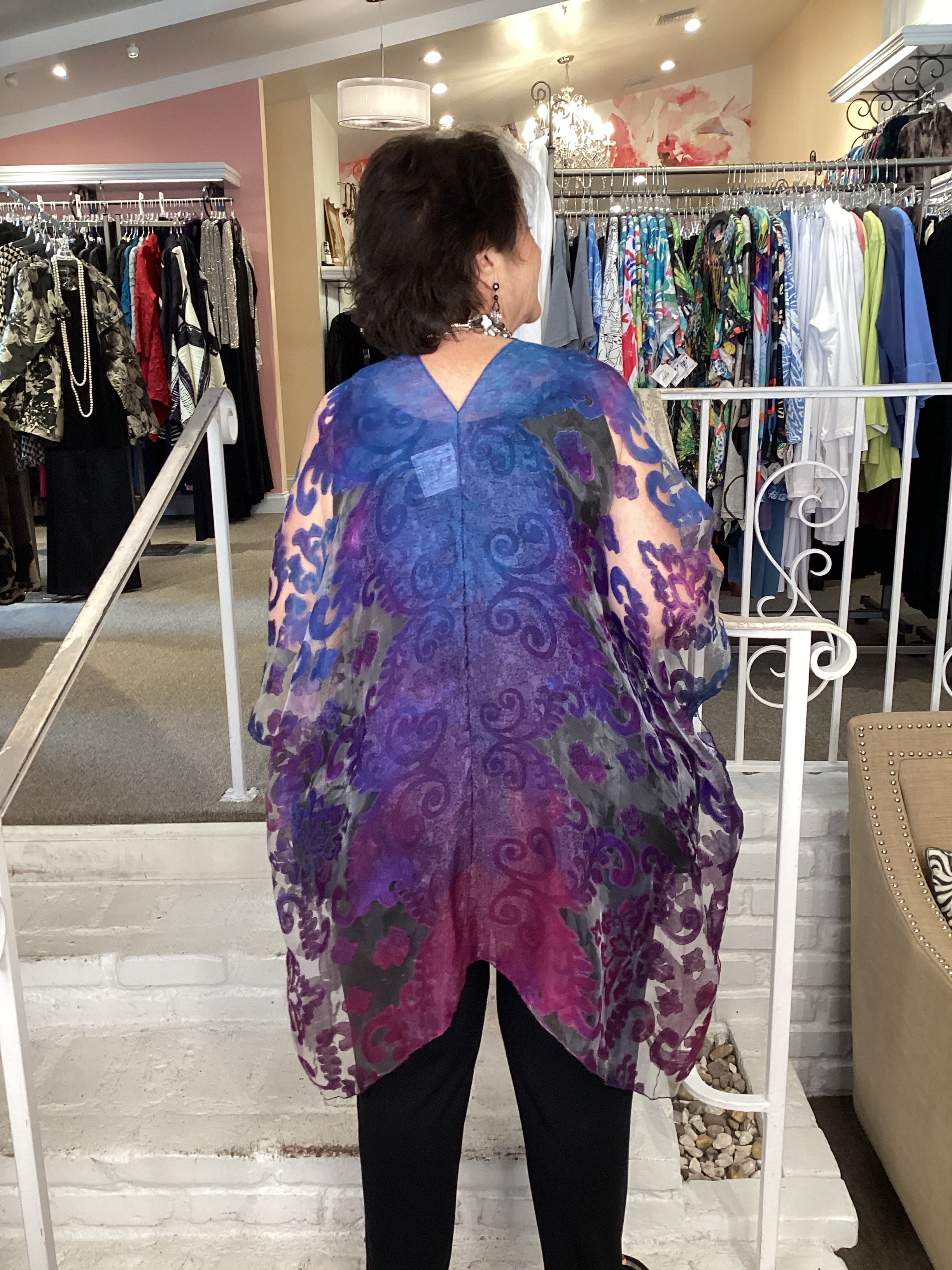 This playful kimono duster from Spain in America features stunning hand-dyed burnout fabrics in a rainbow of colors. Designed as a one-size, one-of-a-kind statement piece, it drapes beautifully on plus-size women. The flowing length falls anywhere from below the knees to the ankles, depending on your height—making it a fun and dramatic addition to your wardrobe. These wonderful pieces fit up to size 4X.