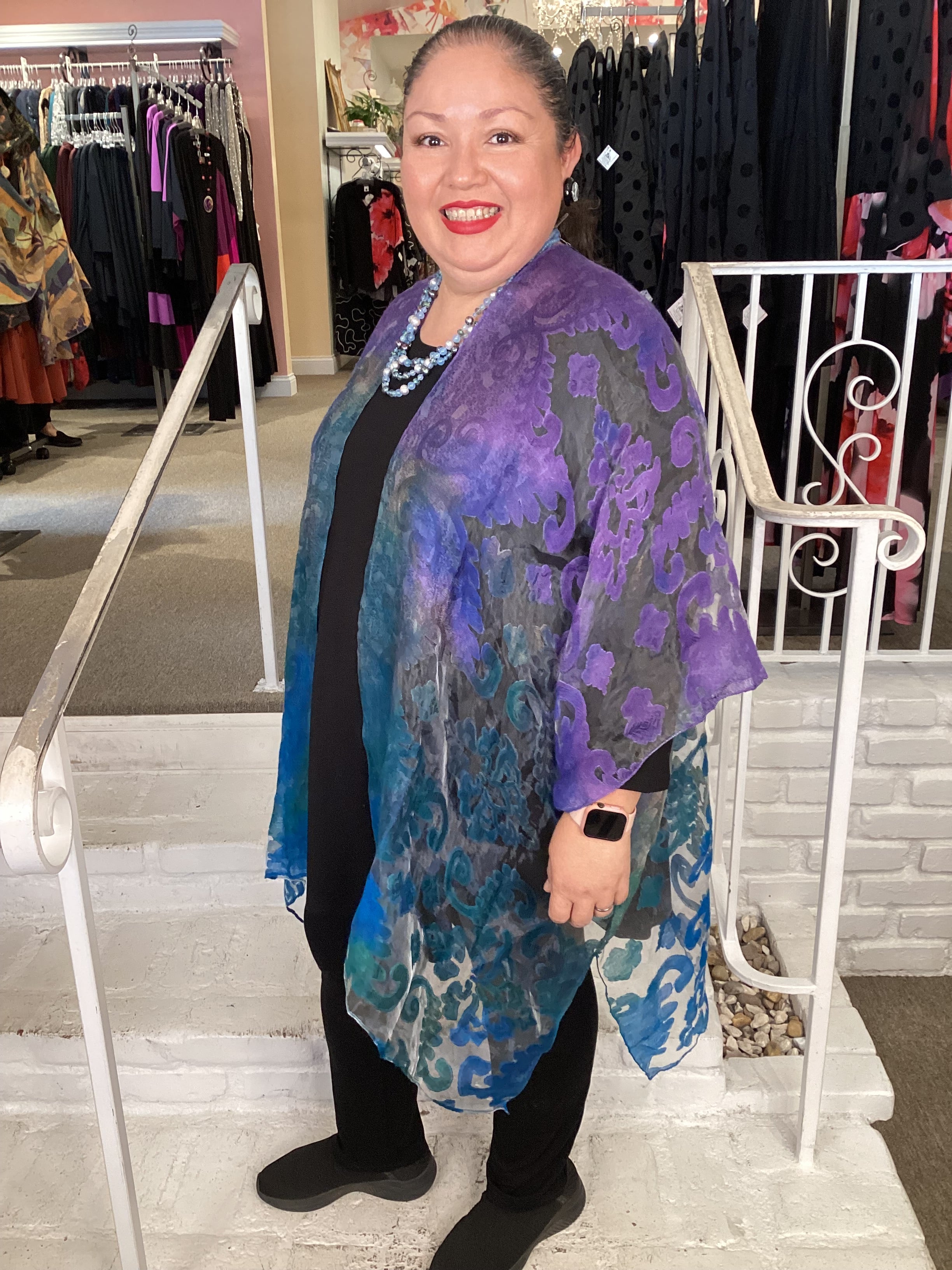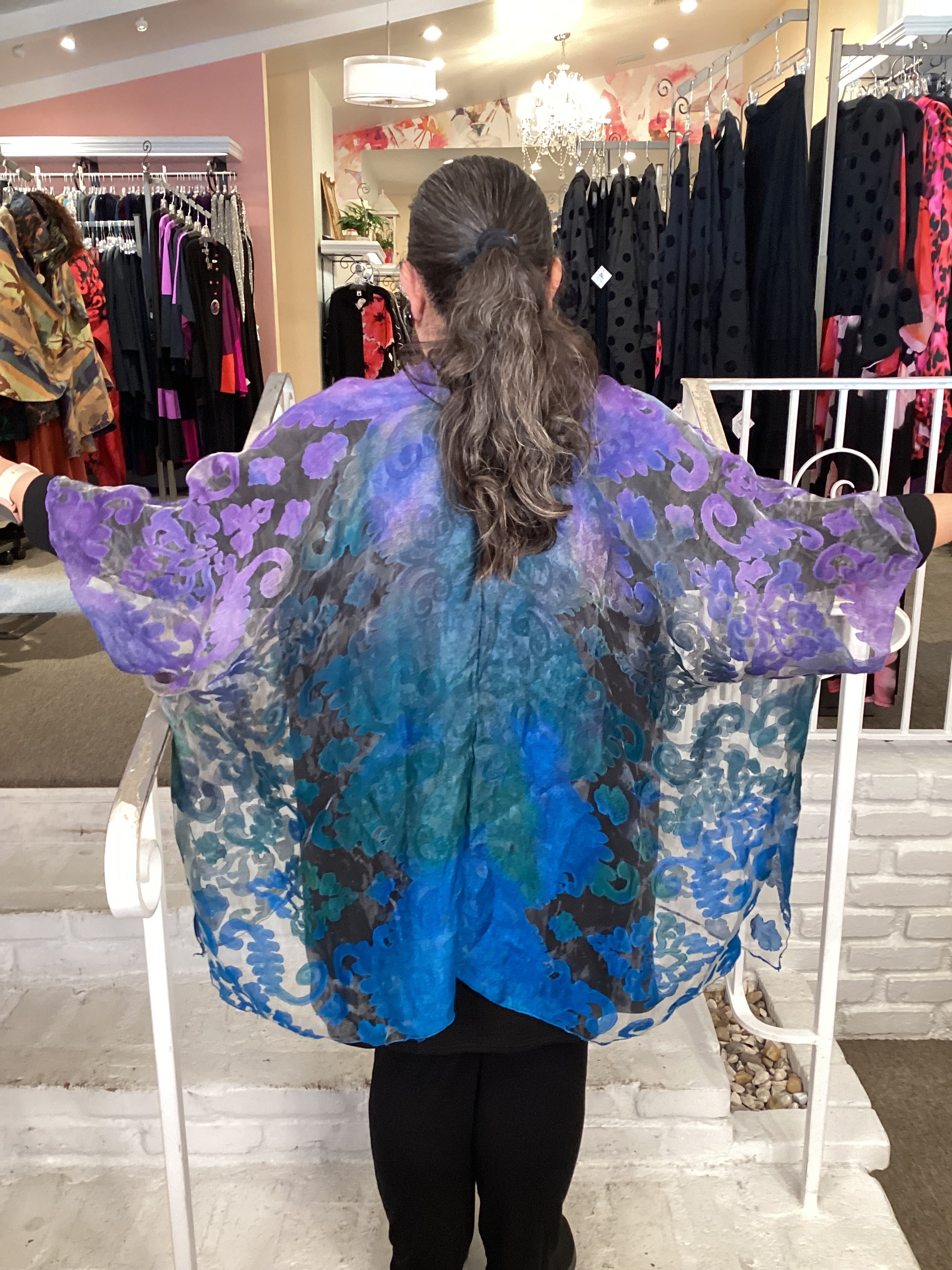 This playful kimono duster from Spain in America features stunning hand-dyed burnout fabrics in a rainbow of colors. Designed as a one-size, one-of-a-kind statement piece, it drapes beautifully on plus-size women. The flowing length falls anywhere from below the knees to midcalf depending on your height—making it a fun and dramatic addition to your wardrobe. These wonderful pieces fit up to size 4X.