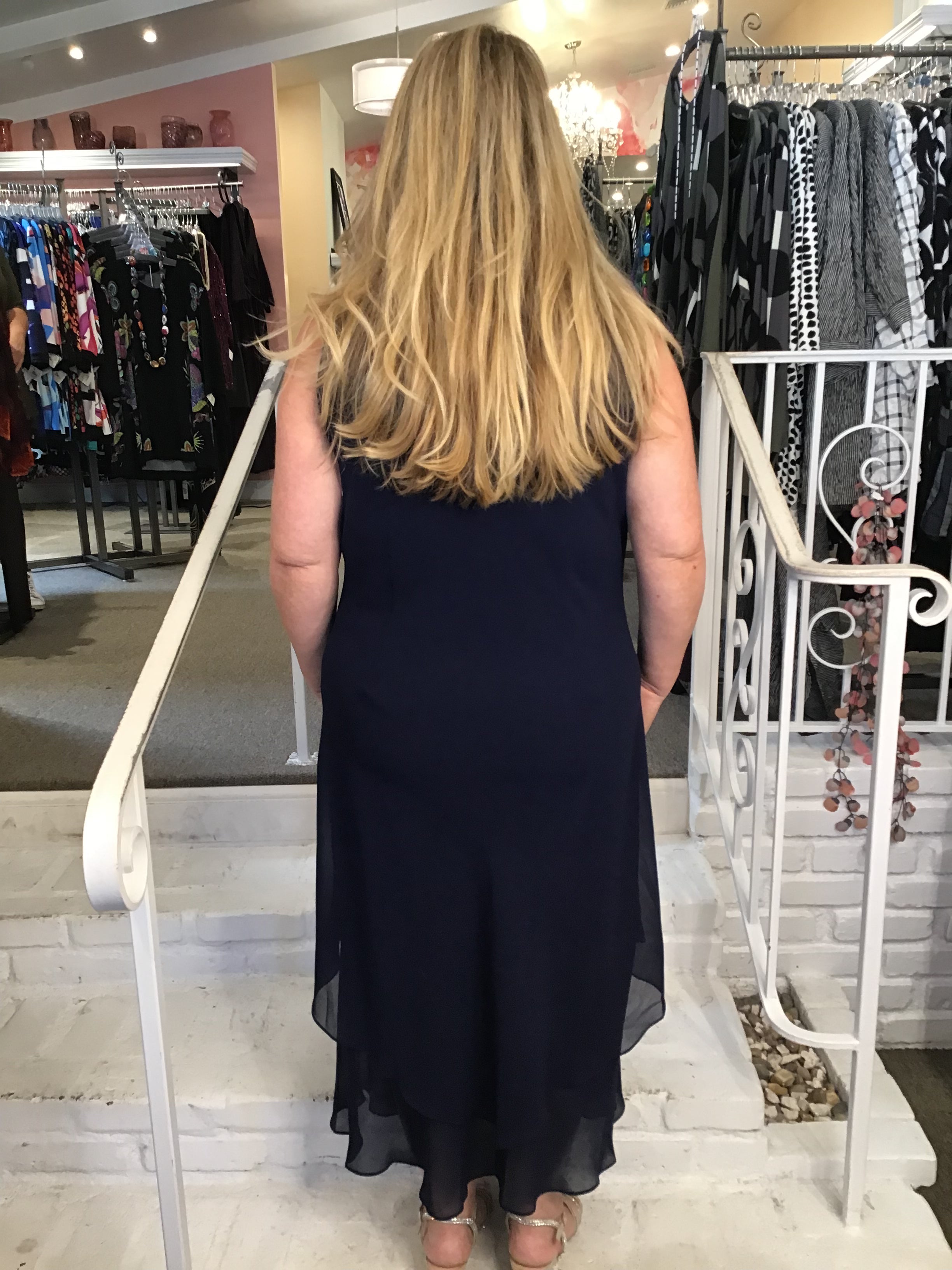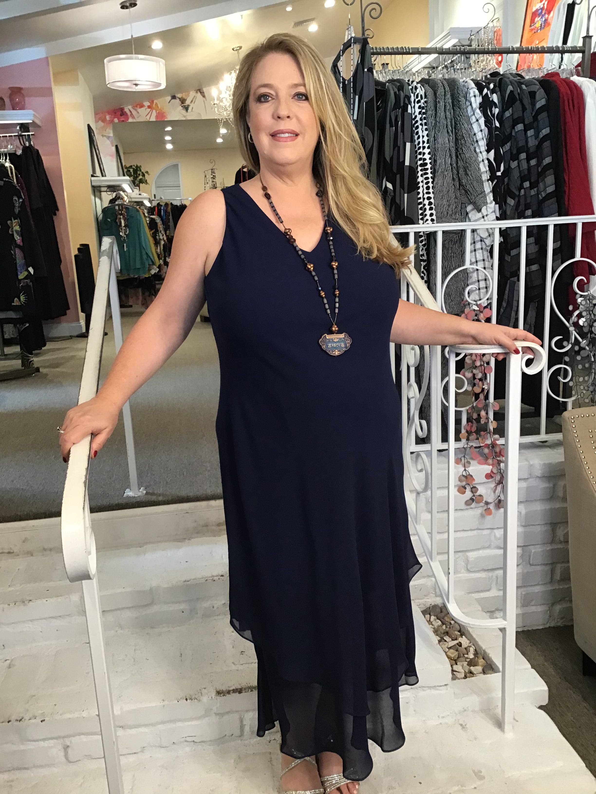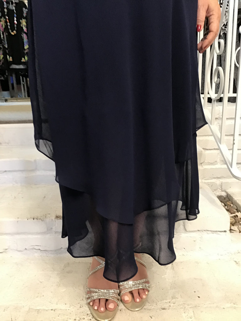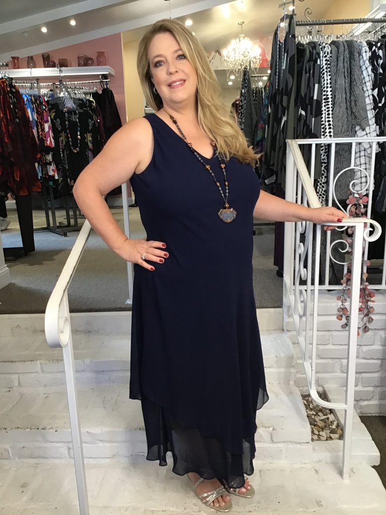 This bias cut, double layer, dress is the perfect staple for any dressy occasion. It is by Simply Silk, and has a vee neck, it is sleeveless and it is perfect on its own or as a base layering piece. You can add bold jewelry, or a stunning jacket, And you have a stunning outfit for a festive occasion. This is a classic black.