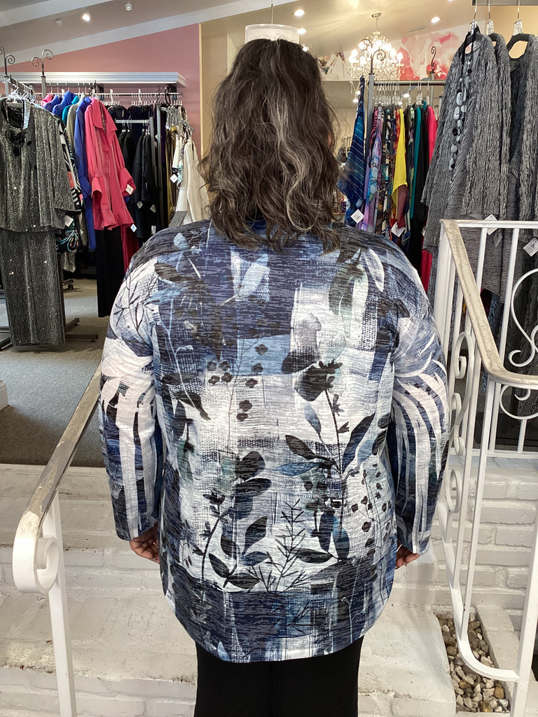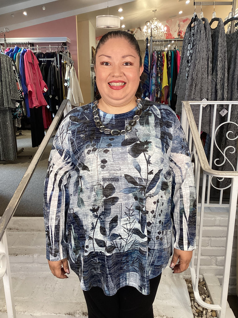 Mixed blues and black floral print on white, lightweight cotton poly blend. Round neckline, shirt tail hemline, bracelet length crinkled sleeves and a-line silhouette. Model wears a 2X.
