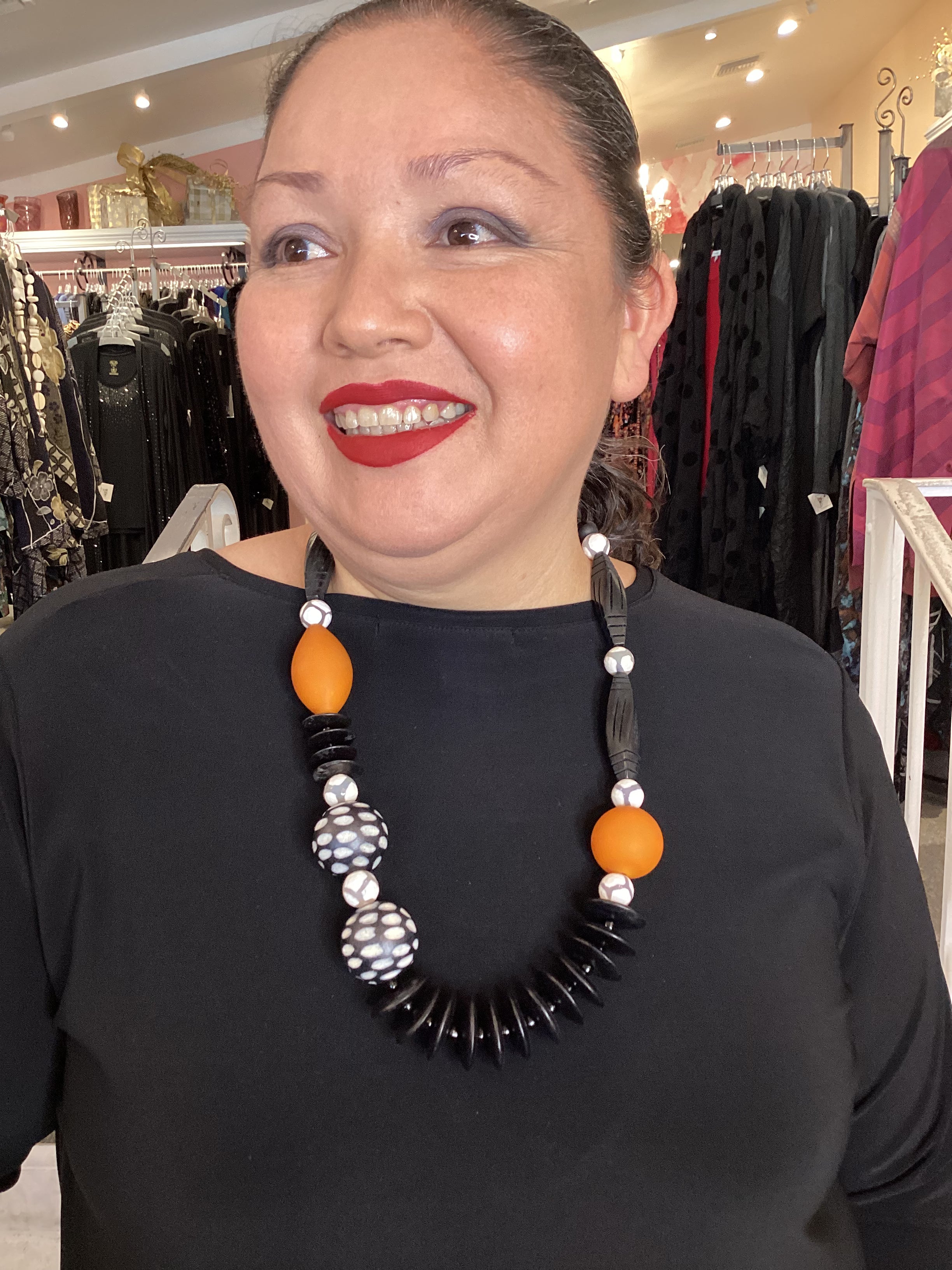 This exquisite NECK CARVED WOOD necklace is a unique work of art. Its intricate design of glass, ceramic, and wood beads is an eclectic blend of black, white, and orange, perfect for making a bold statement. Showcase your sophisticated style and elevate your look with this eye-catching piece.