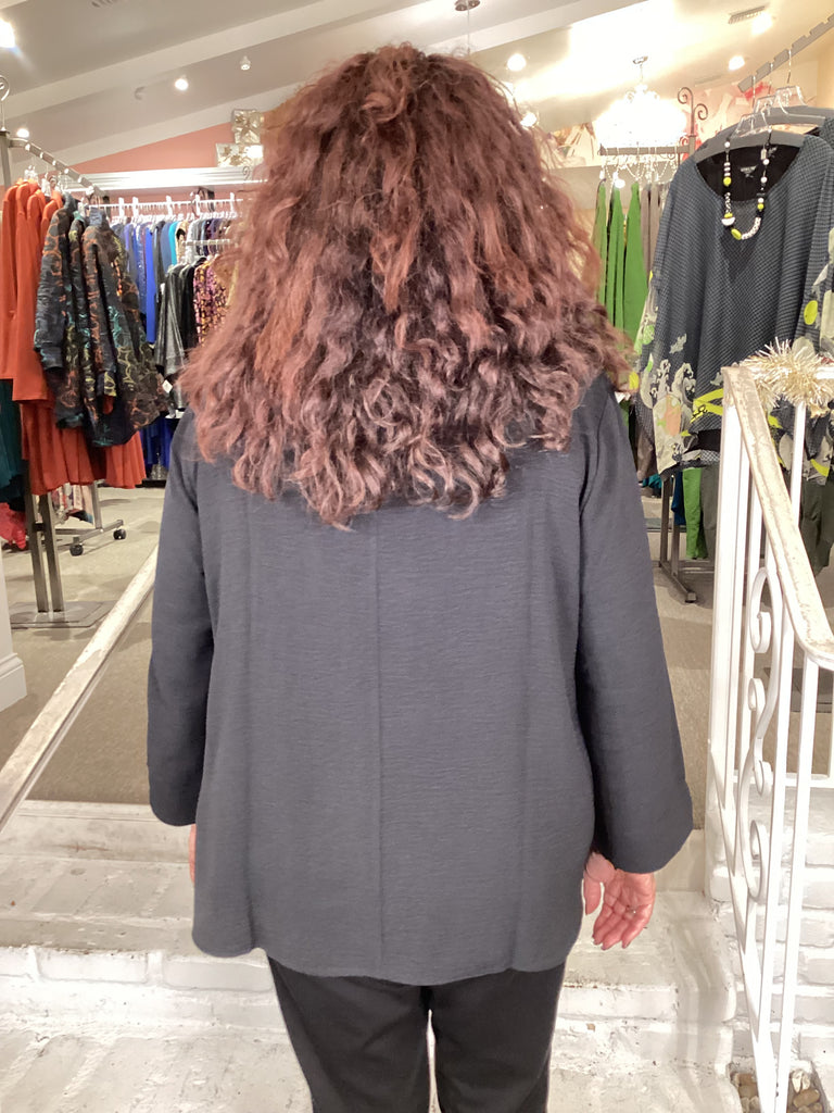 Soft, lightweight textured crepe cowlneck with cuffed sleeves and pleat detailing on the lower front panel. The bust measures 46", length 27"