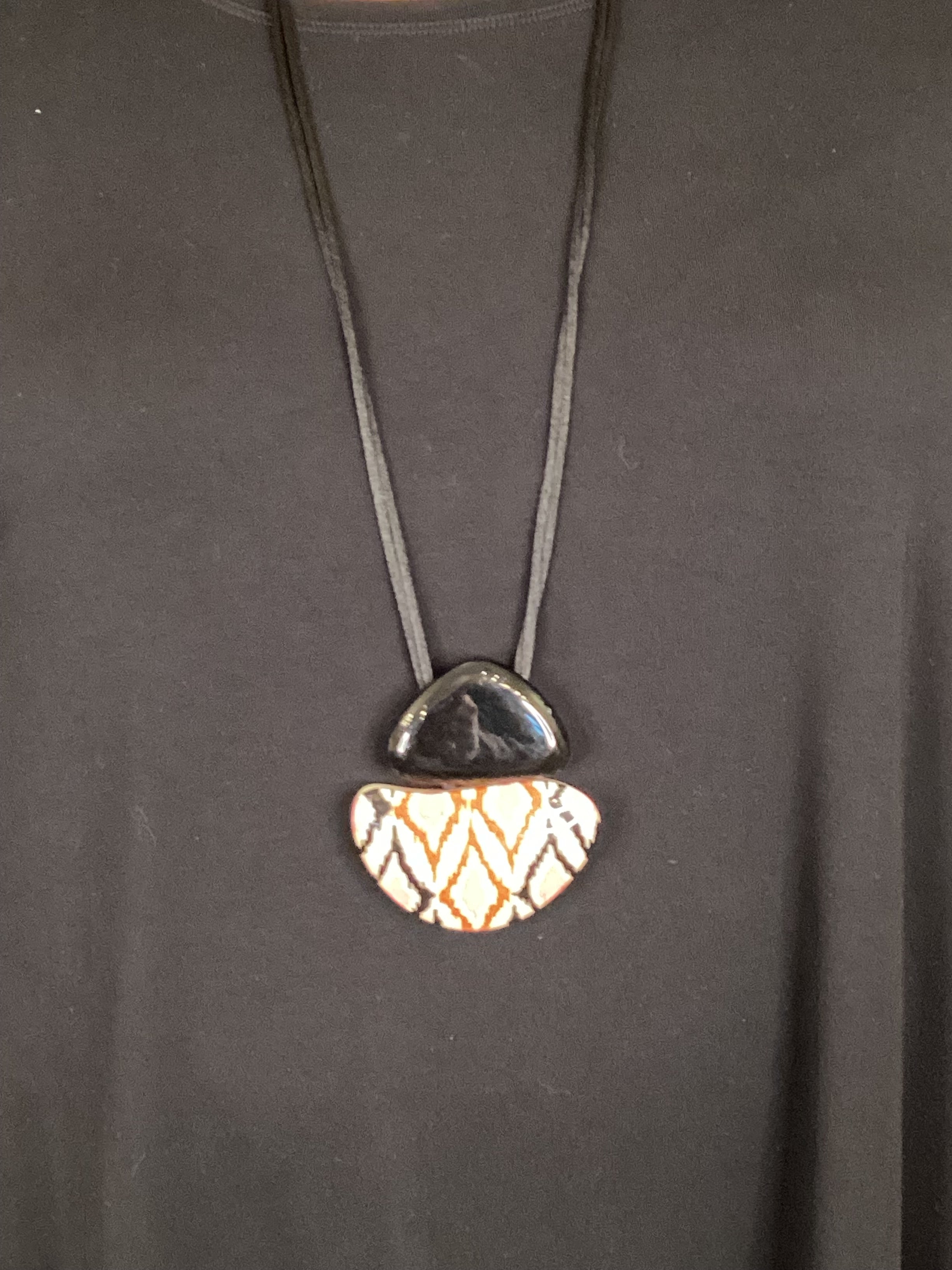Make a splash with this vibrant Ikat-patterned acrylic pendant that brings instant artistry to your neckline. The eye-catching design pairs beautifully with classic black accents, while the adjustable fit ensures it works with your unique style. Layer it, wear it solo—either way, it's a conversation starter!