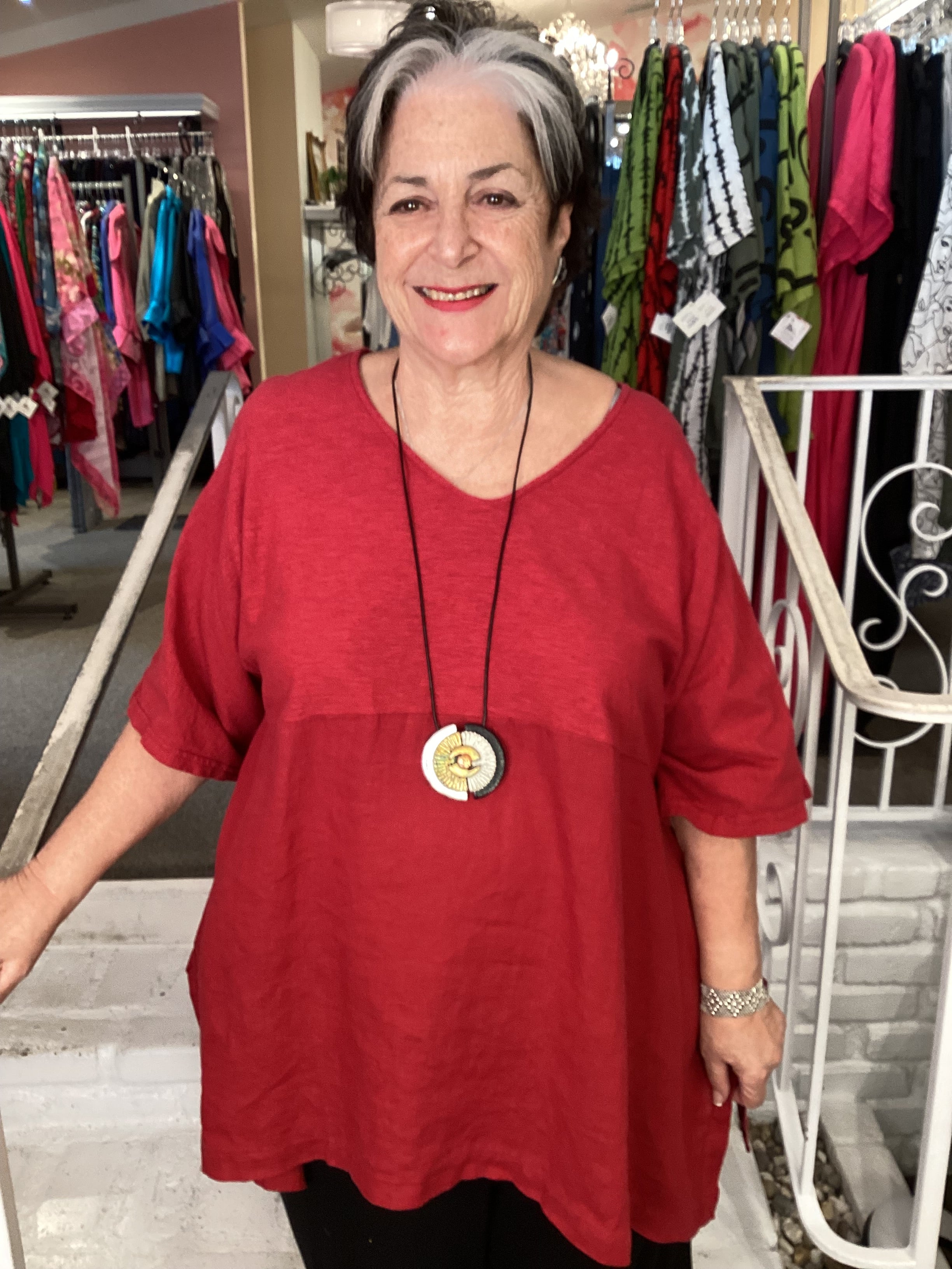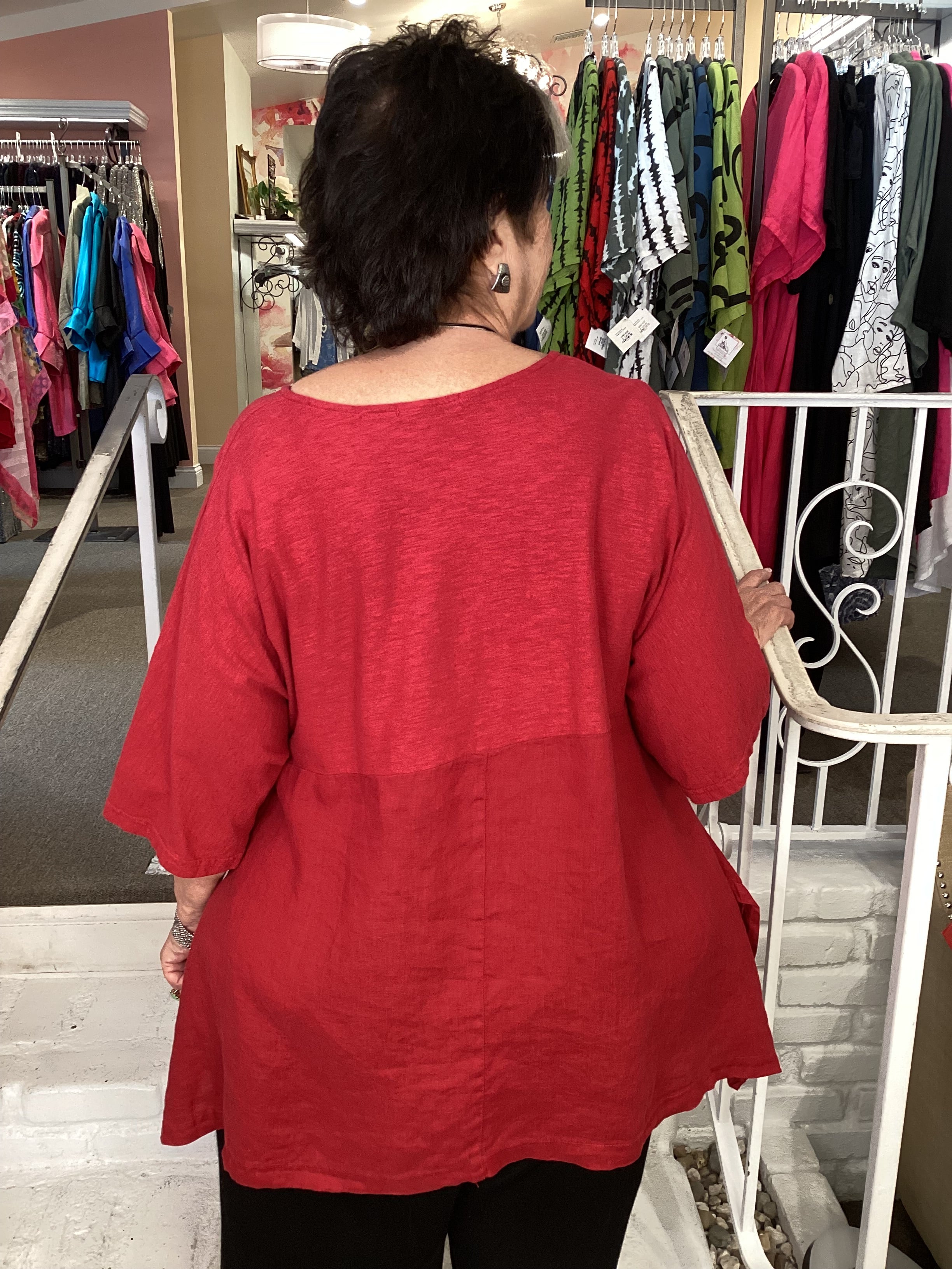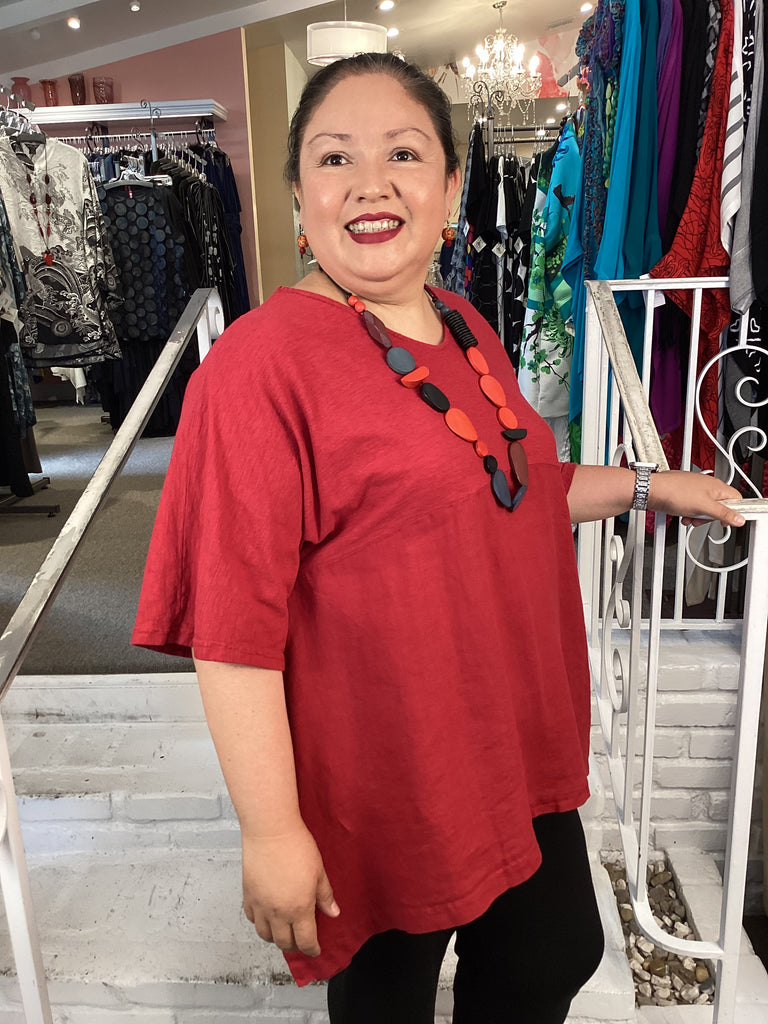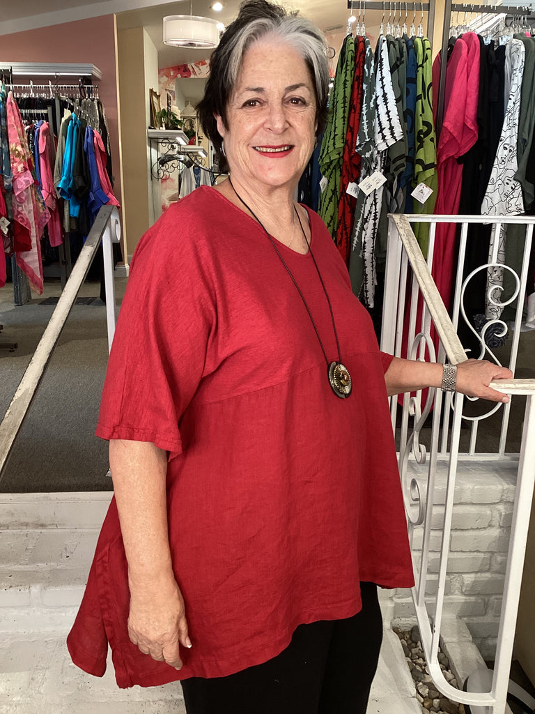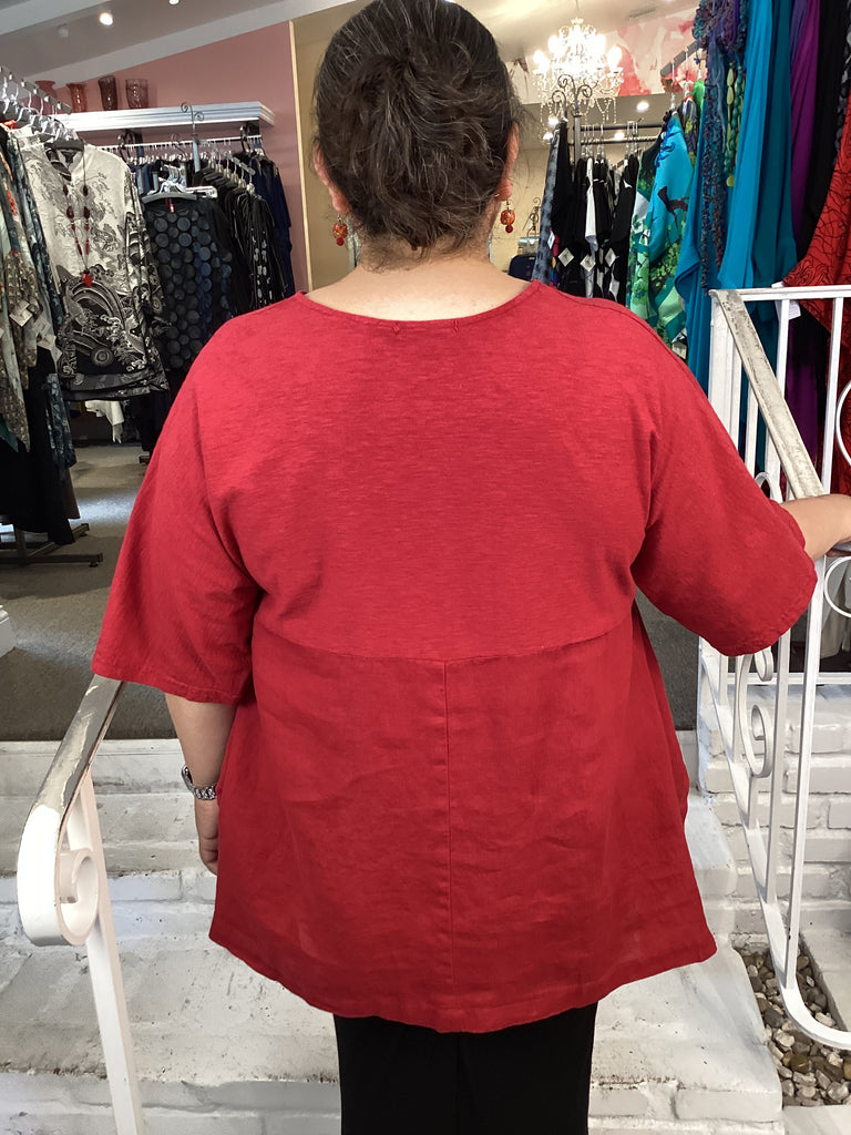 This Cut Loose top will become your go-to and pairs perfectly with everything. Cut Loose brought back the Artist Top after a hiatus, we are so happy to see it again. This top offers excellent coverage in a hanky weight linen-cotton combination. This top is a generous cut and falls in a figure flattering way. Elbow length sleeves keep you covered but cool, other details include a V-neckline, curved hemline with side slits and an empire waist.