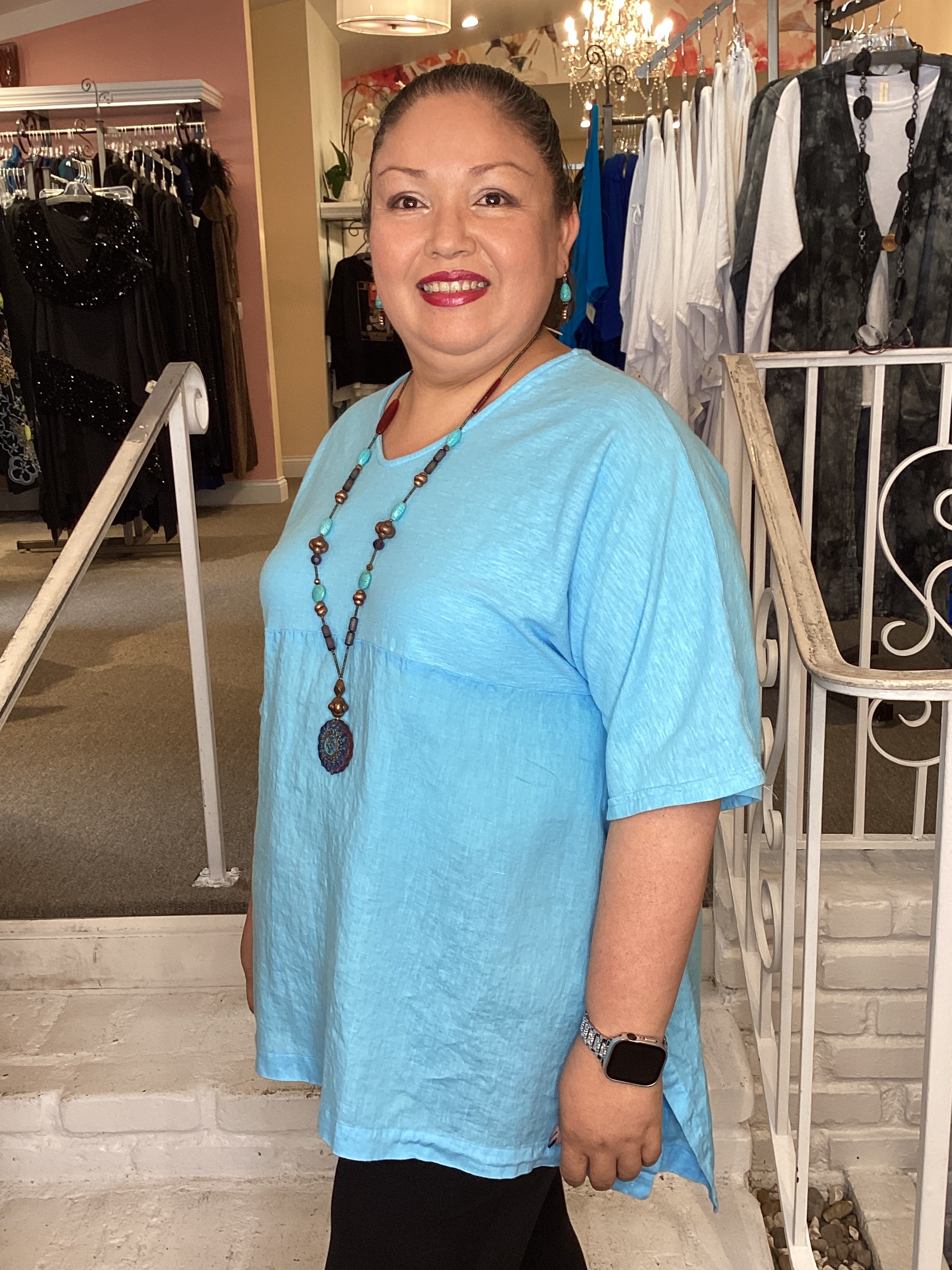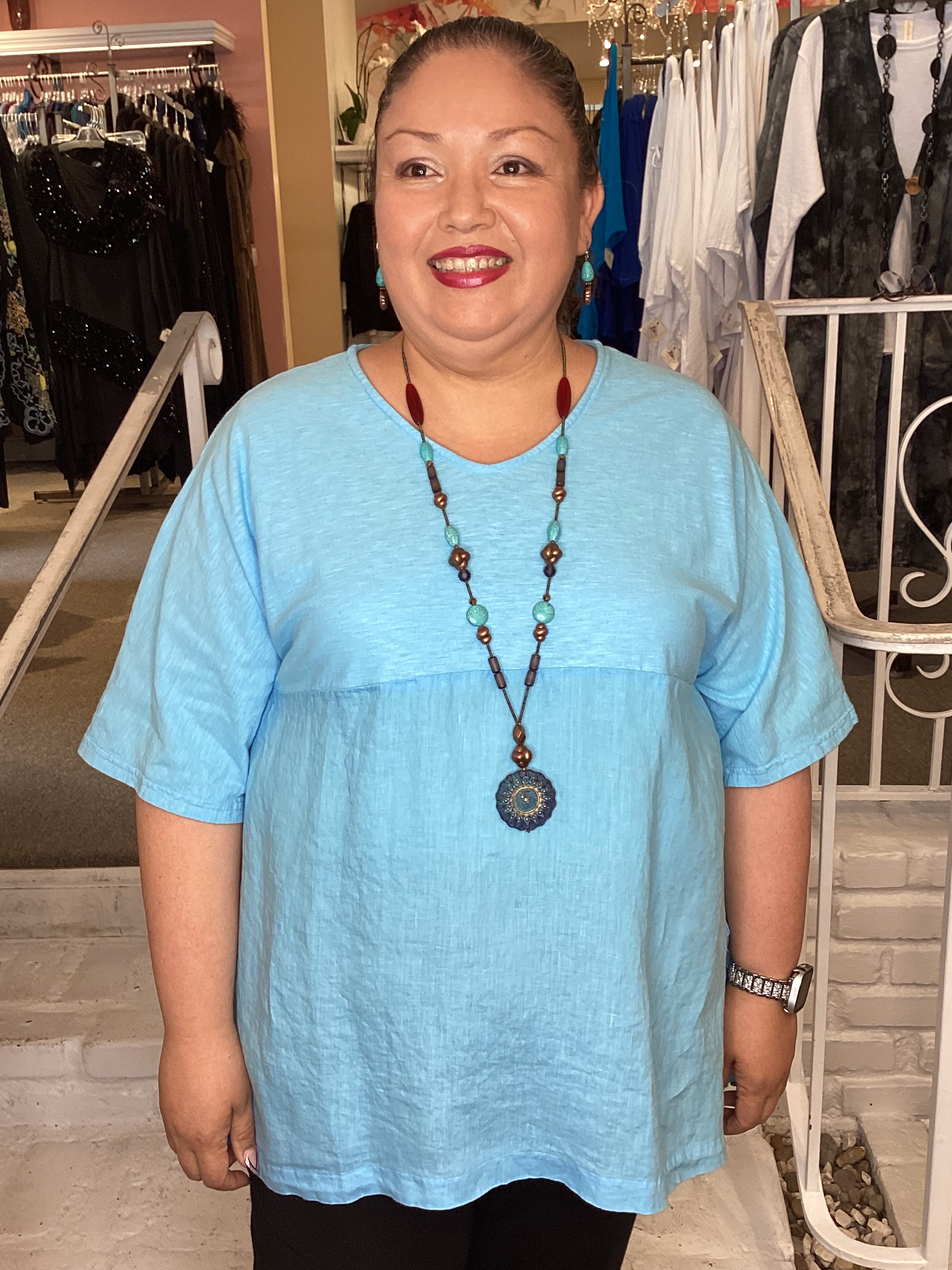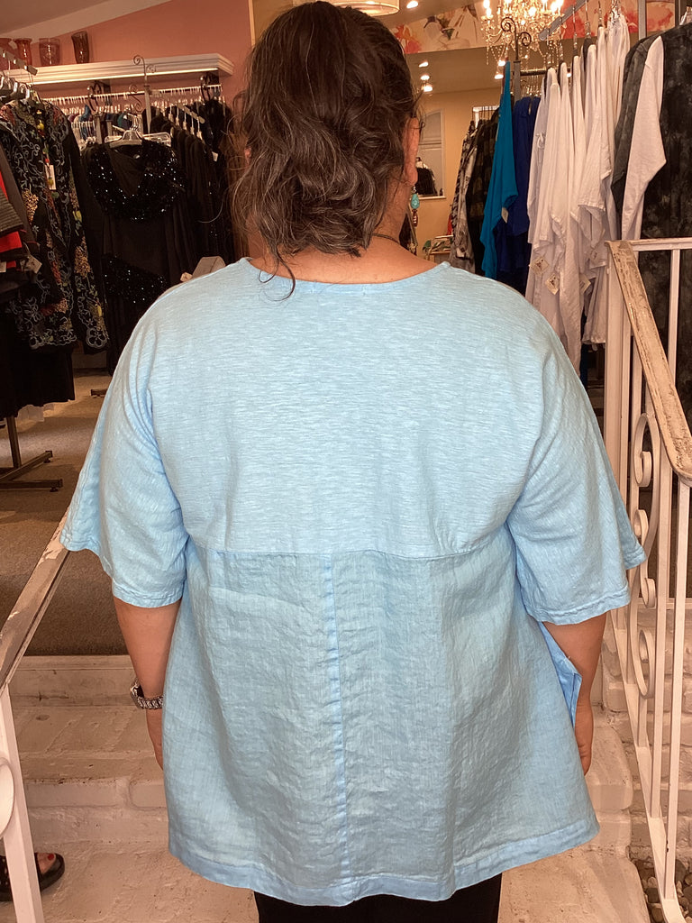 This Cut Loose top will become your go-to and pairs perfectly with everything. Cut Loose brought back the Artist Top after a hiatis, we are so happy to see it again. This top offers excellent coverage in a hanky weight linen-cotton combination. This top is a generous cut and falls in a figure flattering way. Elbow length sleeves keep you covered but cool, other details include a V-neckline, curved hemline with side slits and an empire waist.