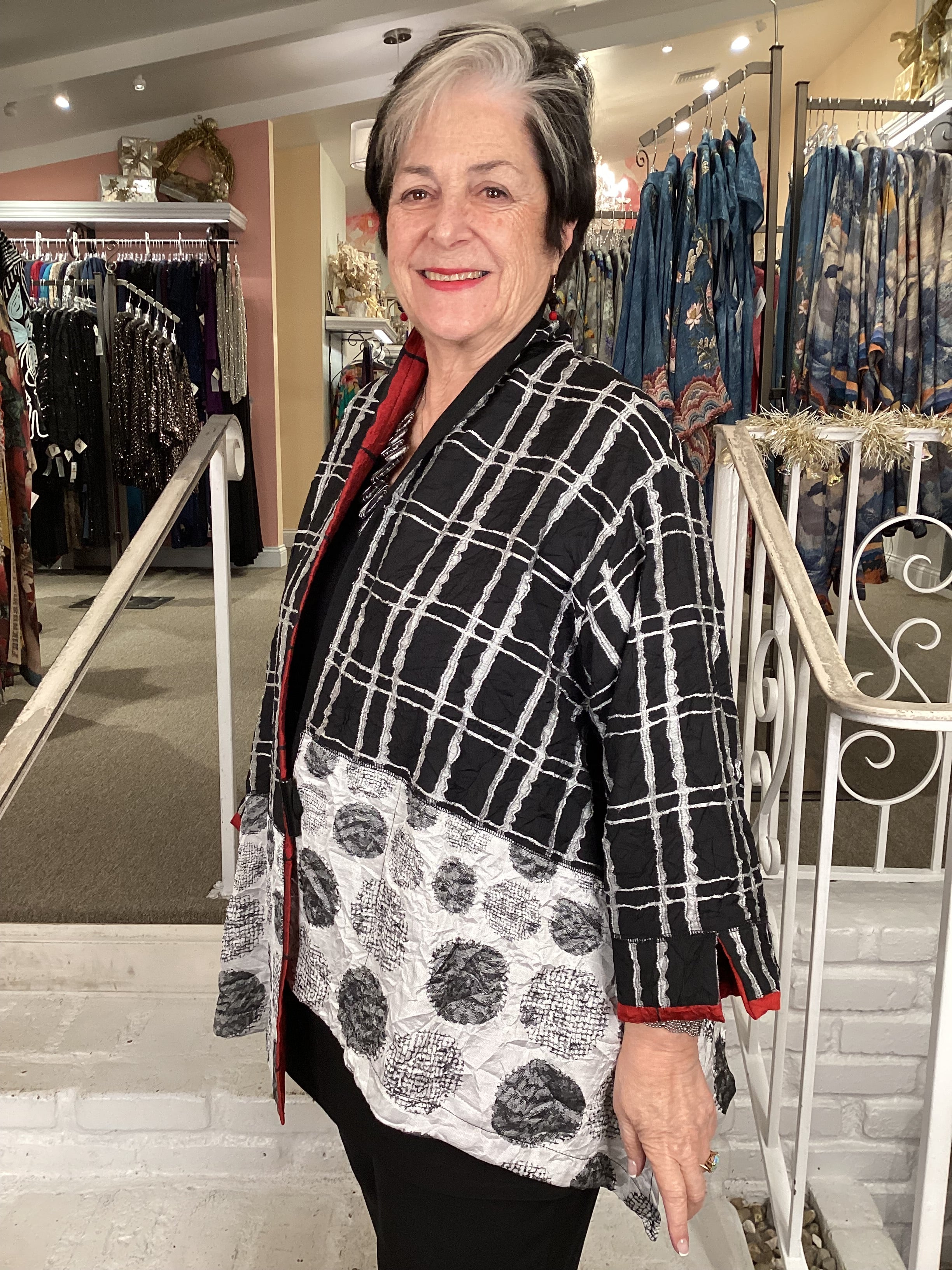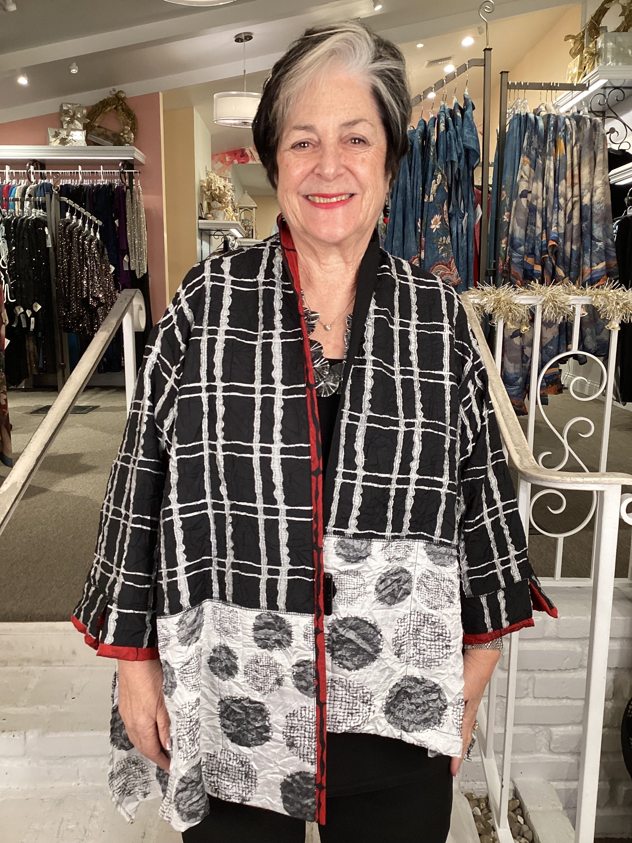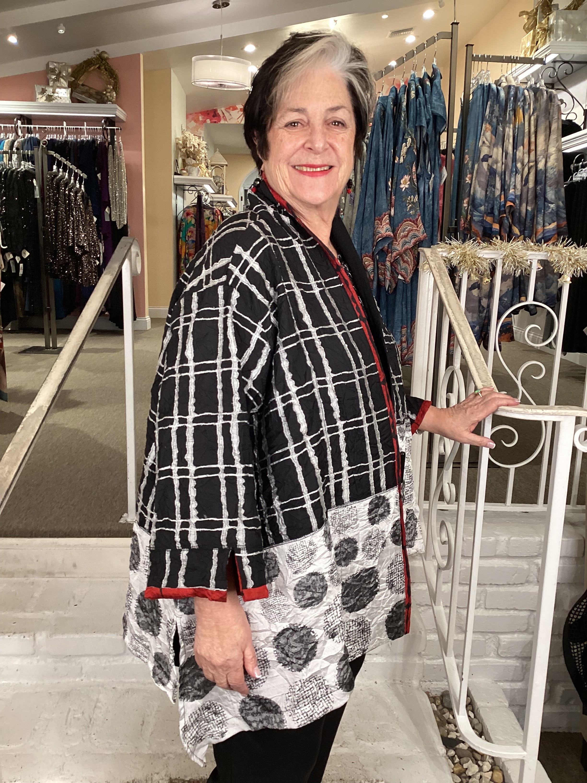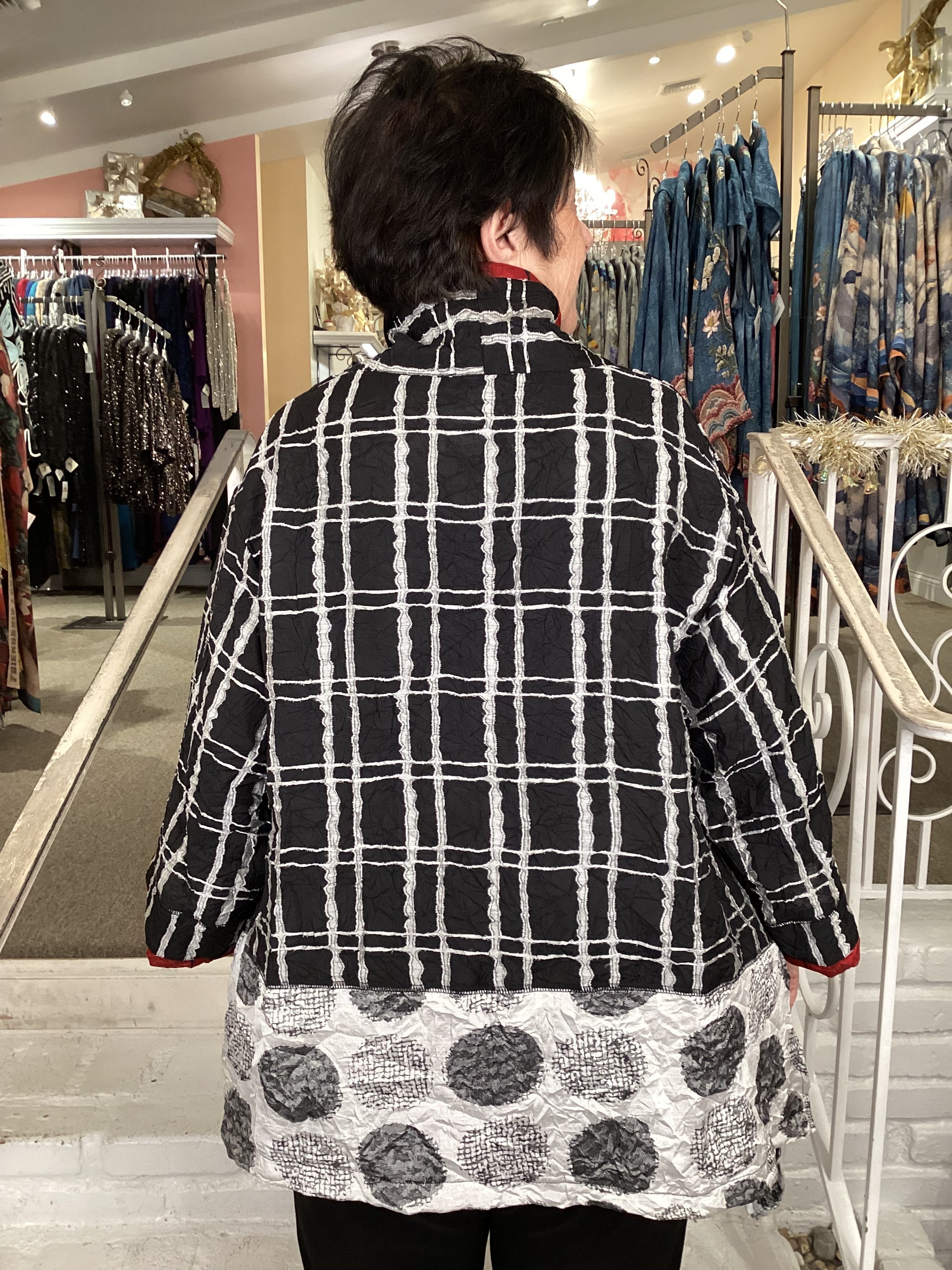Wrap yourself in effortless style with this playful kimono-inspired jacket! Featuring three-quarter sleeves and a striking asymmetric design, it showcases two contrasting patterns that dance together beautifully. Bold red border details frame the piece, adding a pop of personality and visual interest. Perfect for layering over your favorite outfits, this versatile jacket brings movement and flair to any look. Embrace your unique style with confidence!