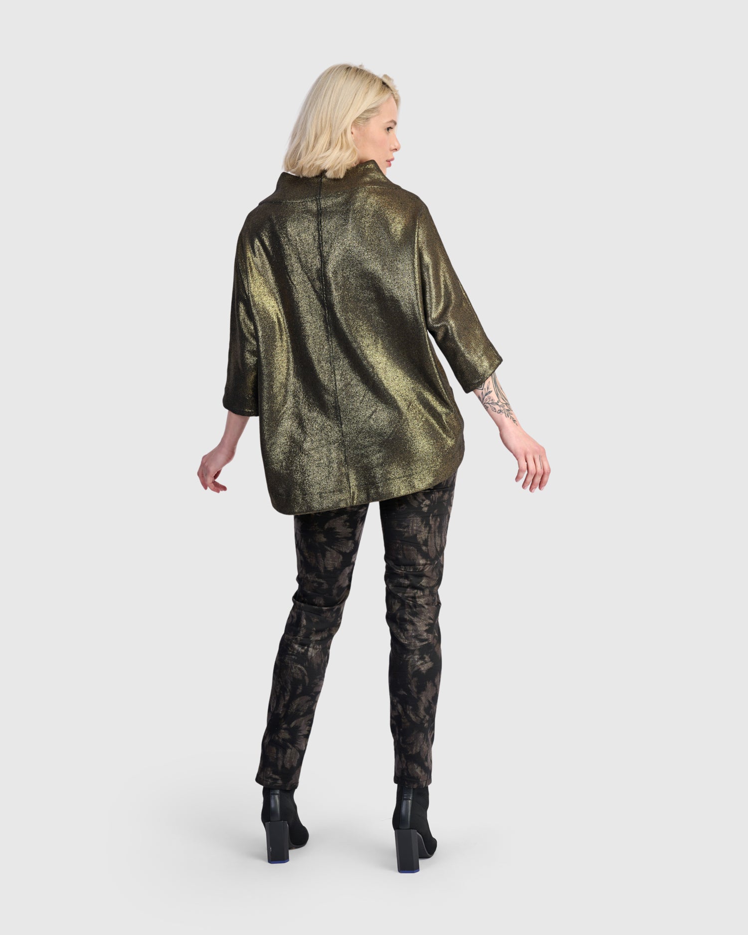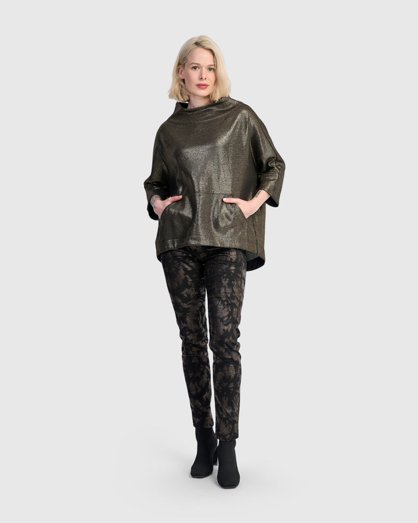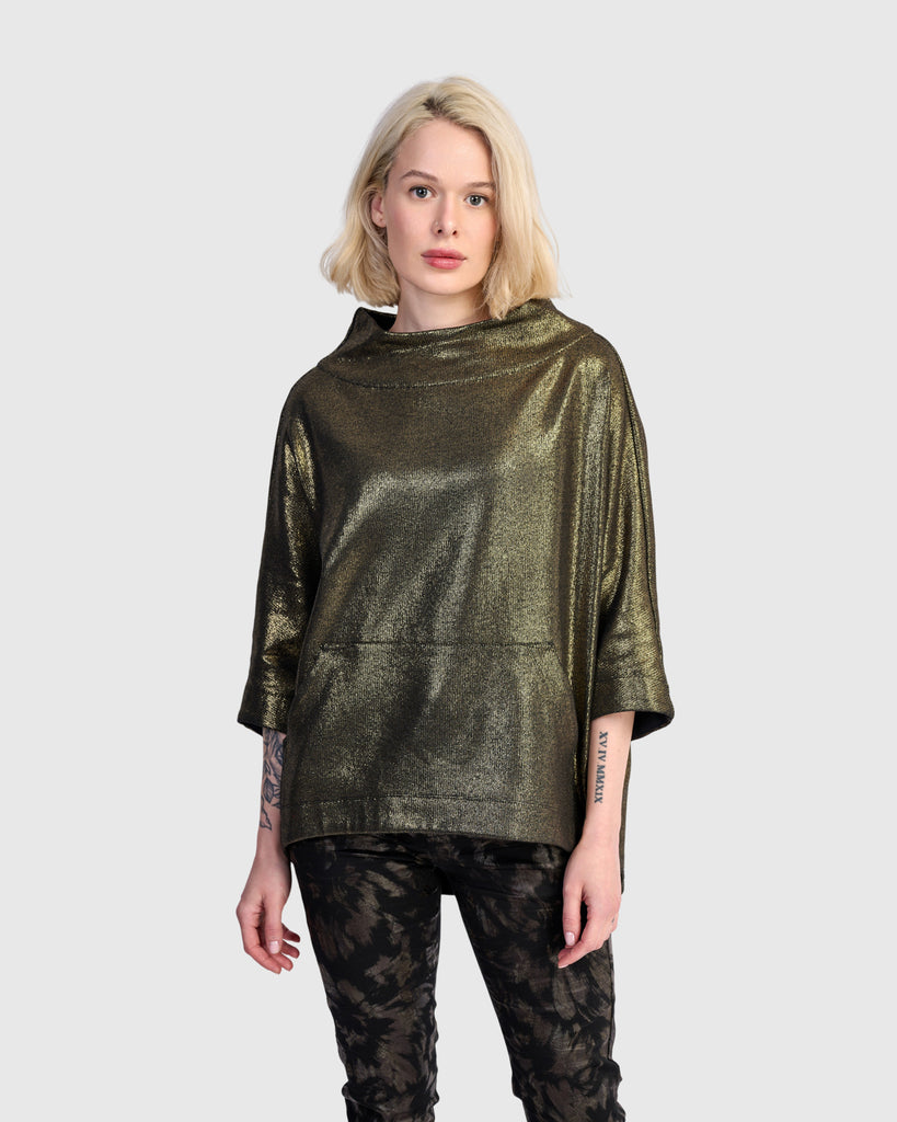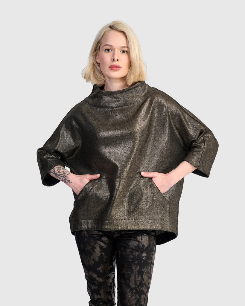 This cozy pullover adds shine to everyday style with a soft metallic knit and sculptural silhouette. A kangaroo pocket and longer back hem bring casual comfort, while the funnel neck and gold finish elevate the look. Perfect with slim pants or layered over dresses.