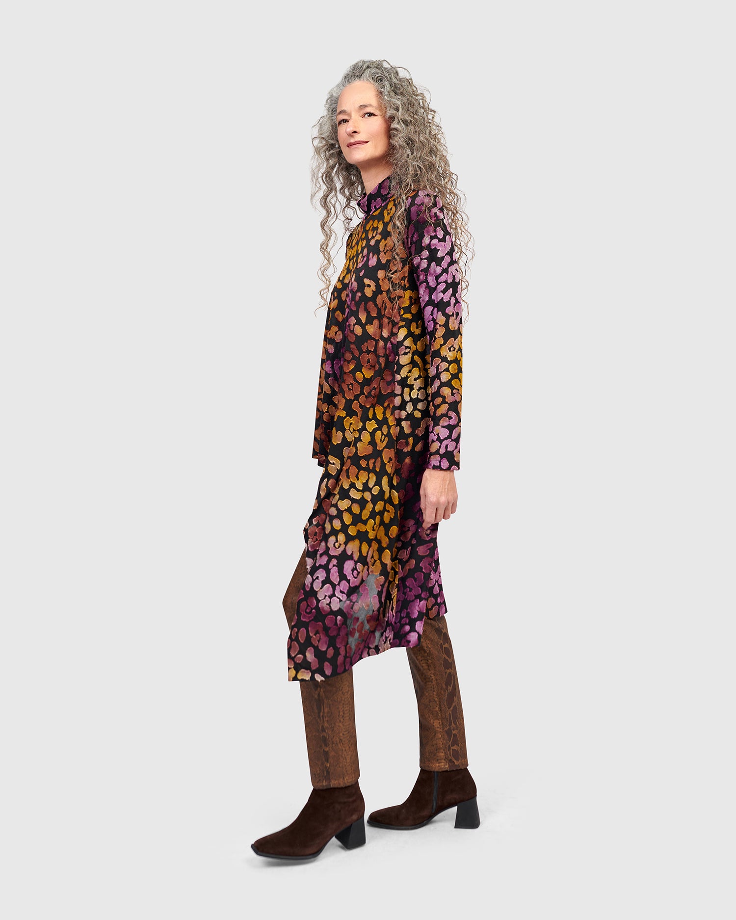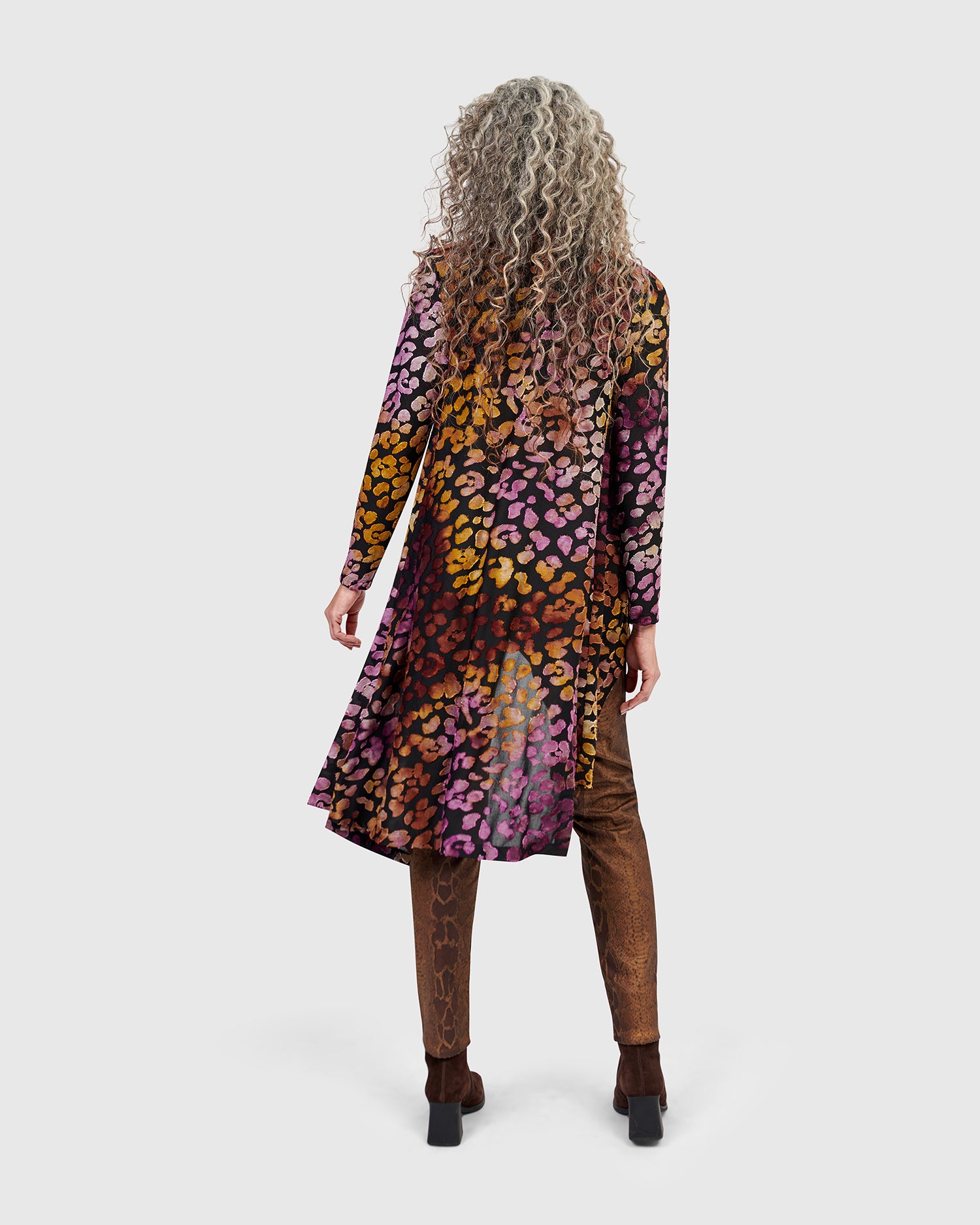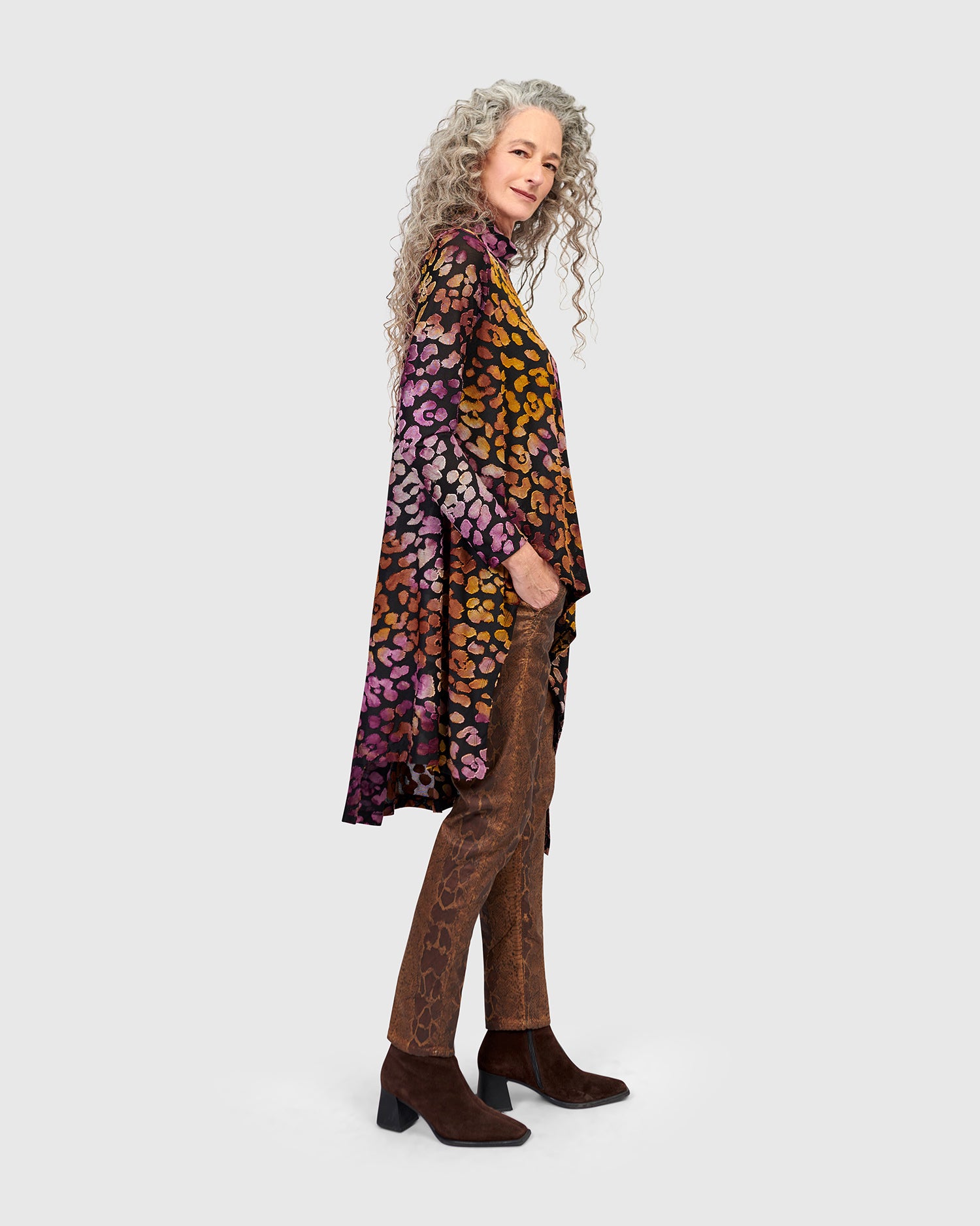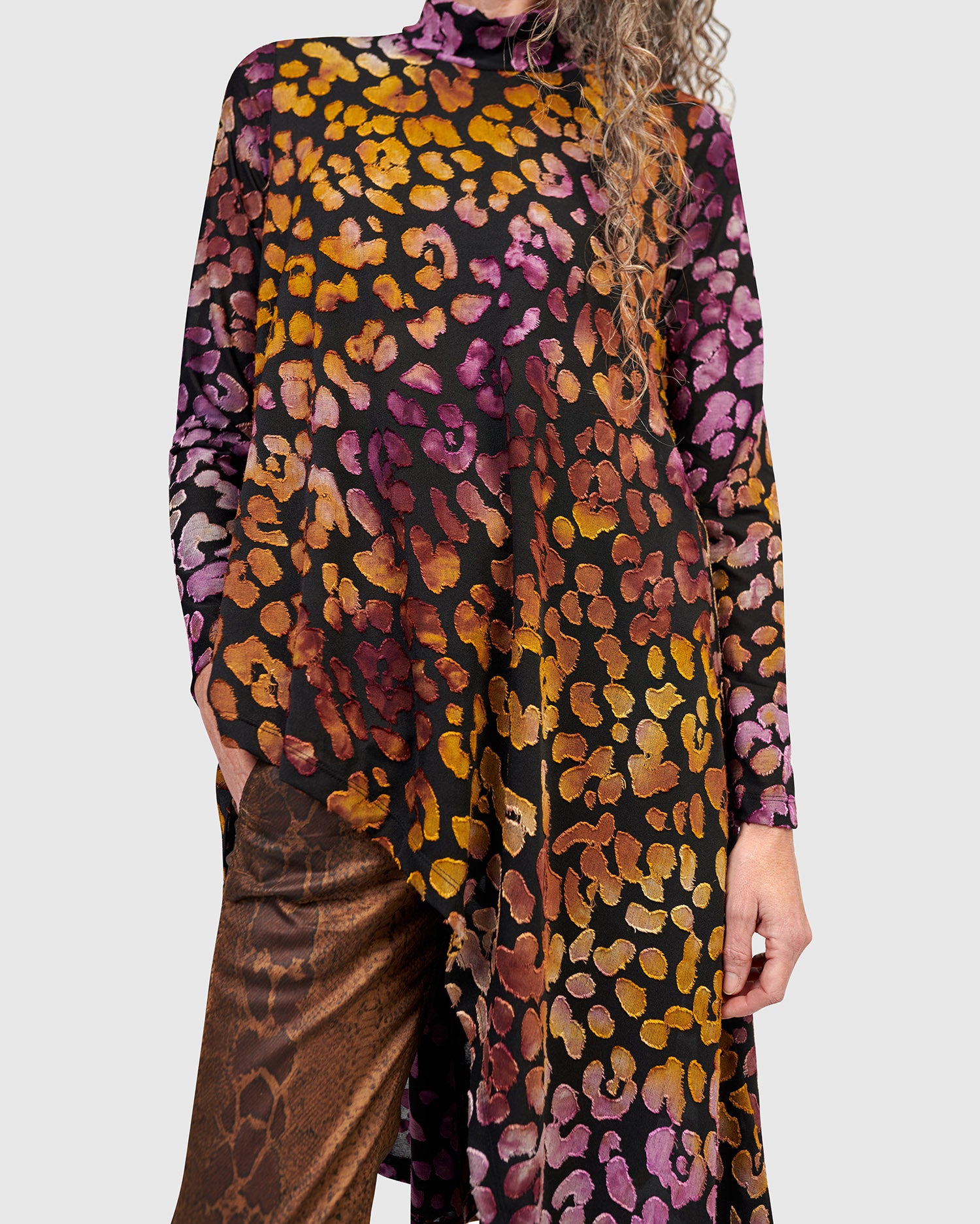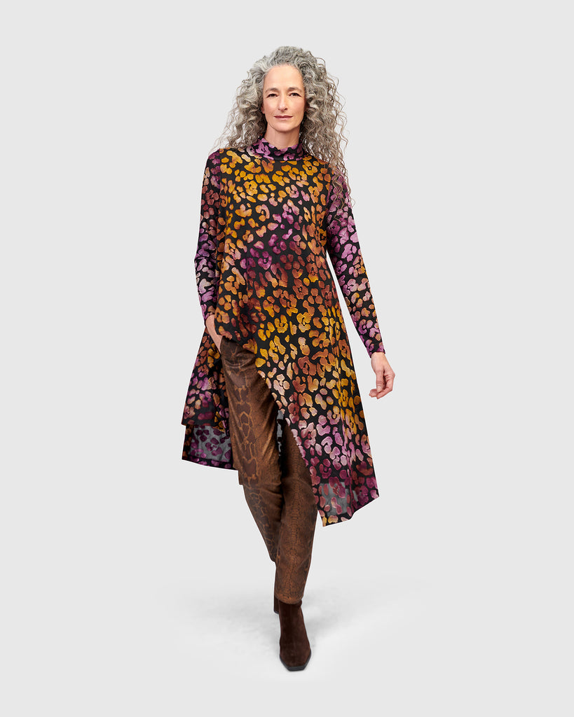 An easy A-line tunic with refined edge, this soft burnout jersey top offers lightweight coverage with natural flow. The mock neck and long sleeves add structure to the relaxed silhouette, while a cutaway high-low hem introduces dynamic movement. Finished in a painterly multicolor print, it layers effortlessly over slim pants or leggings.