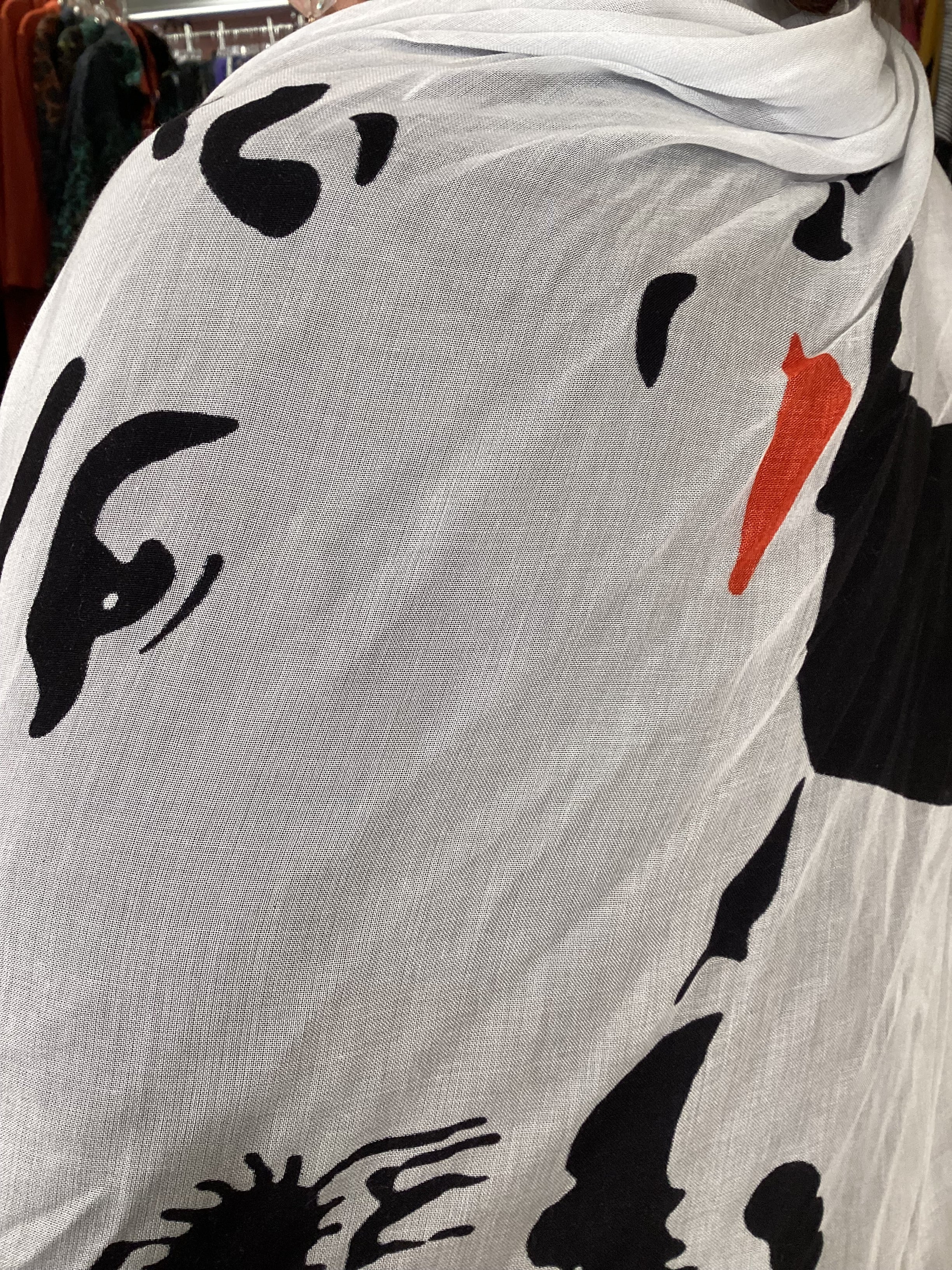 Light weight, super soft and super chic. Black and white face (red lips) printed on white silk/modal 40" x 48" scarf.