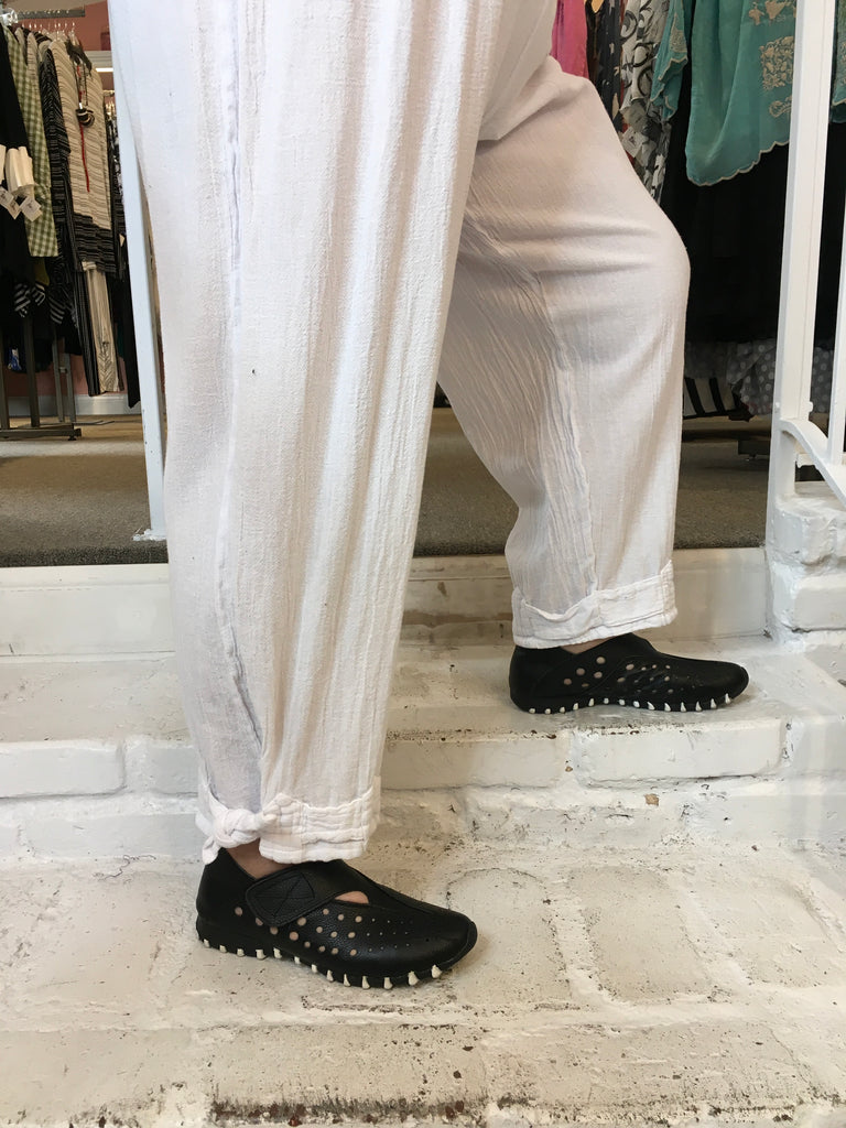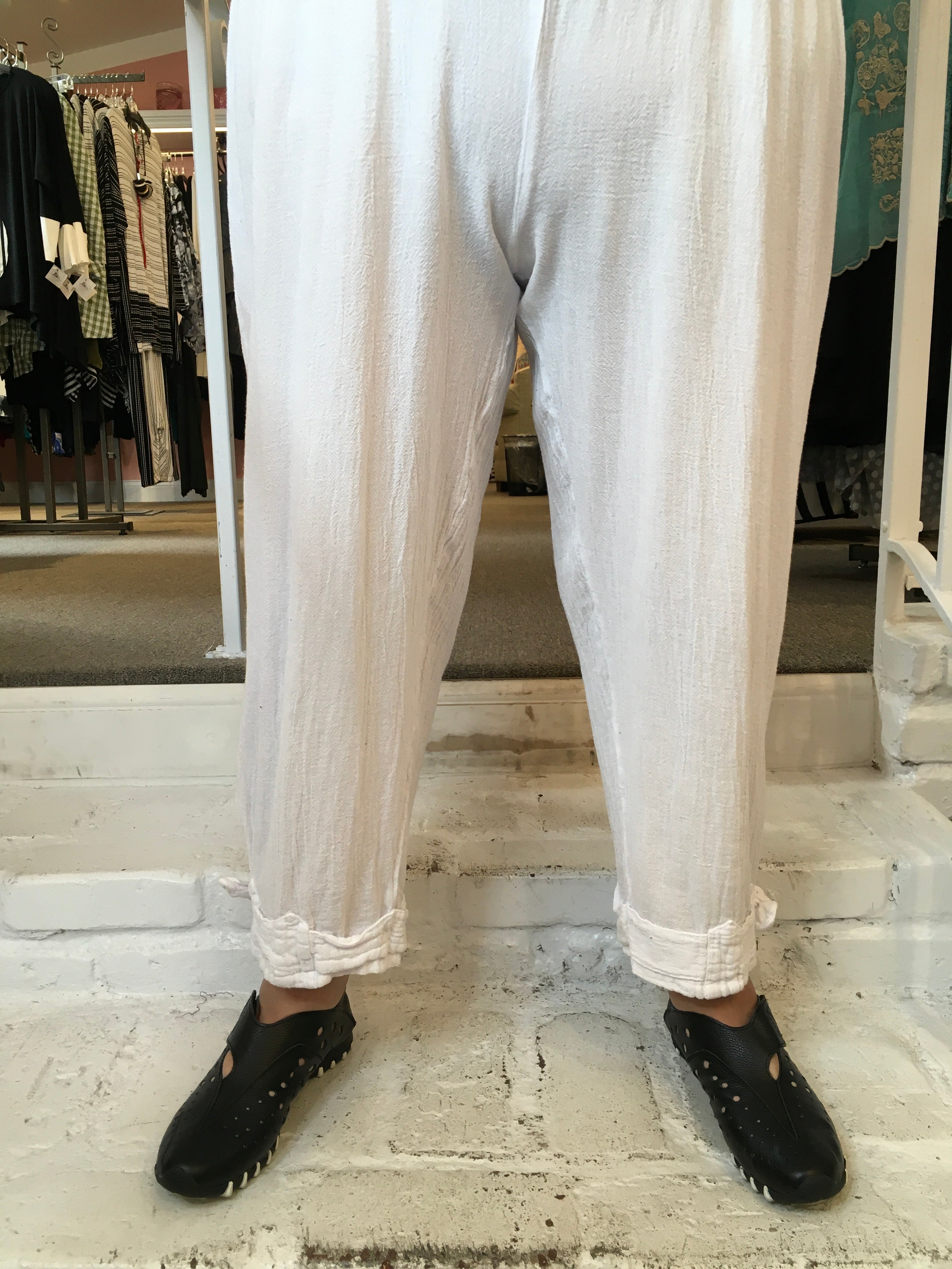 The bando pant from Oh My Gauze has become a summer staple. It is a cropped length elastic waist pant with an adjustable tie band at the hem. No pockets for a smooth look. This elastic waist pull on is a one size garment. Measurements may vary slightly on garment dyed pieces.