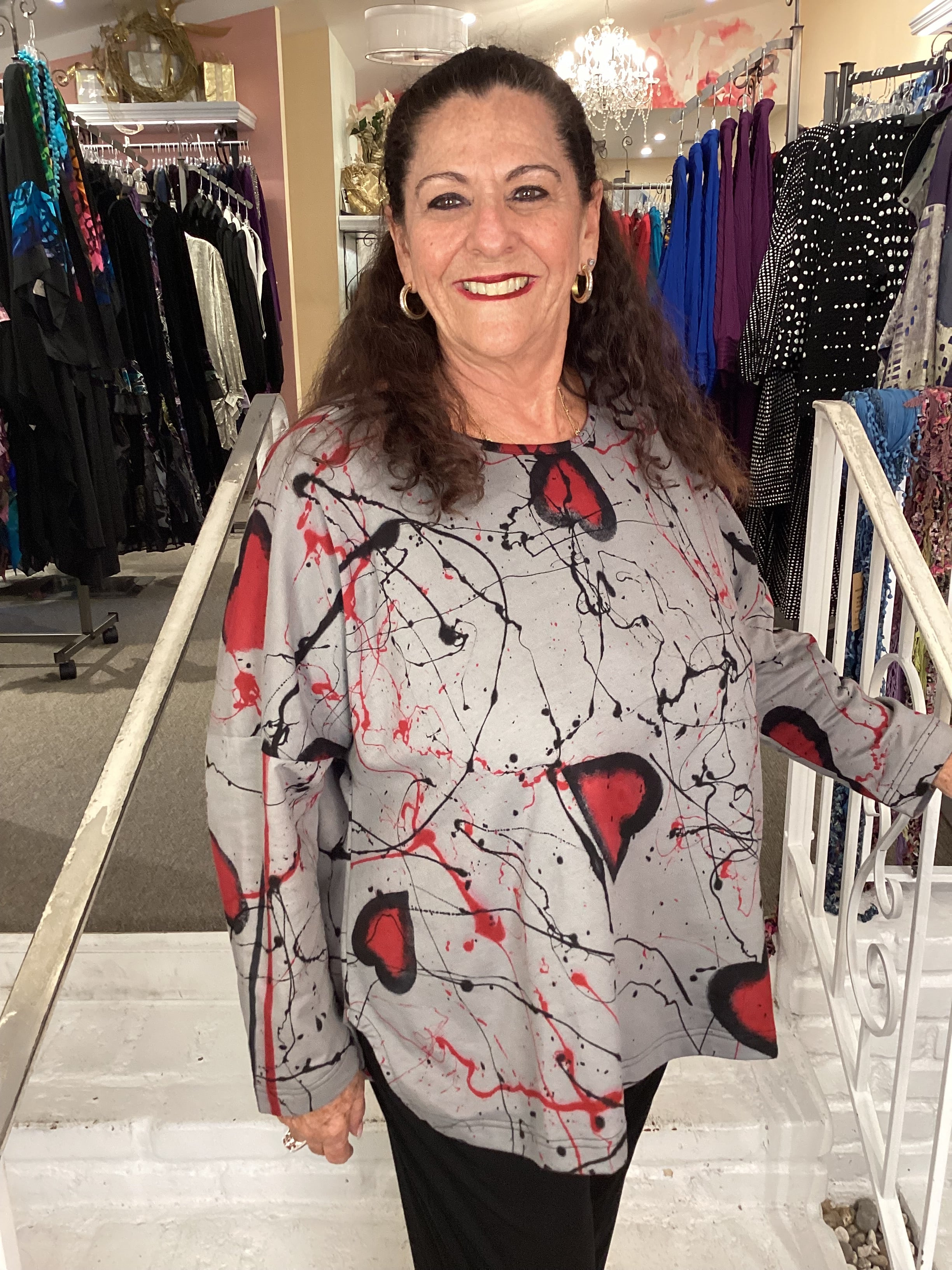 Add a pop of love to your wardrobe with BESTEE - HEARTS. This playful scoop neck top features a beautiful heart print and a relaxed fit for all-day comfort. With a hi-lo hem and side vents, it's the perfect combination of style and ease. Love never looked so good!