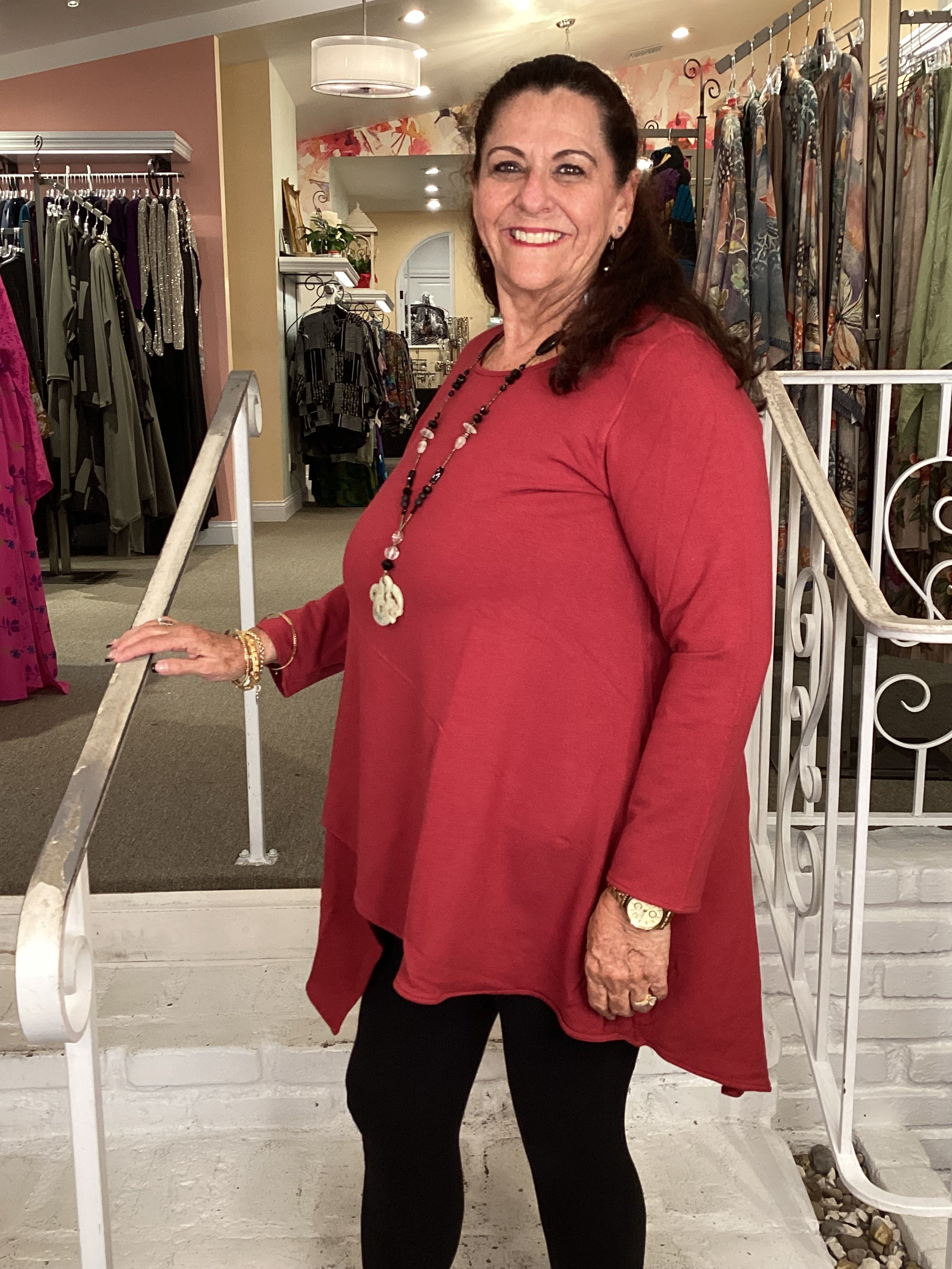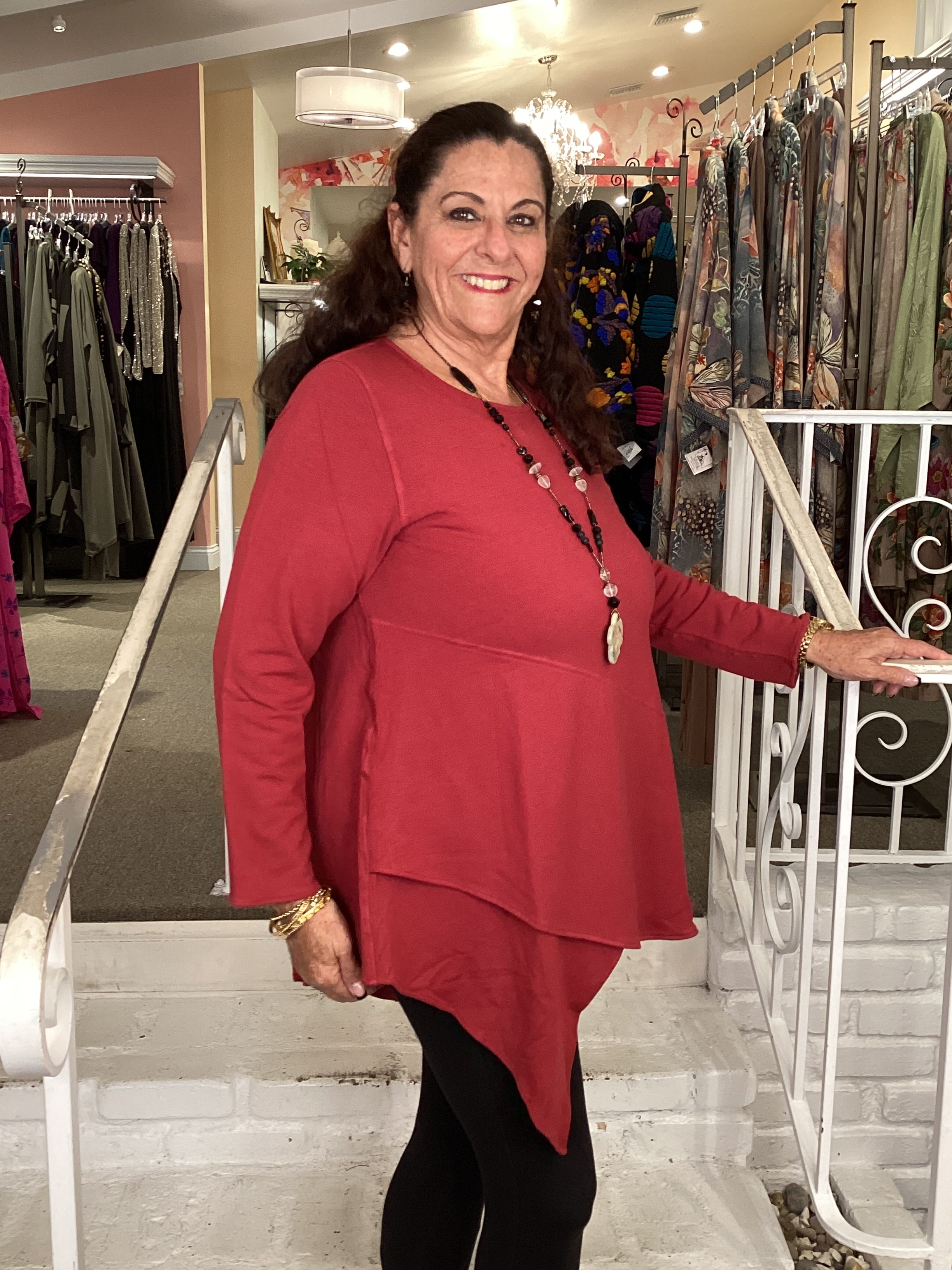 This Cheyenne comfortable, generous and unique "Art to Wear" top designed for a woman who values individuality, originality and comfort. Poly/Spandex blend, machine wash cold.