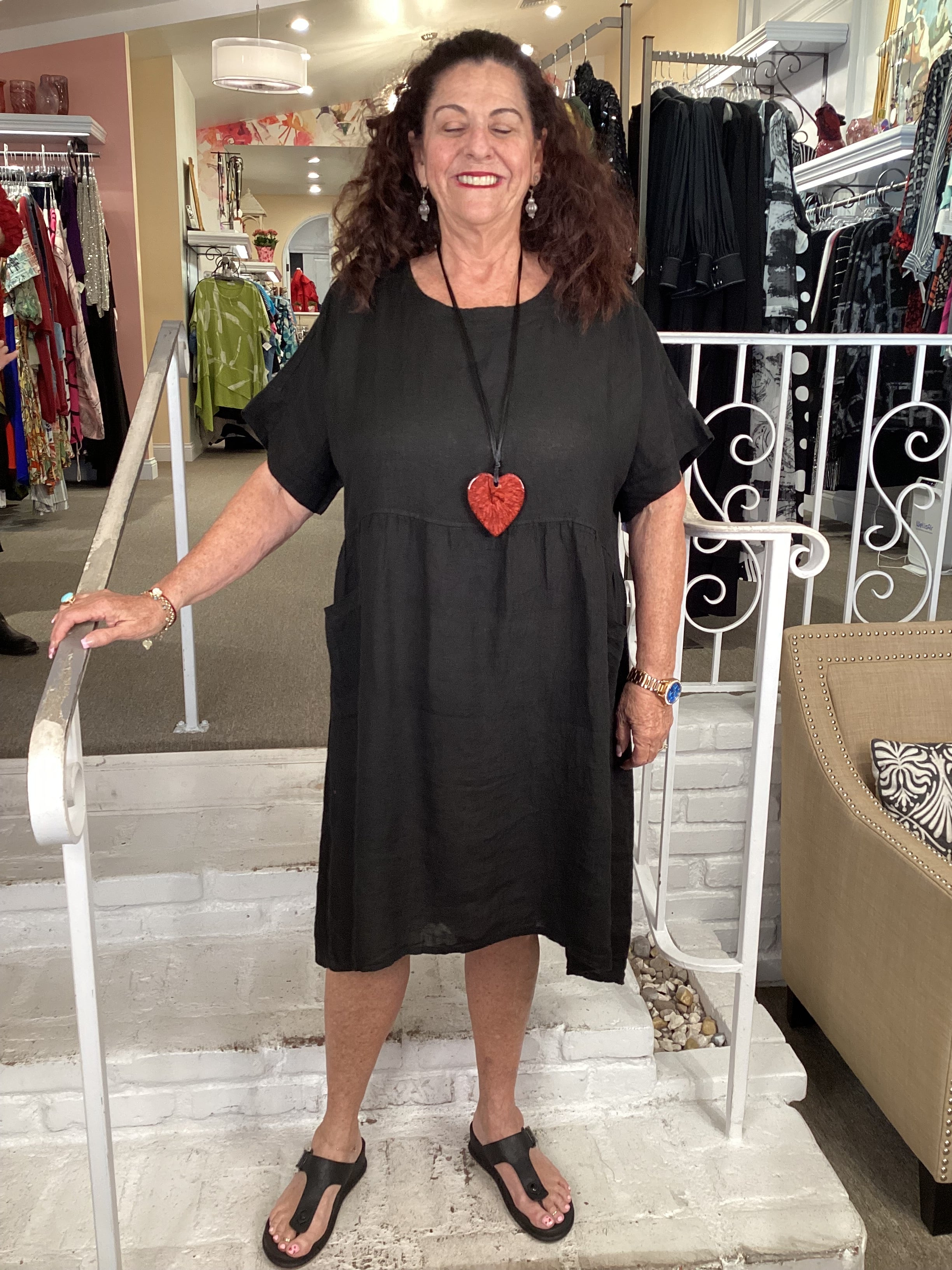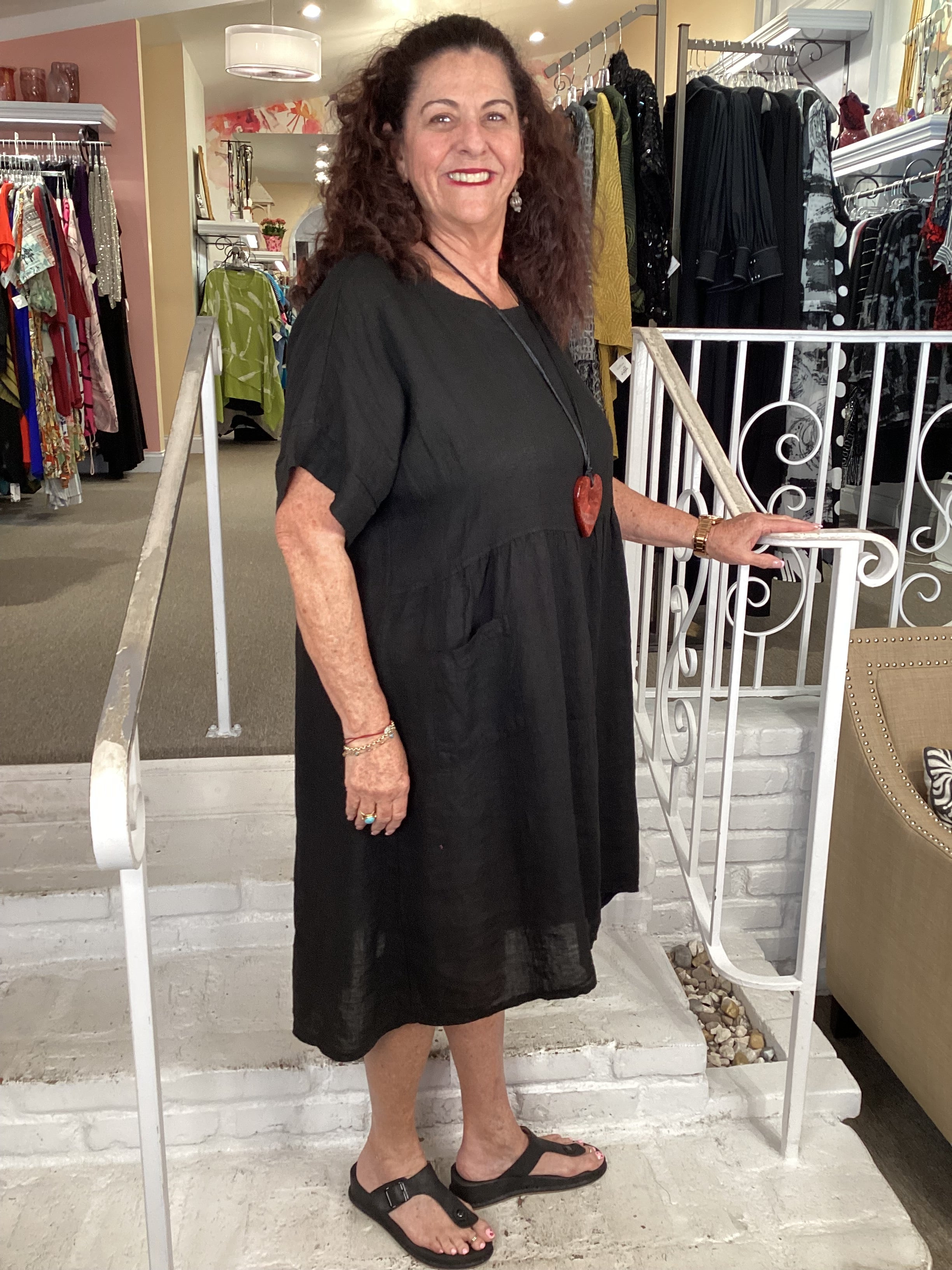 This perfect everyday linen dress is lightweight and soft linen, detailed with a faux placket on the back lined with buttons. Cap style sleeves, front ruching, double pockets in front and a high low hemline, pointed in back. The bust measures about 48", hips 52", length 40"