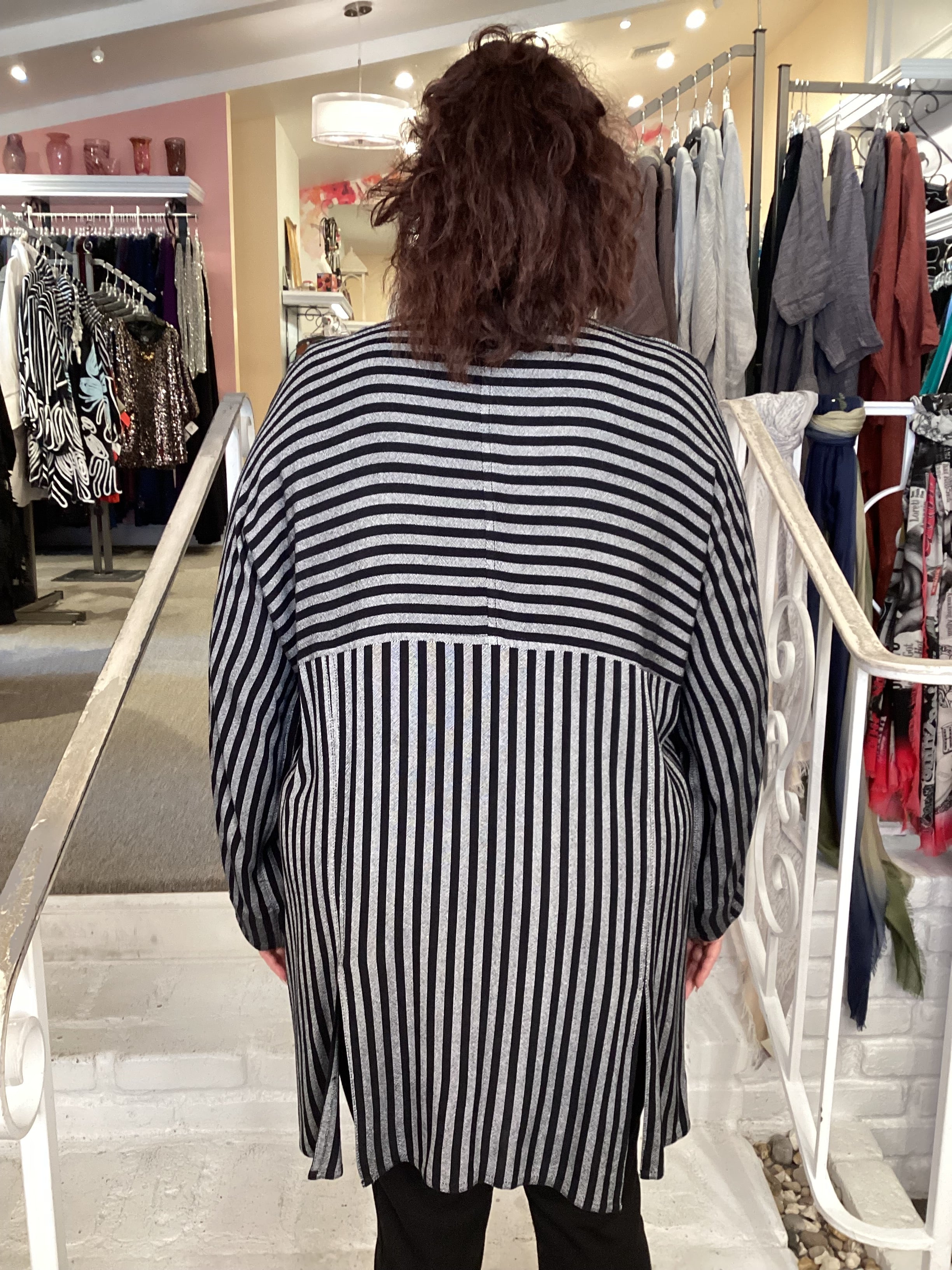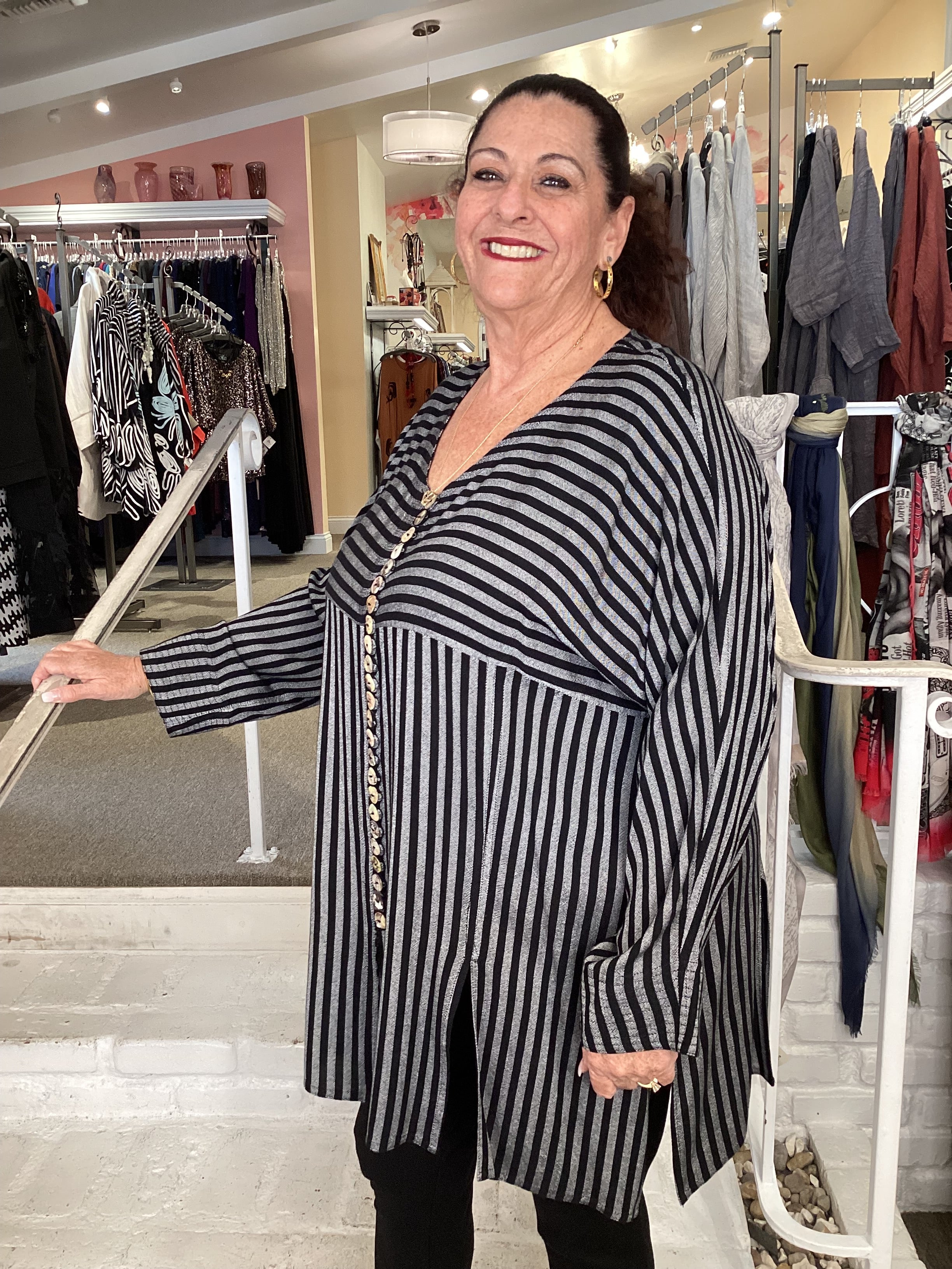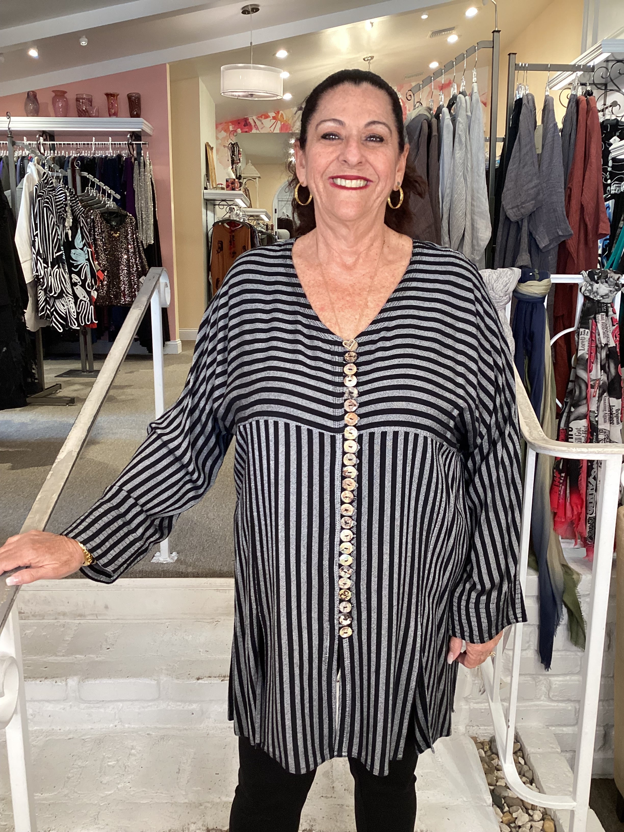 The V Button Tamri combines timeless tailoring with modern comfort. This versatile piece features a classic v-neckline and full button-front closure for easy styling. Strategic seam inserts provide subtle shaping and visual interest, while slits positioned around the hemline offer enhanced mobility and a contemporary silhouette. Perfect for layering or wearing solo, this wardrobe essential transitions effortlessly from casual to polished occasions.