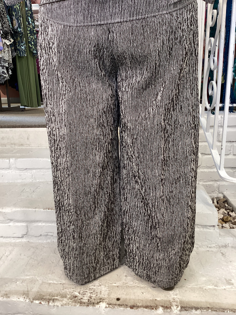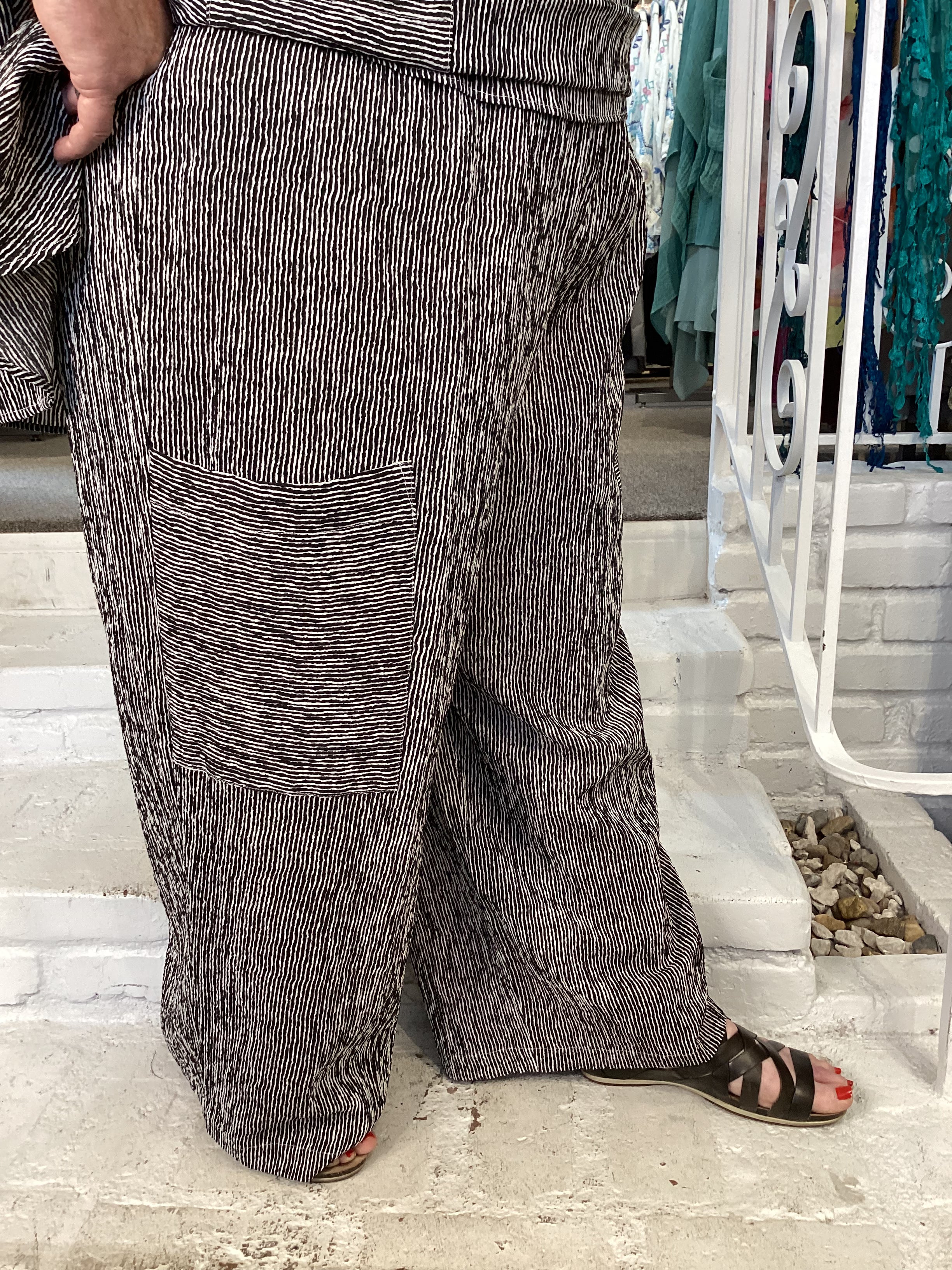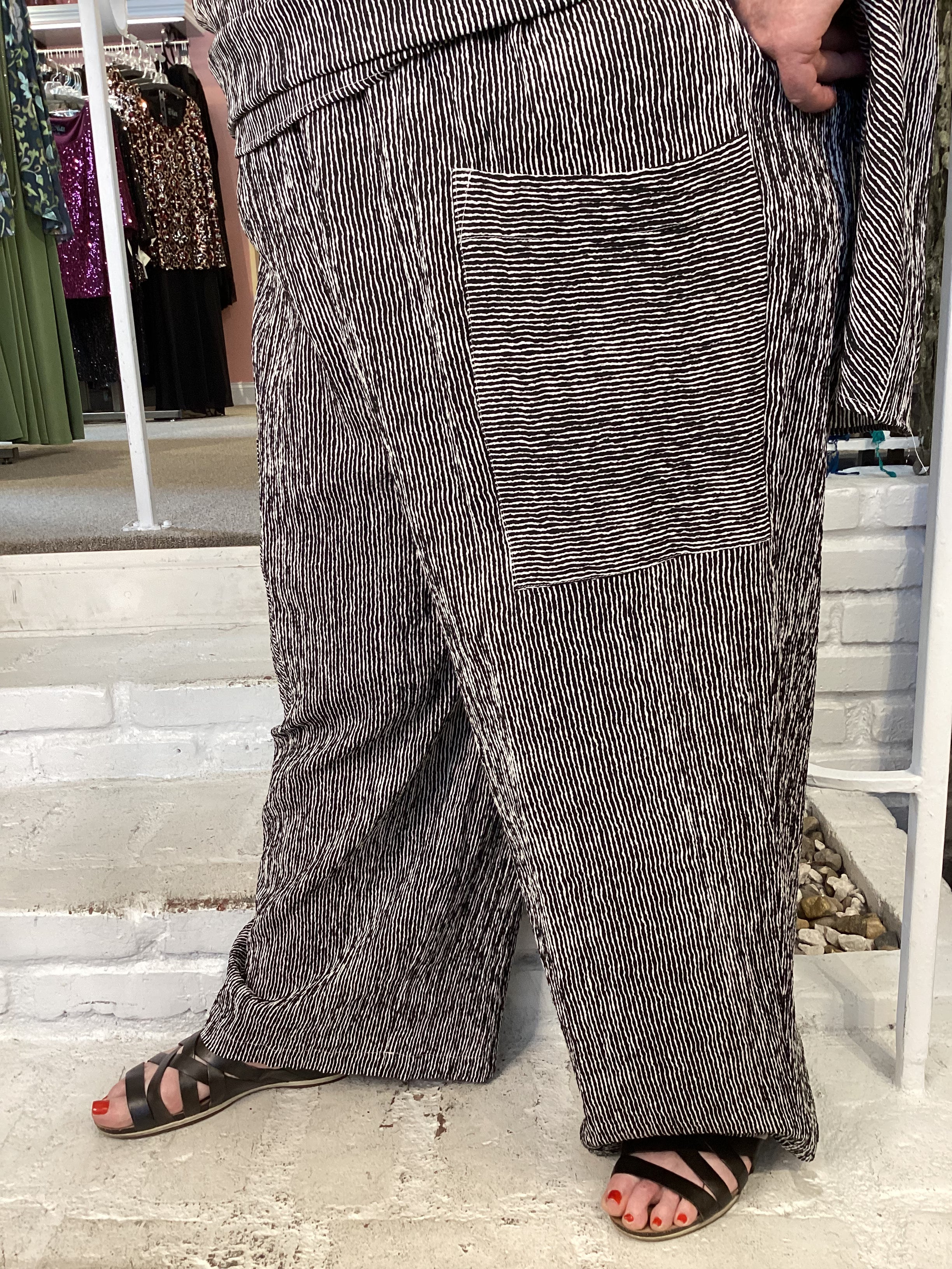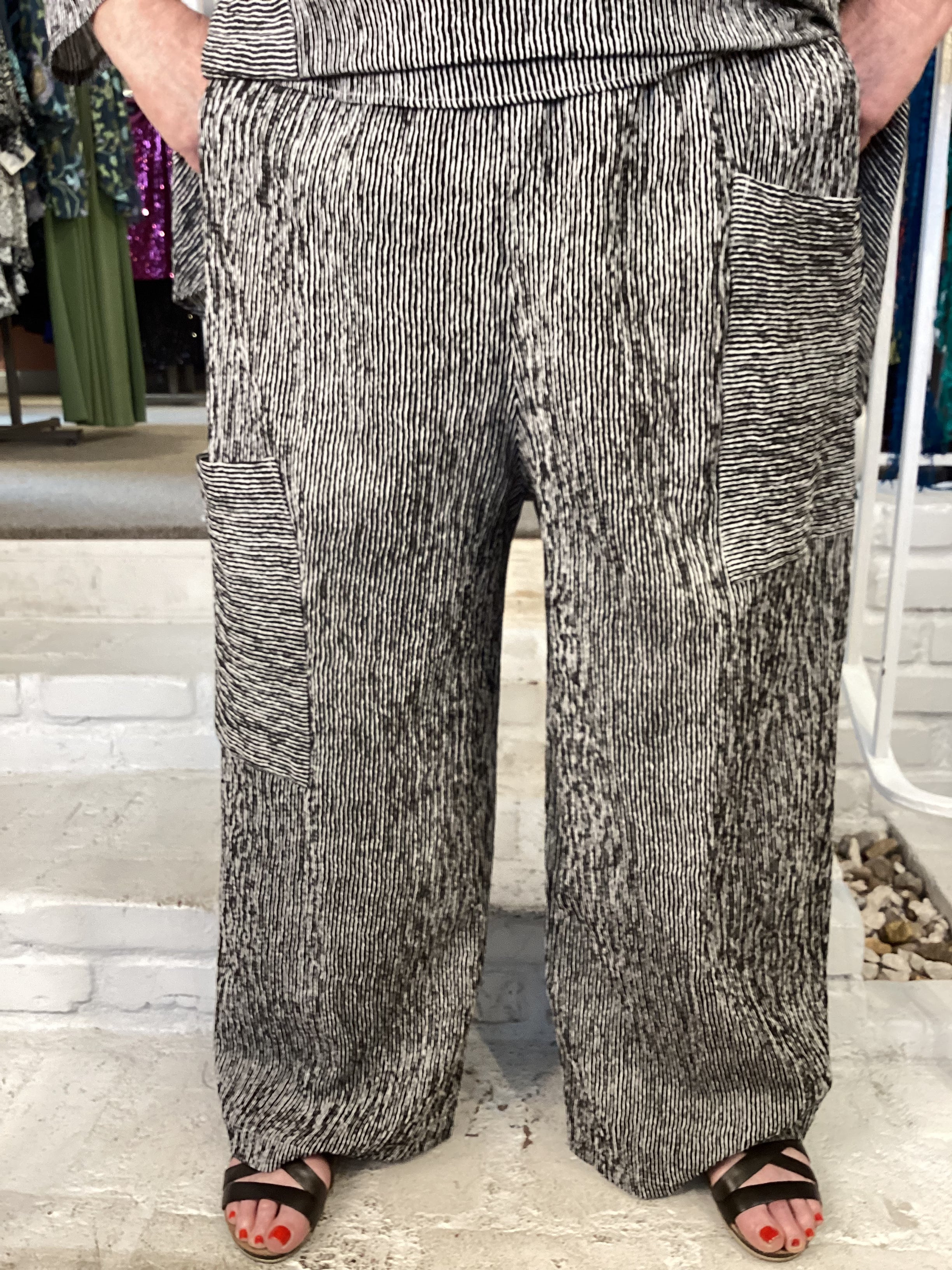 Our CARGO PANT is designed with a wide leg and an elastic waist, providing a comfortable fit for everyday wear. The loose, relaxed fit ensures you will look stylish and feel comfortable all day. Made from a strong woven fabric, it features a contrast black and white stripe  pattern.