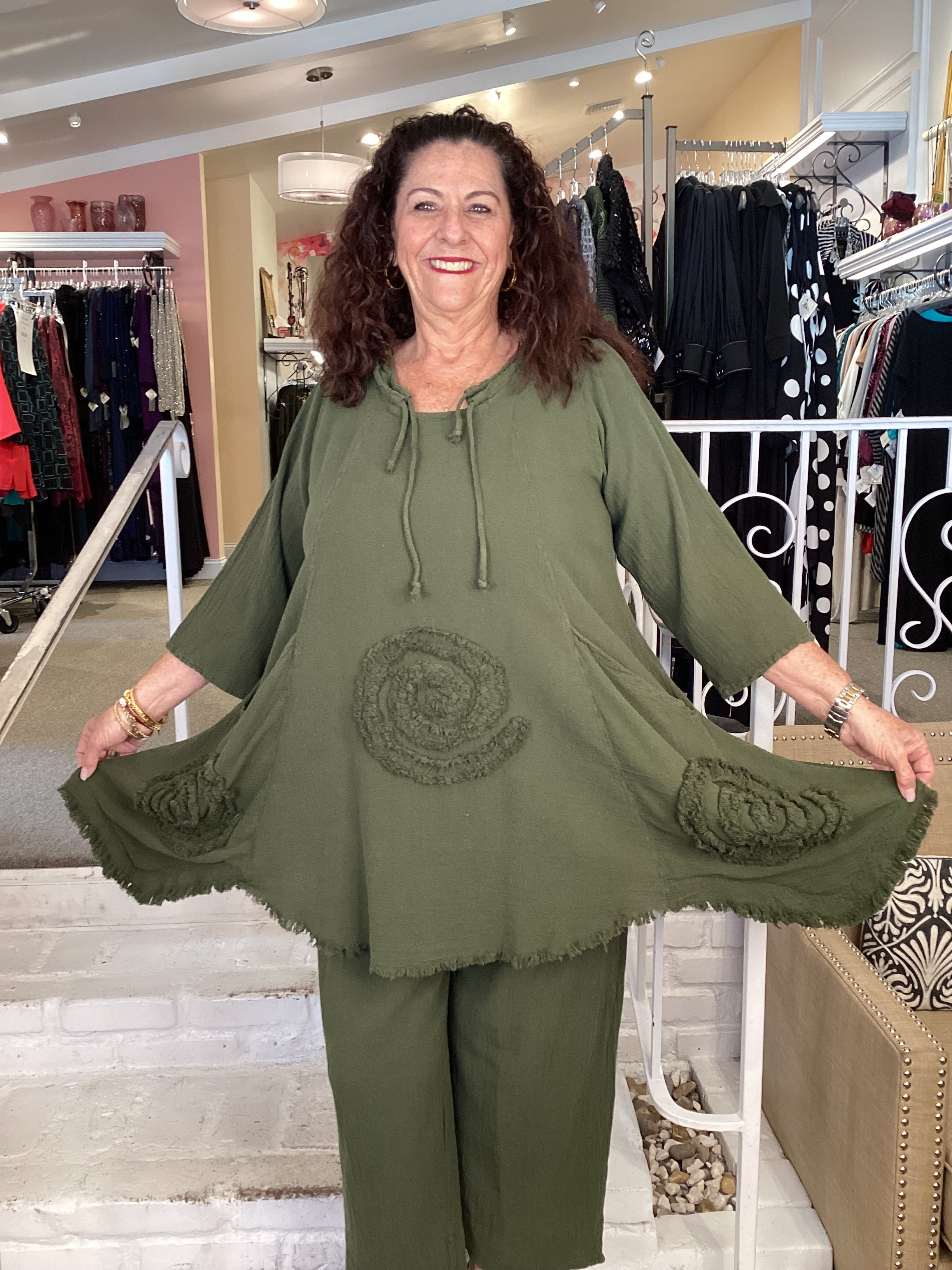 The Circle tunic from OH MY GAUZE is available in several colors. Light weight fabric and great detailing: drawstring round neckline, two deep pockets on front panels, frayed circle appliques front and back. A-line shape with 3/4 length sleeves