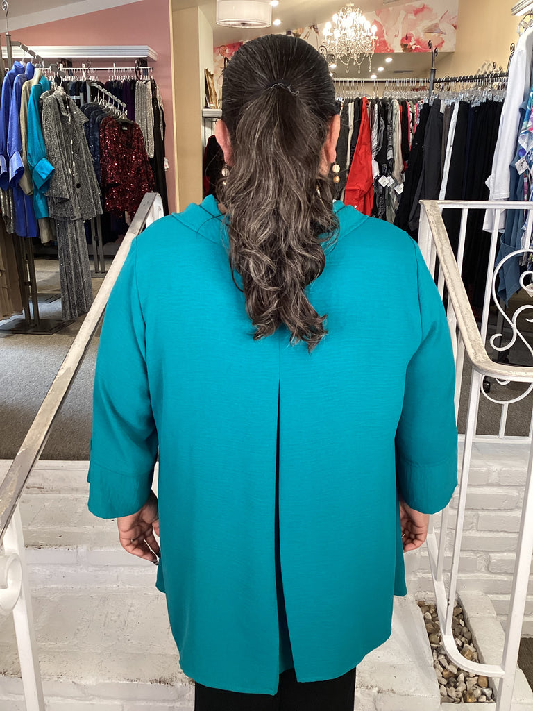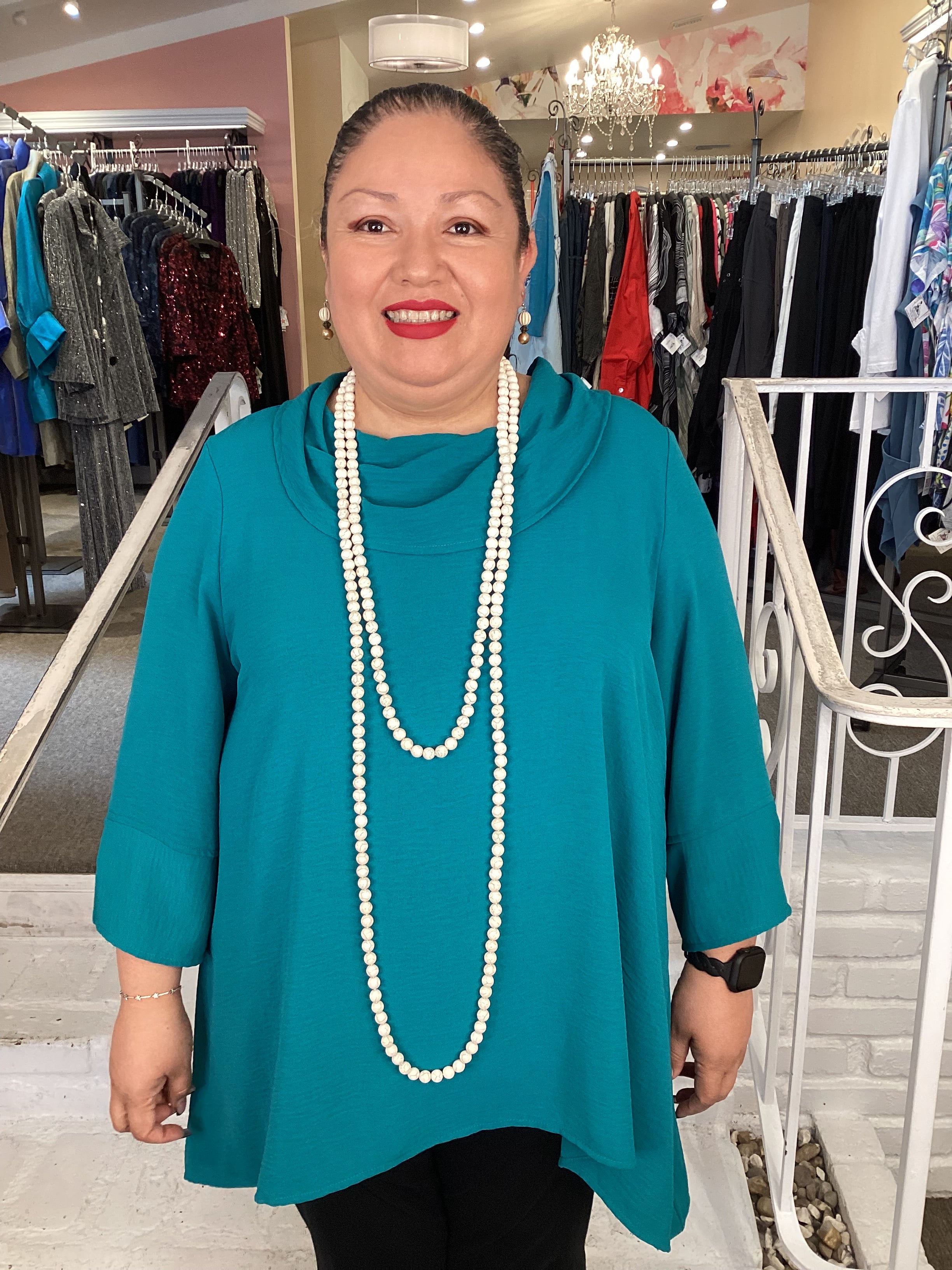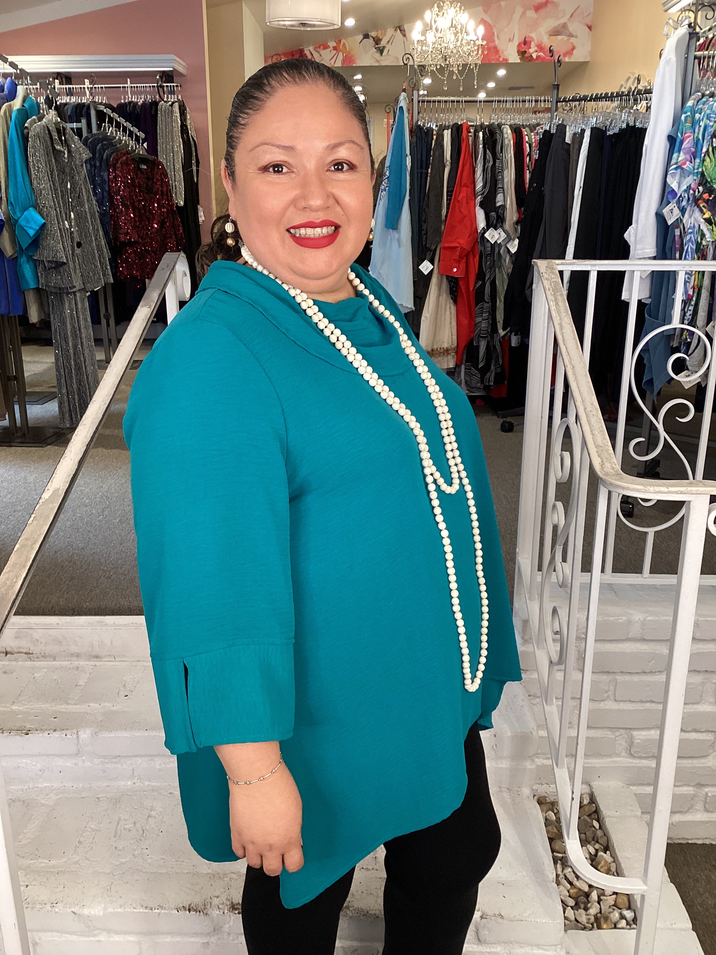 The new jade color cowlneck tunic is designed with lightweight crepe material, featuring an A-line silhouette and cuff detail. The loose cowl neck provides a stylish, flattering look while keeping you comfortable all day.