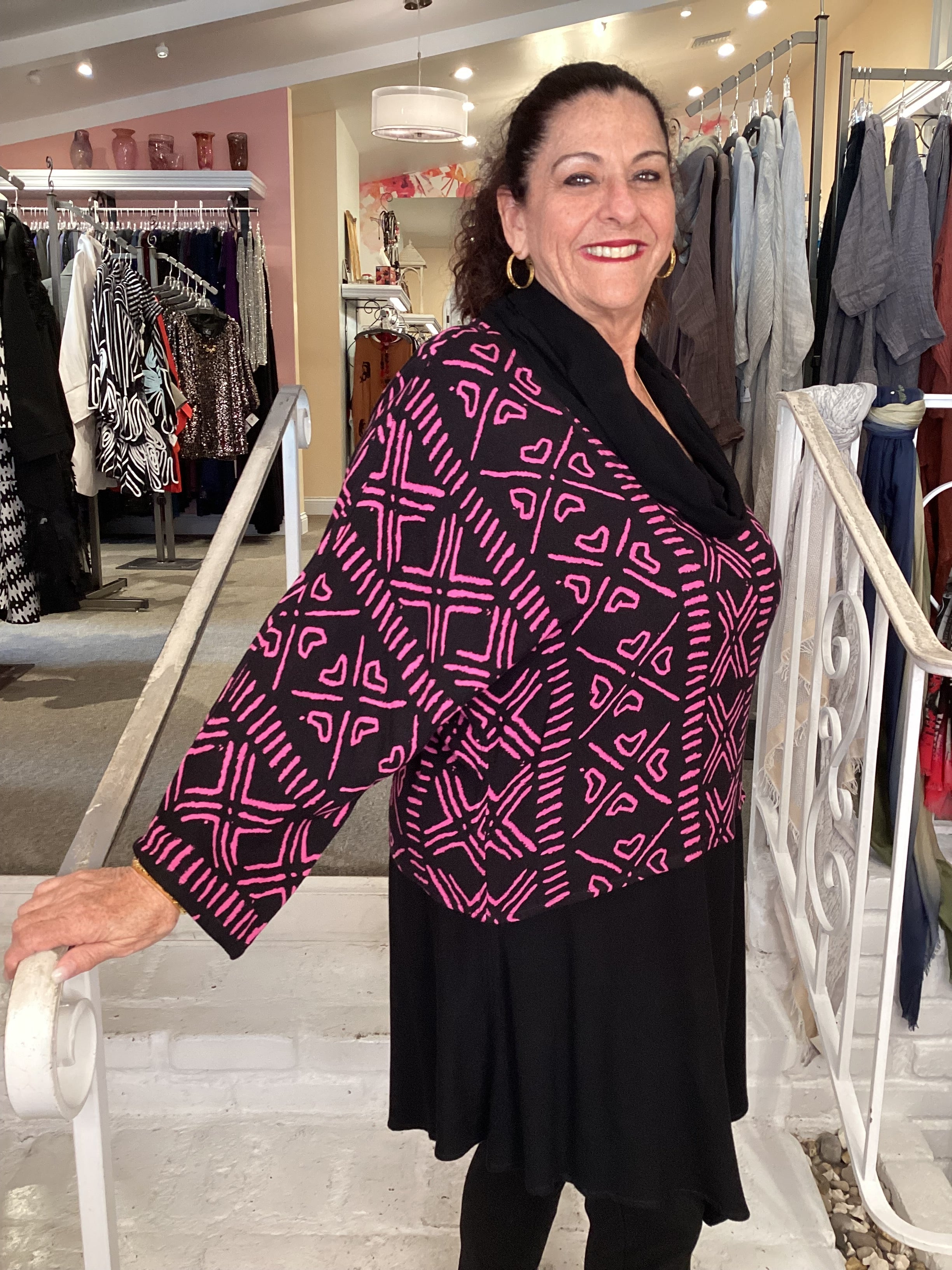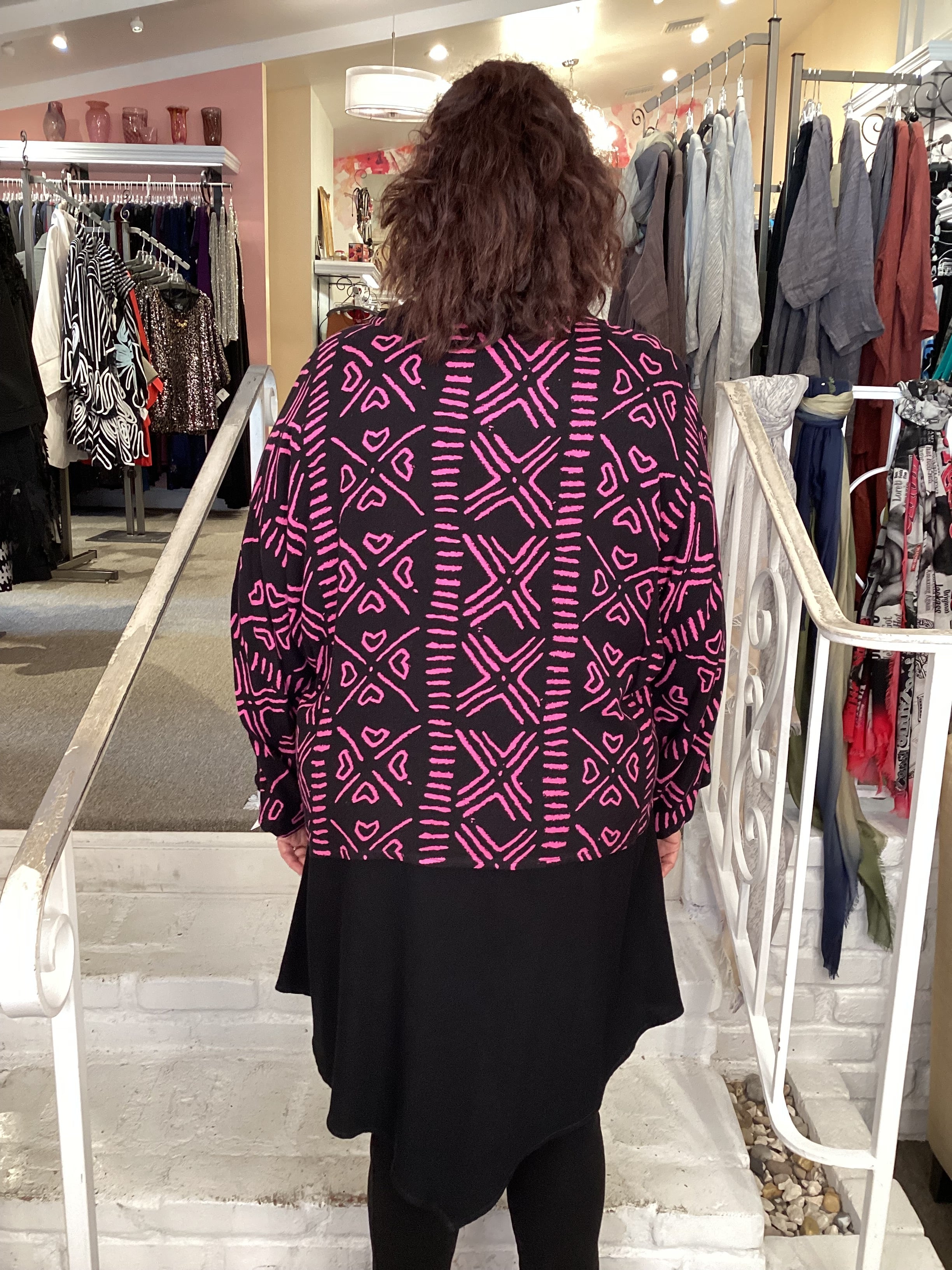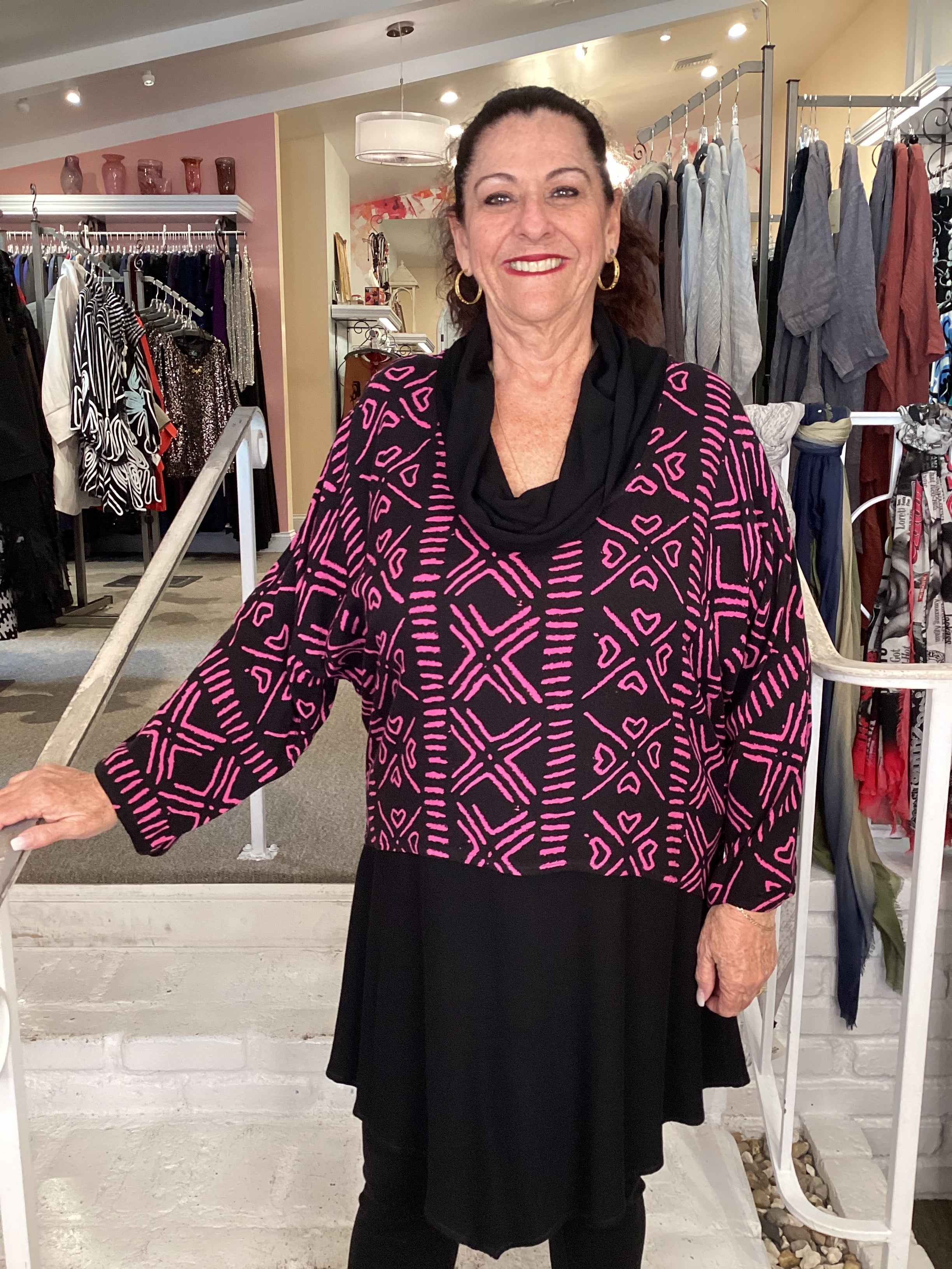 This sophisticated cowl neck top combines contemporary design with versatile styling. The draped neckline creates an elegant silhouette, while the distinctive V hemline adds modern dimension to your everyday look. Available in multiple colorways and prints, including this striking fuchsia option, this piece seamlessly transitions from casual to polished occasions. A wardrobe essential that delivers both style and wearability.