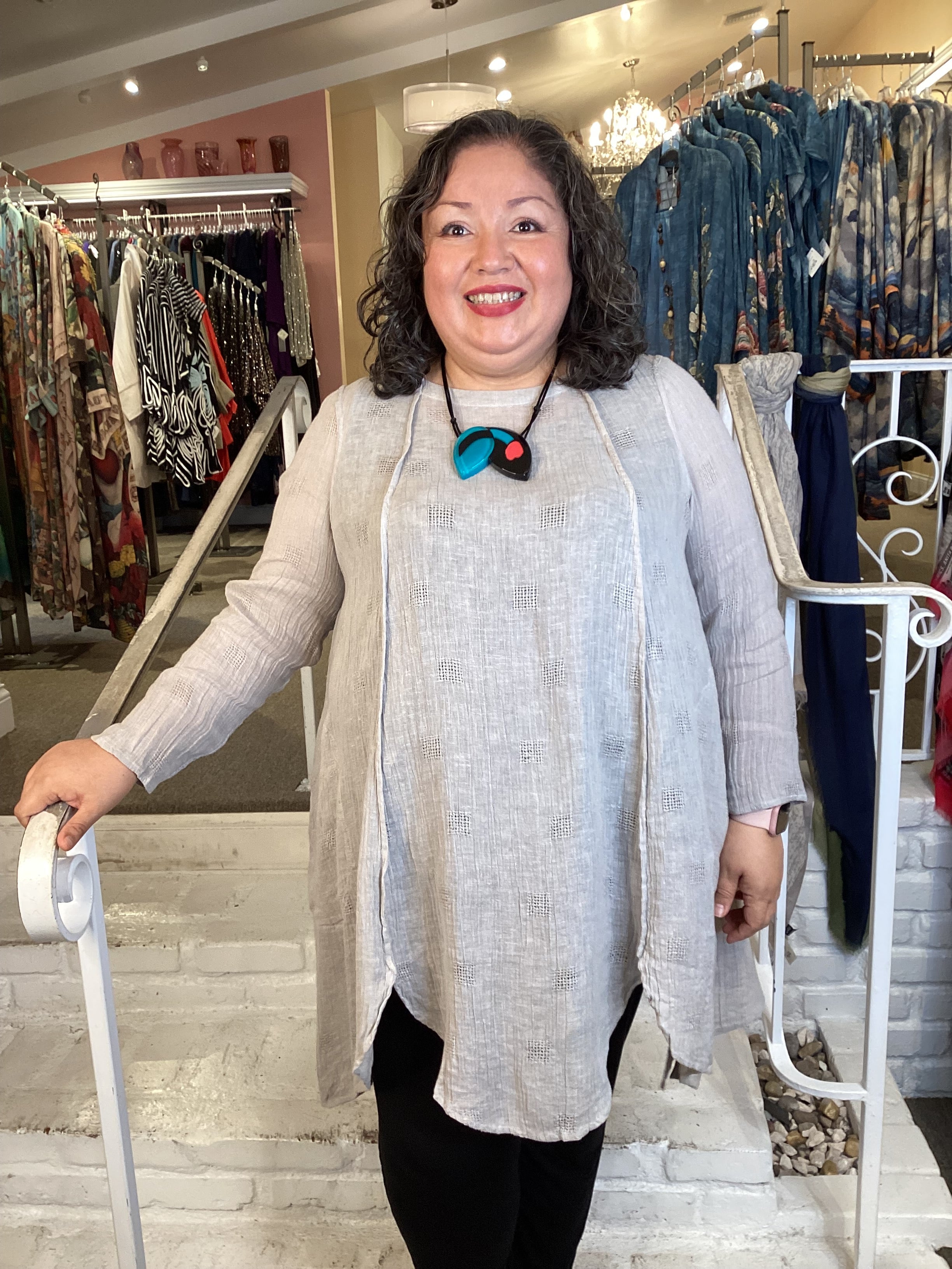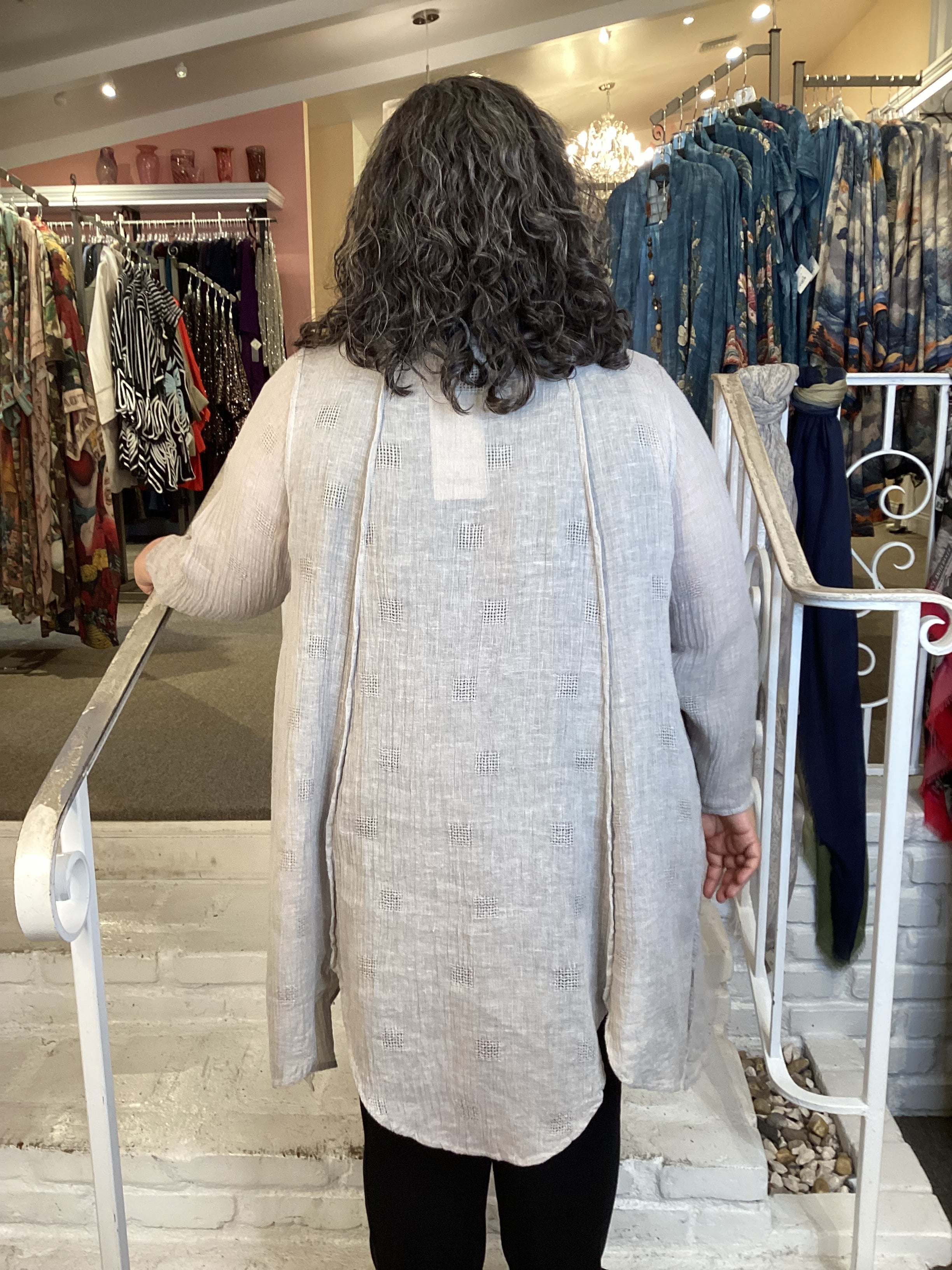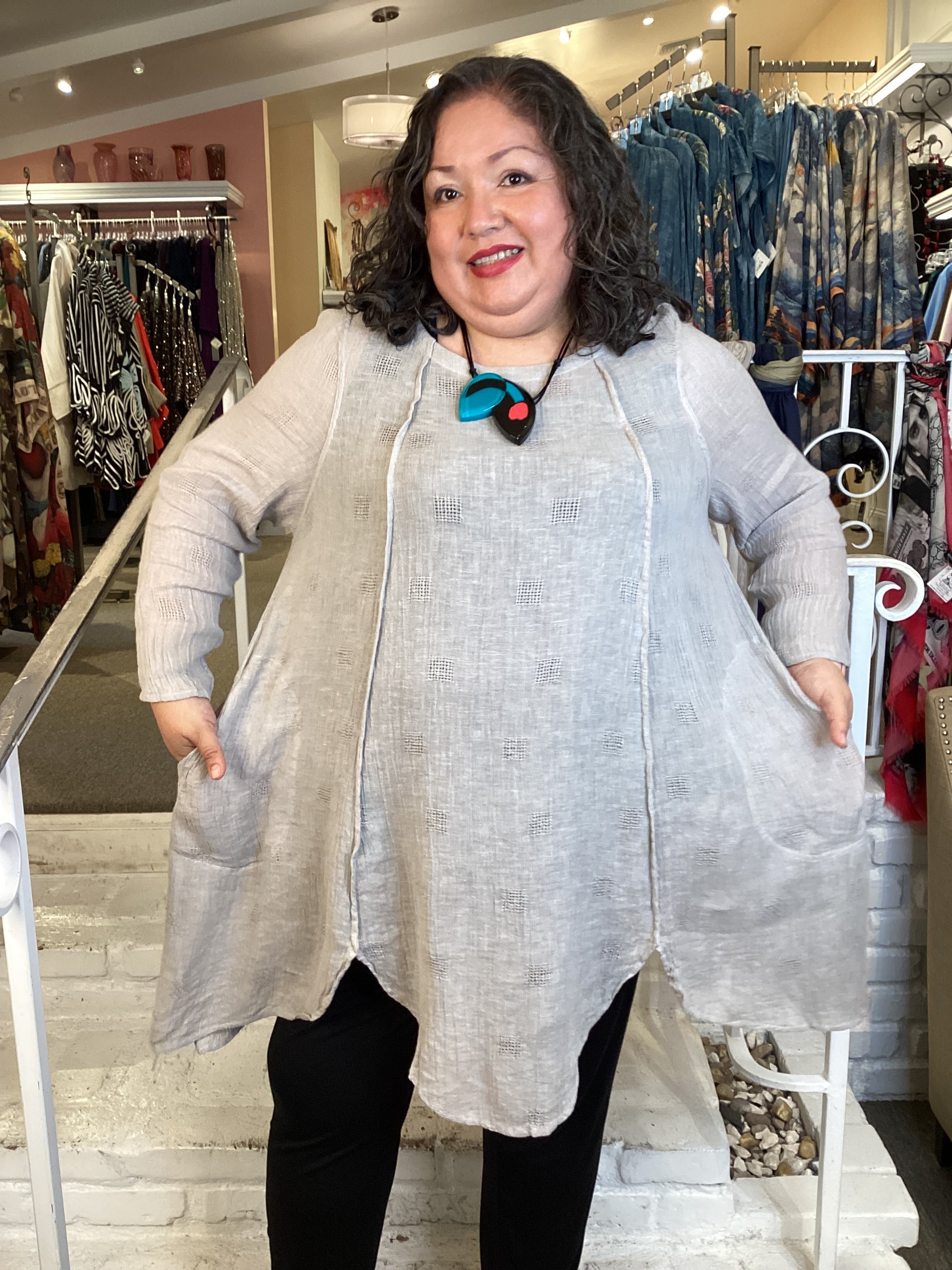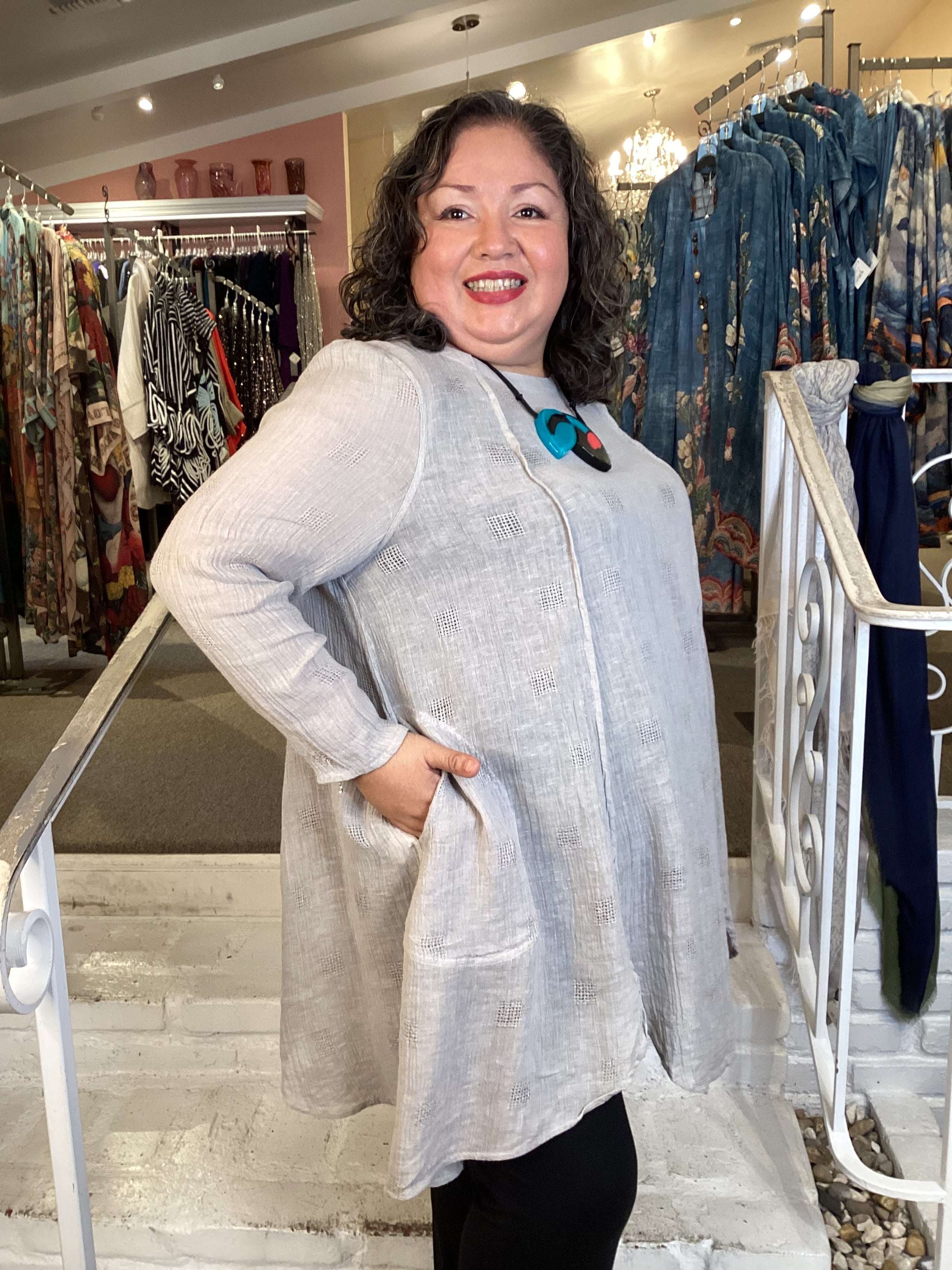 This lightweight tunic features a graceful A-line silhouette designed to flatter and move with you. Crafted from crinkle gauze linen with subtle woven texture, the fabric drapes beautifully while remaining breathable and comfortable. The scalloped hemline adds refined detail, while the generous hip fit ensures ease of movement and all-day wearability. Perfect for warm weather styling.