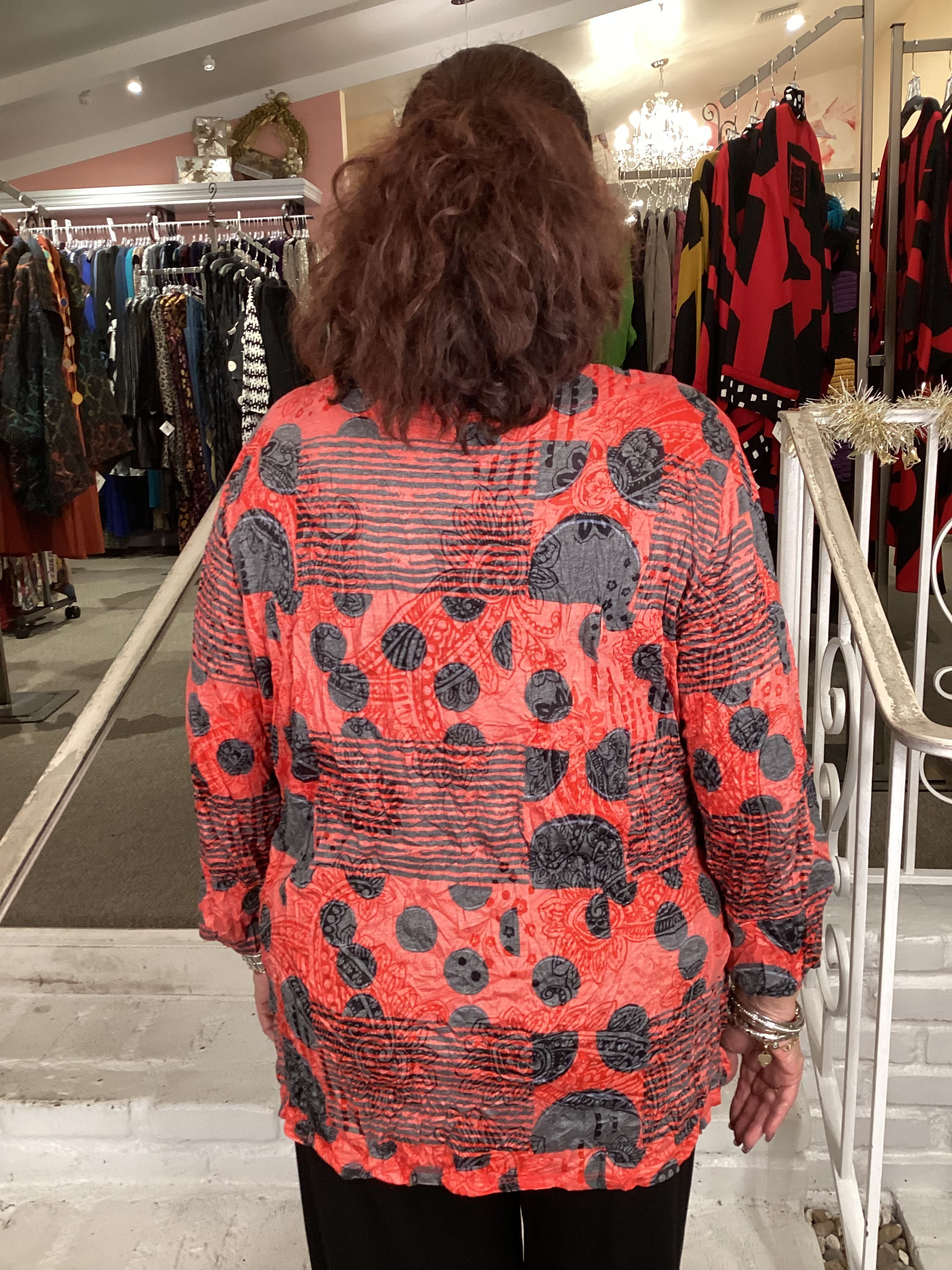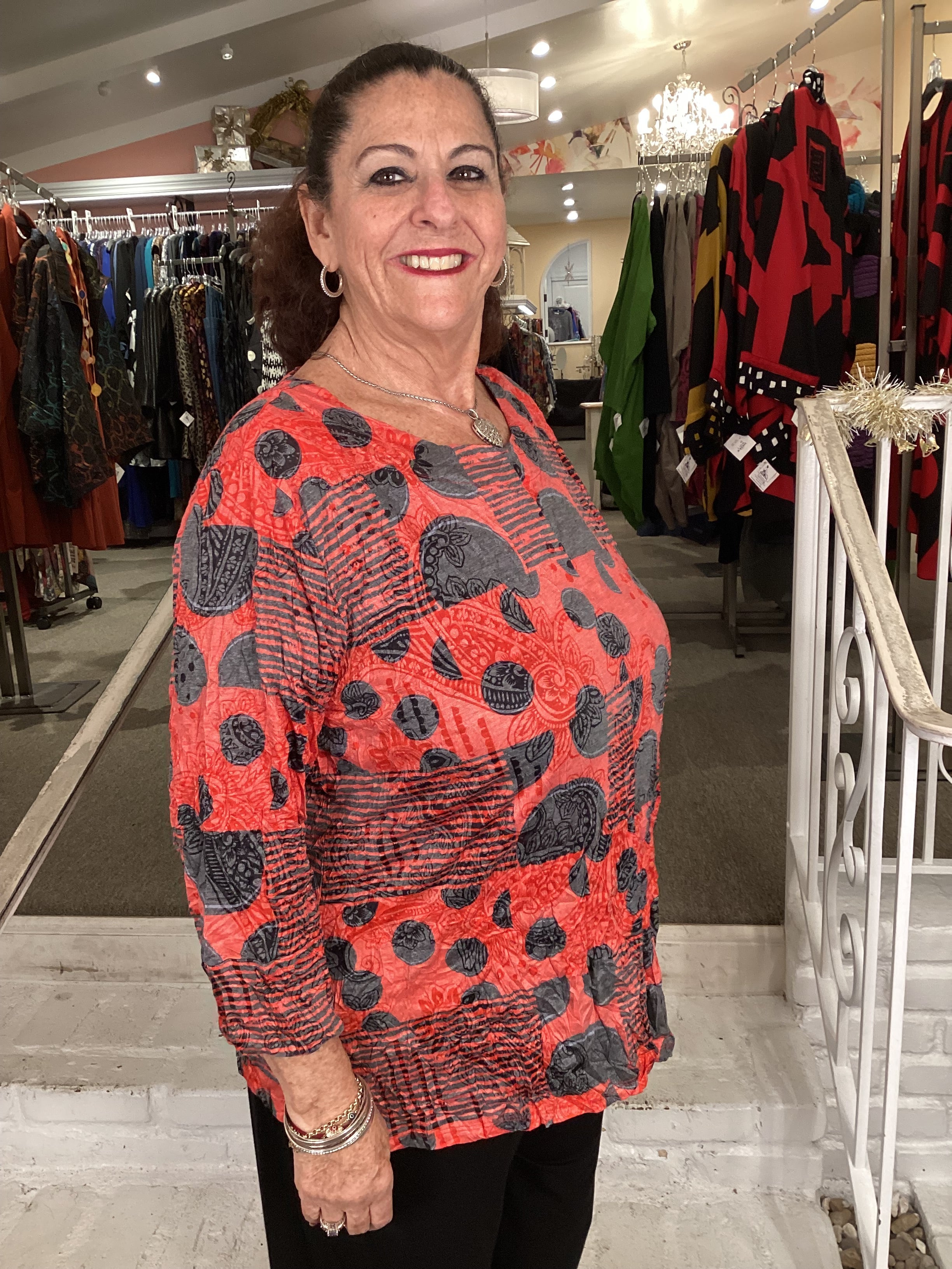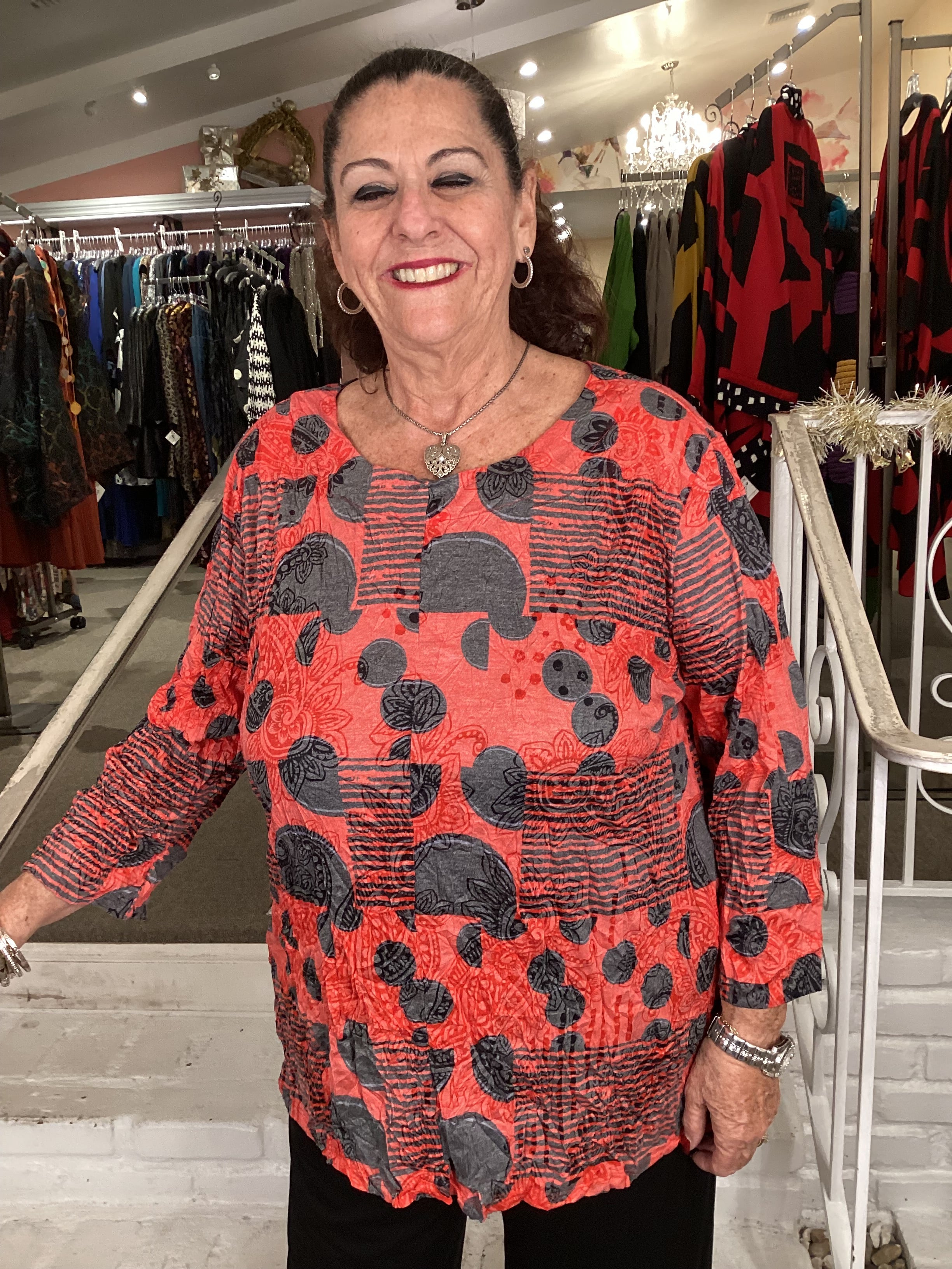 Grey multi prints on Shana's famous crinkle stretch knit.  Oval neckline and Bracelet length sleeves with a straight silhouette.