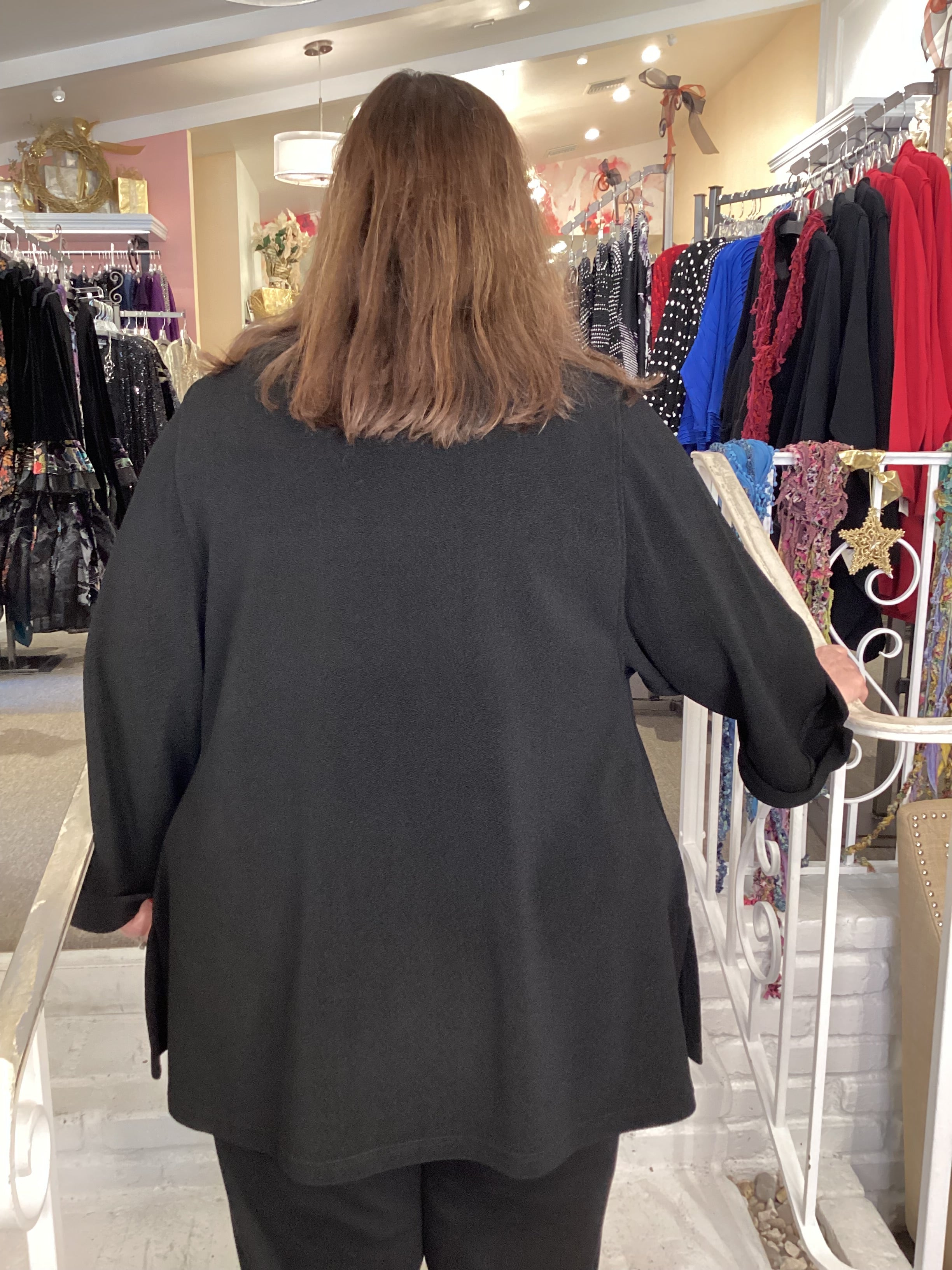 Elevate your wardrobe with our stunning BLACK CROSSOVER BOUCLE JKT. This chic jacket showcases a distinctive button-detailed cuff sleeve and a prominent front button for a touch of sophistication. Stay classy and make a statement with our hi-lo hem design.