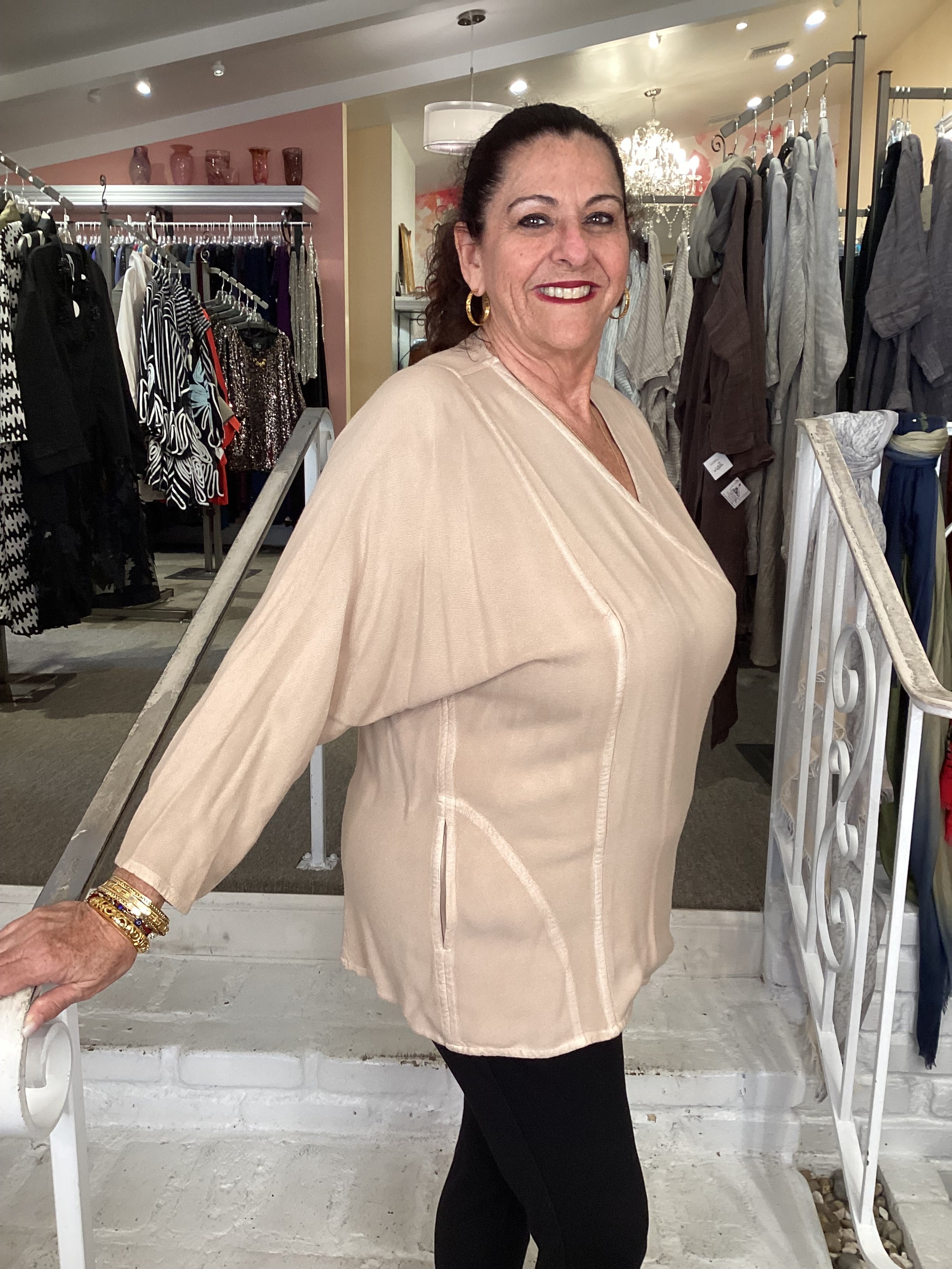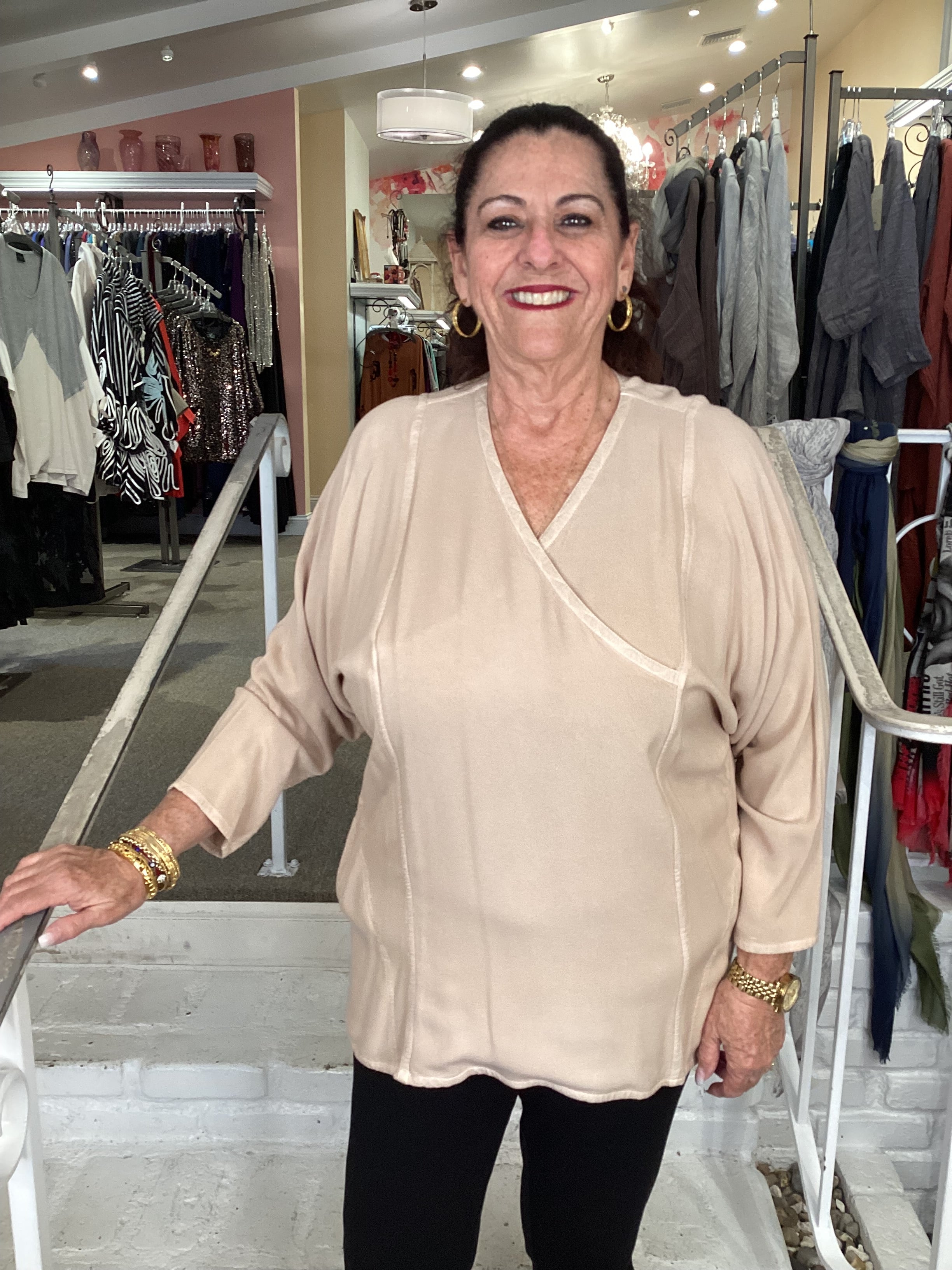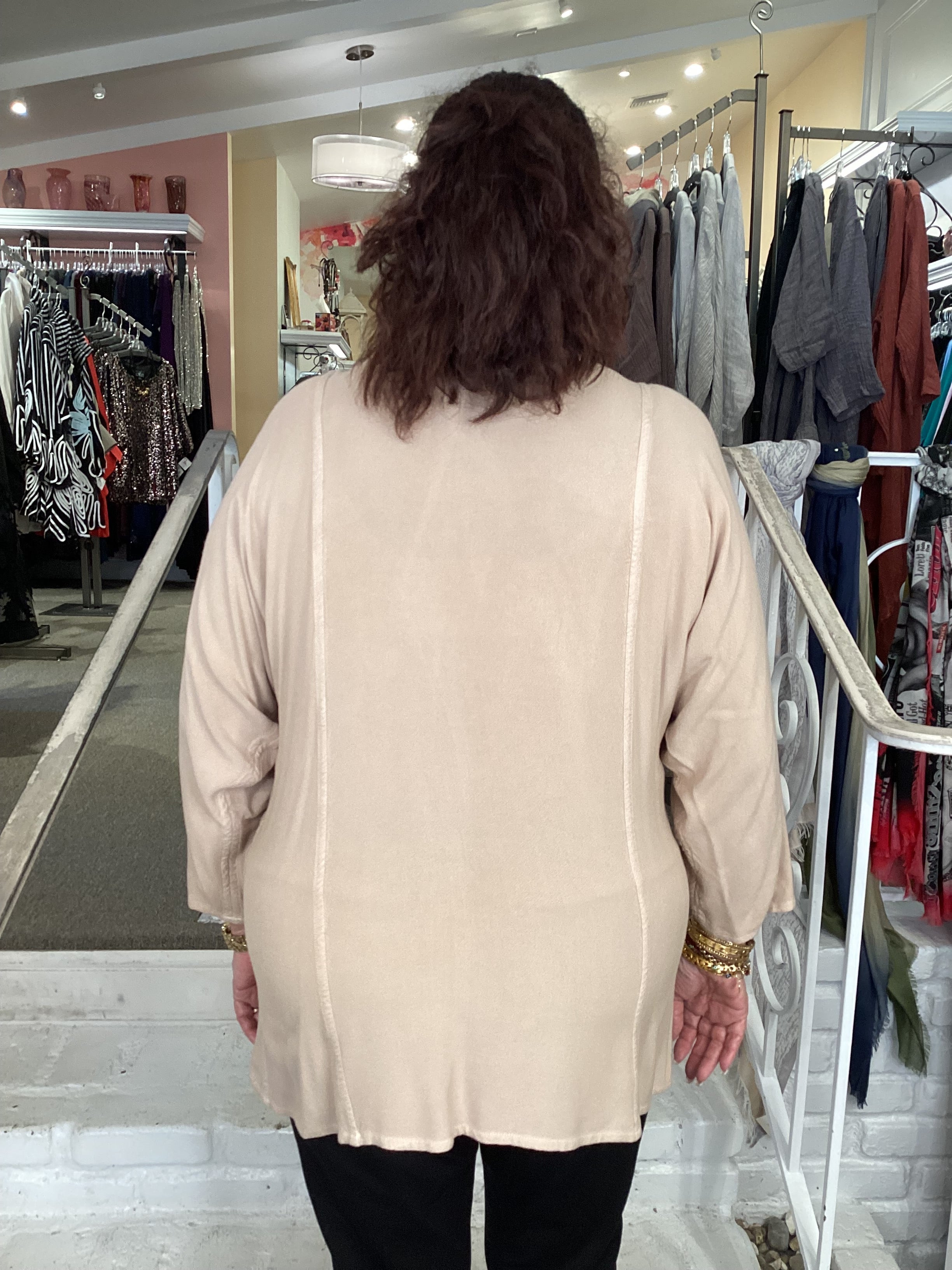 The cross over front creates a V-neck line outlined with stitching detail. The drop down long sleeves are generous on this plus size top. Two side seam pockets are generous and detailed with stitching. Our 1X model has plenty of room in this one size garment.