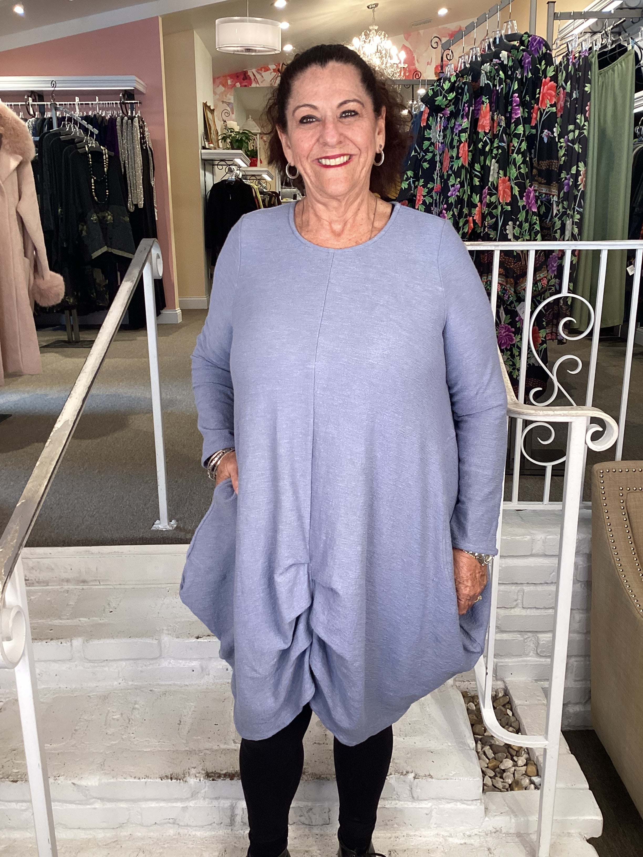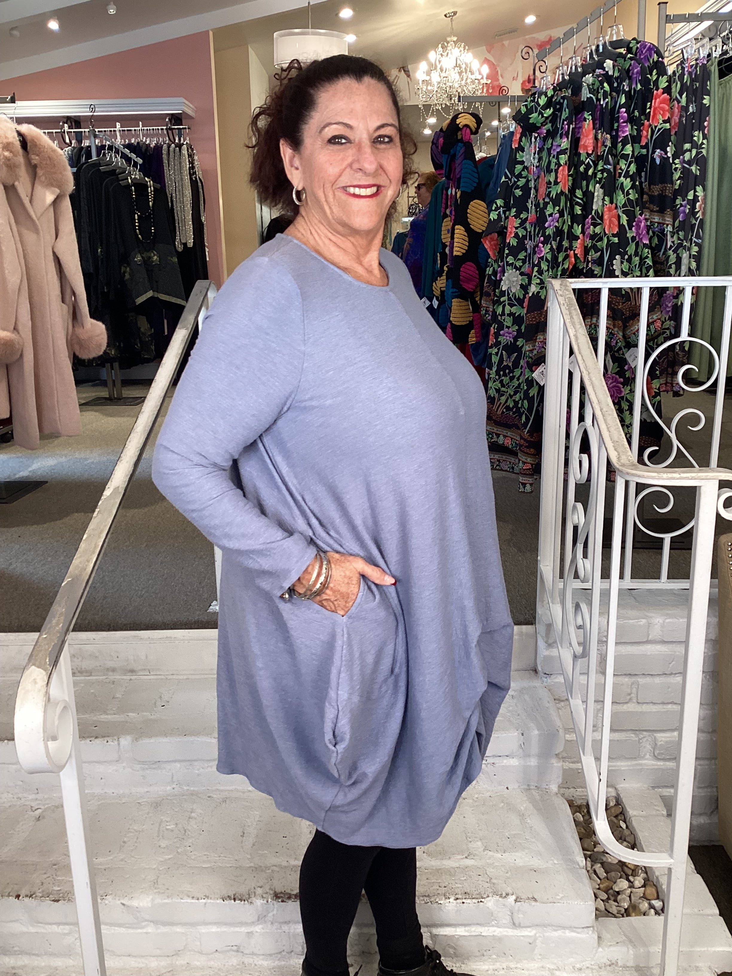 This Cheyenne comfortable, generous and unique "Art to Wear" 2 side slit pocket, Drape Front Tunic designed for a woman who values individuality, originality and comfort. Cotton / Poly / Spandex blend, machine wash cold.