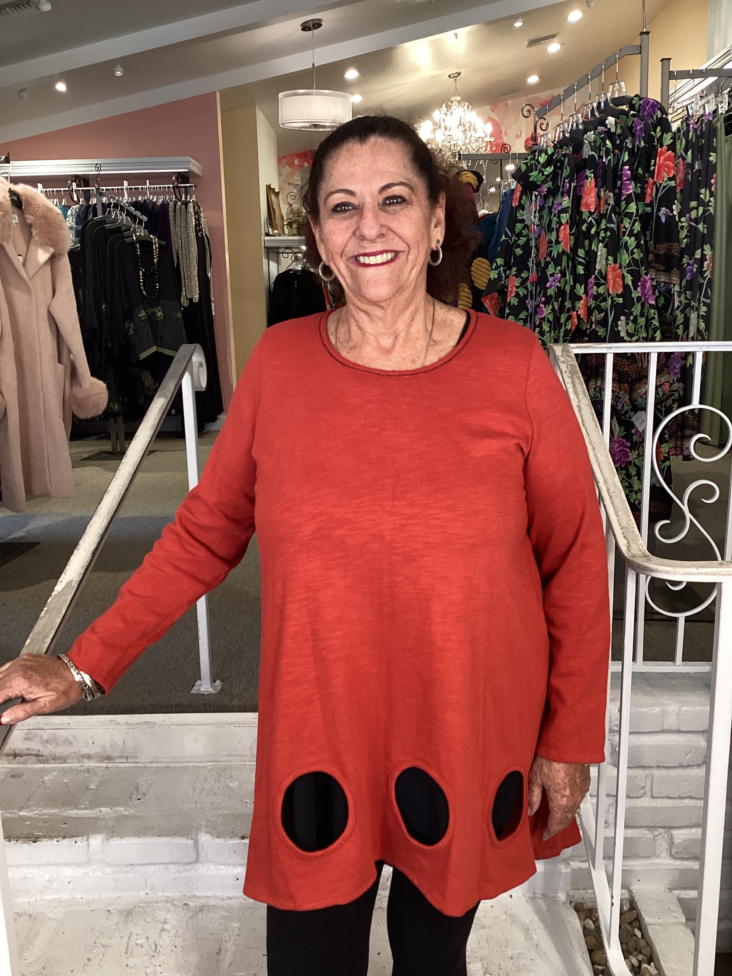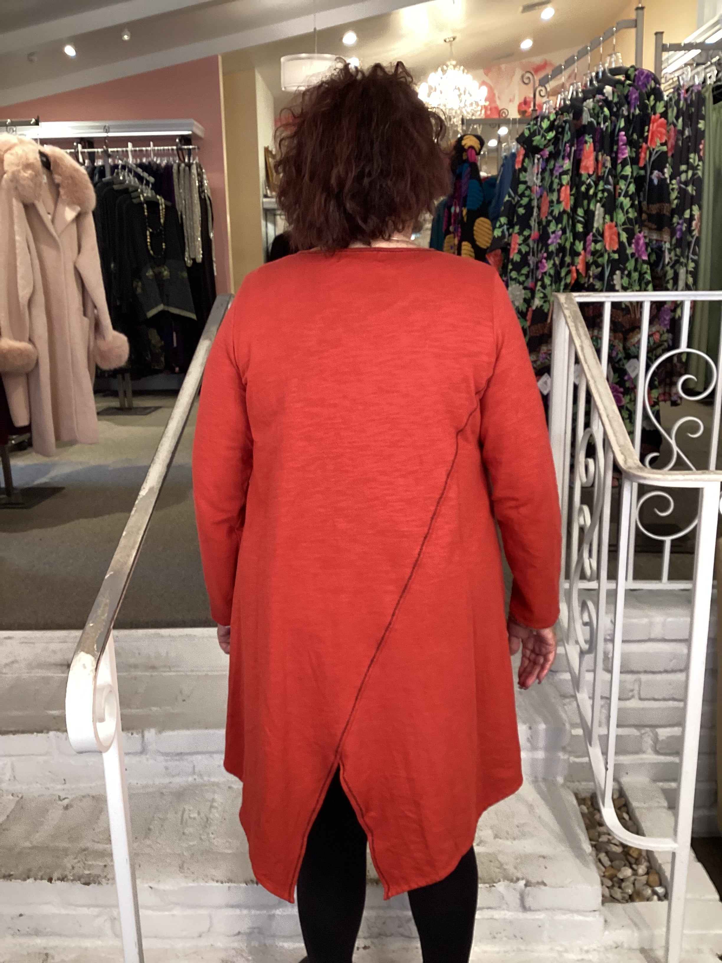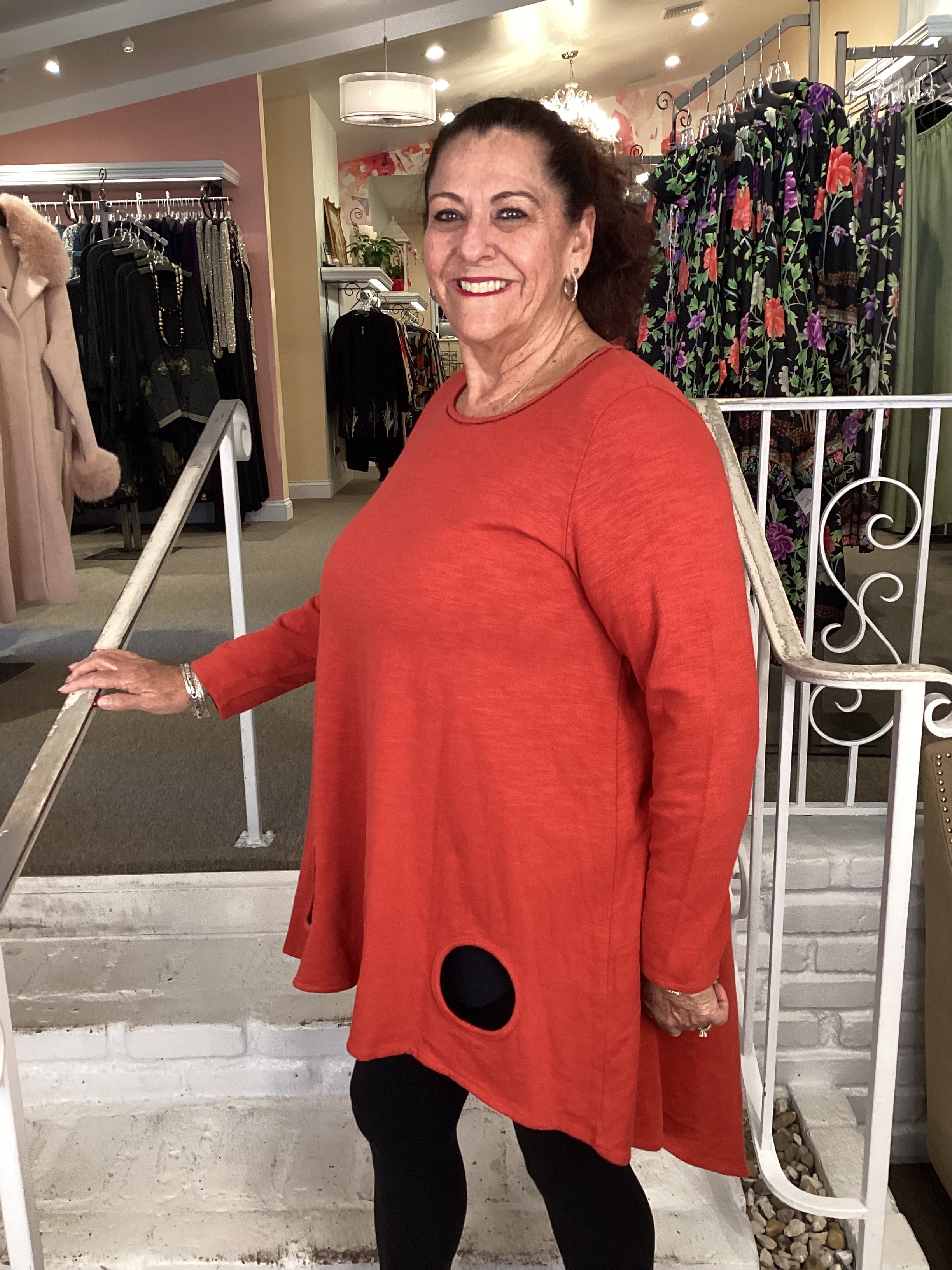 Expertly designed with a professional touch, the Red Tunic boasts , long sleeves, and a scoop neck for a stylish and sophisticated look. Featuring a unique cut out hem detail. This tunic adds a touch of edge to your wardrobe.