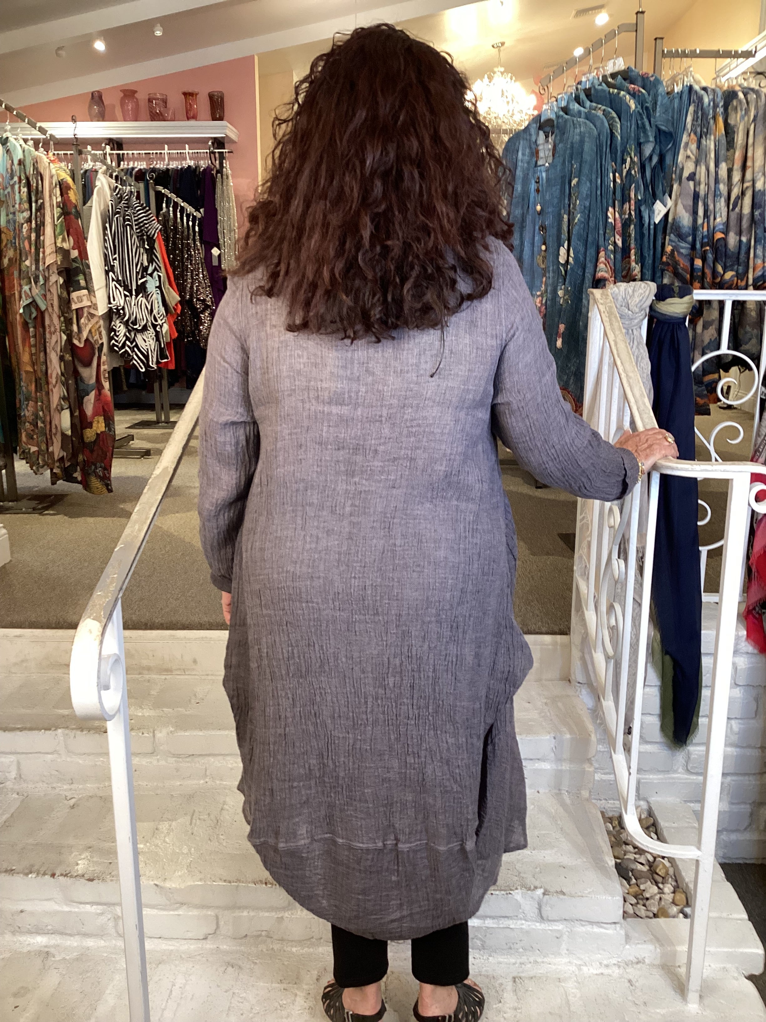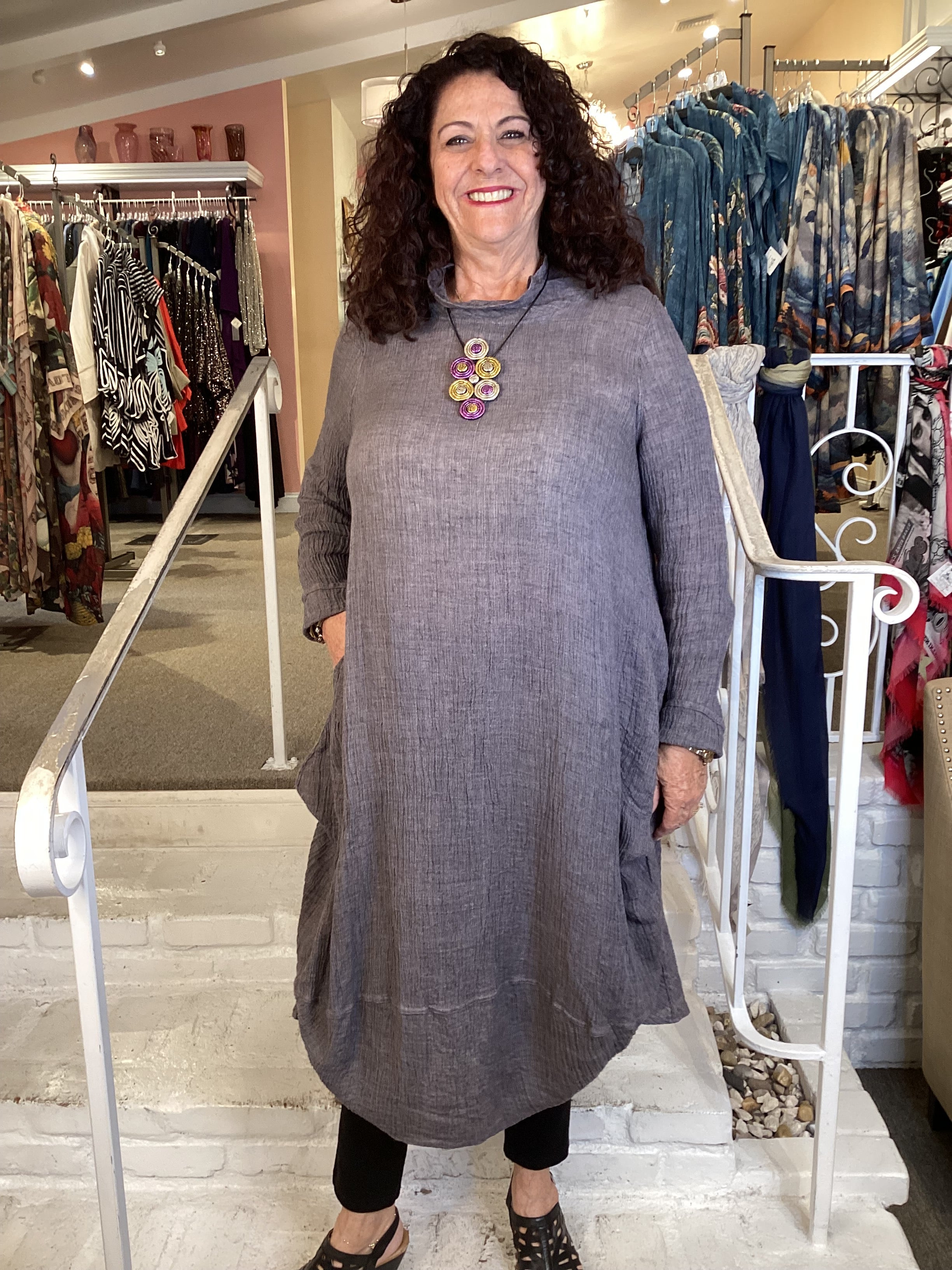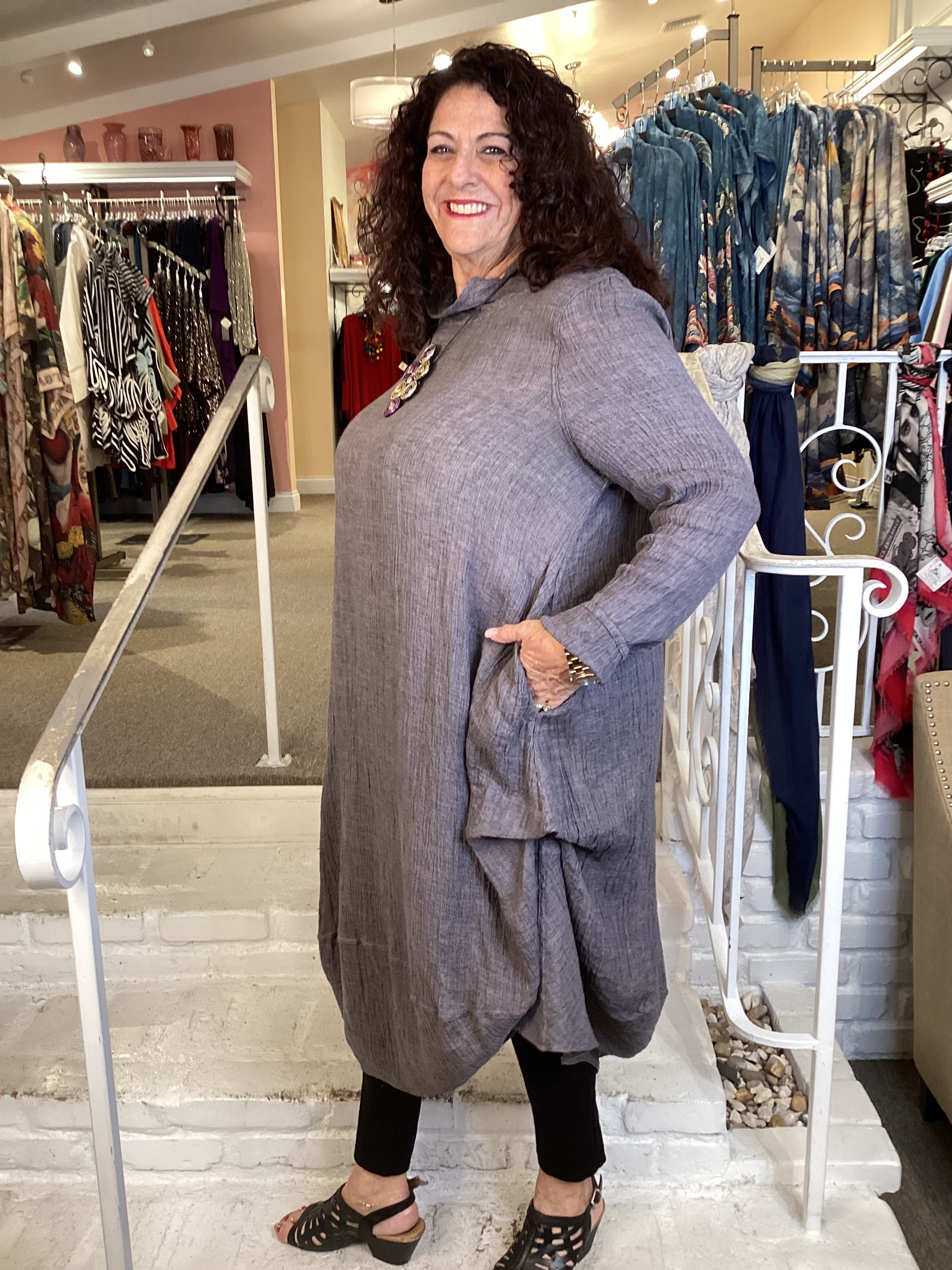 A loose mock turtle neck tops this a-line crinkle linen gauze dress. Tie up the side seam drawstrings (inside) to create draping folds on the sides or wear it longer when you untie them.