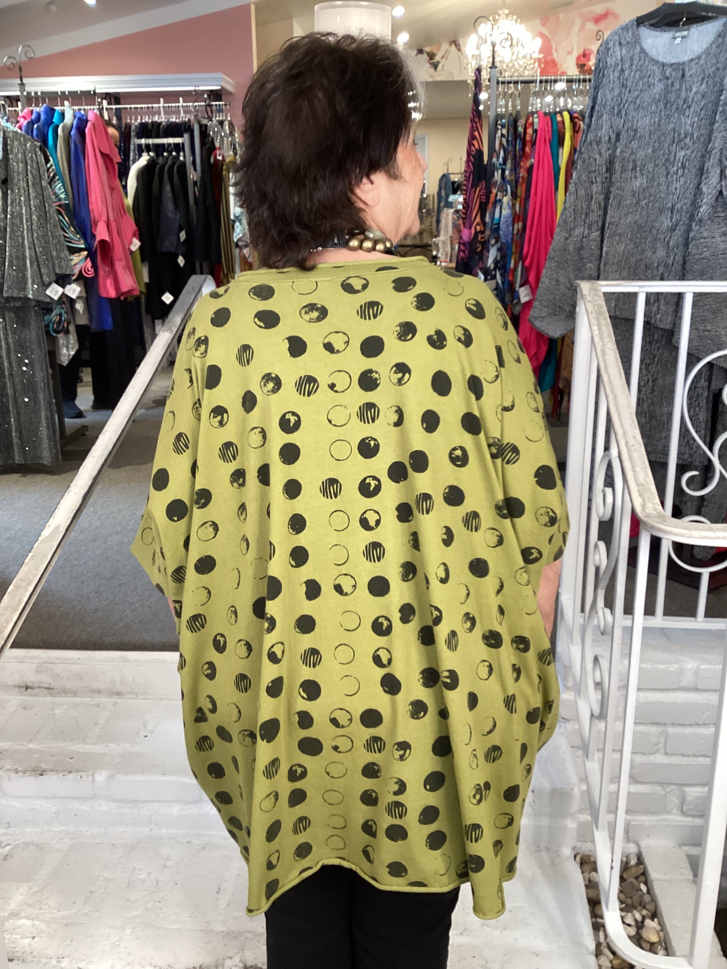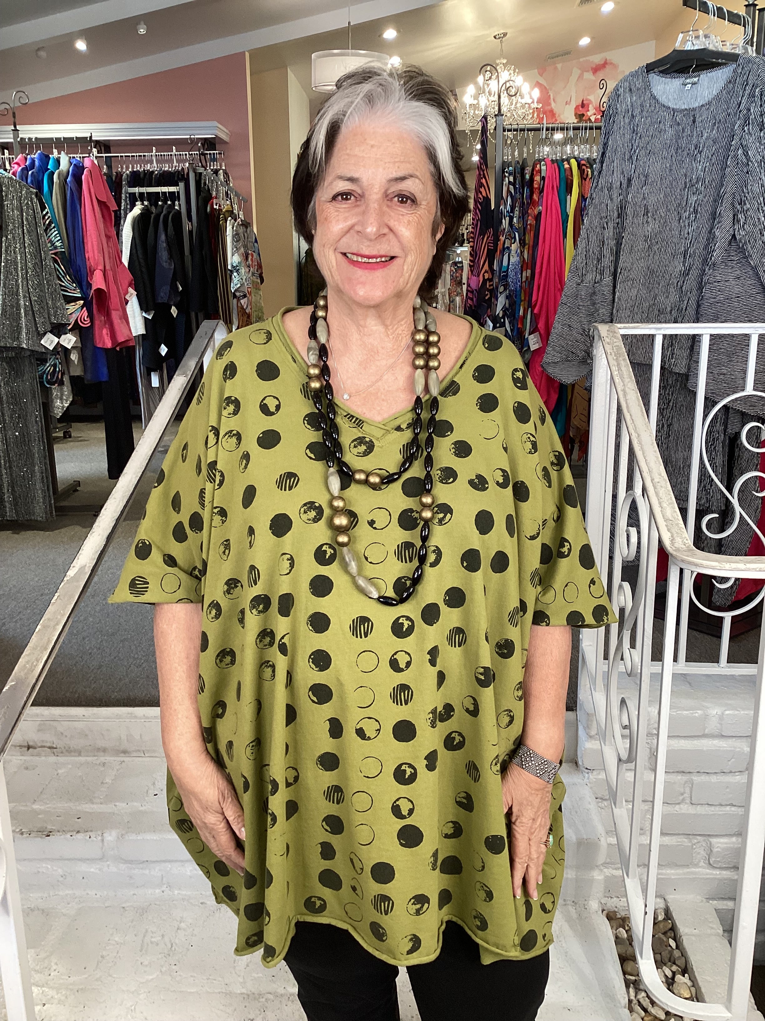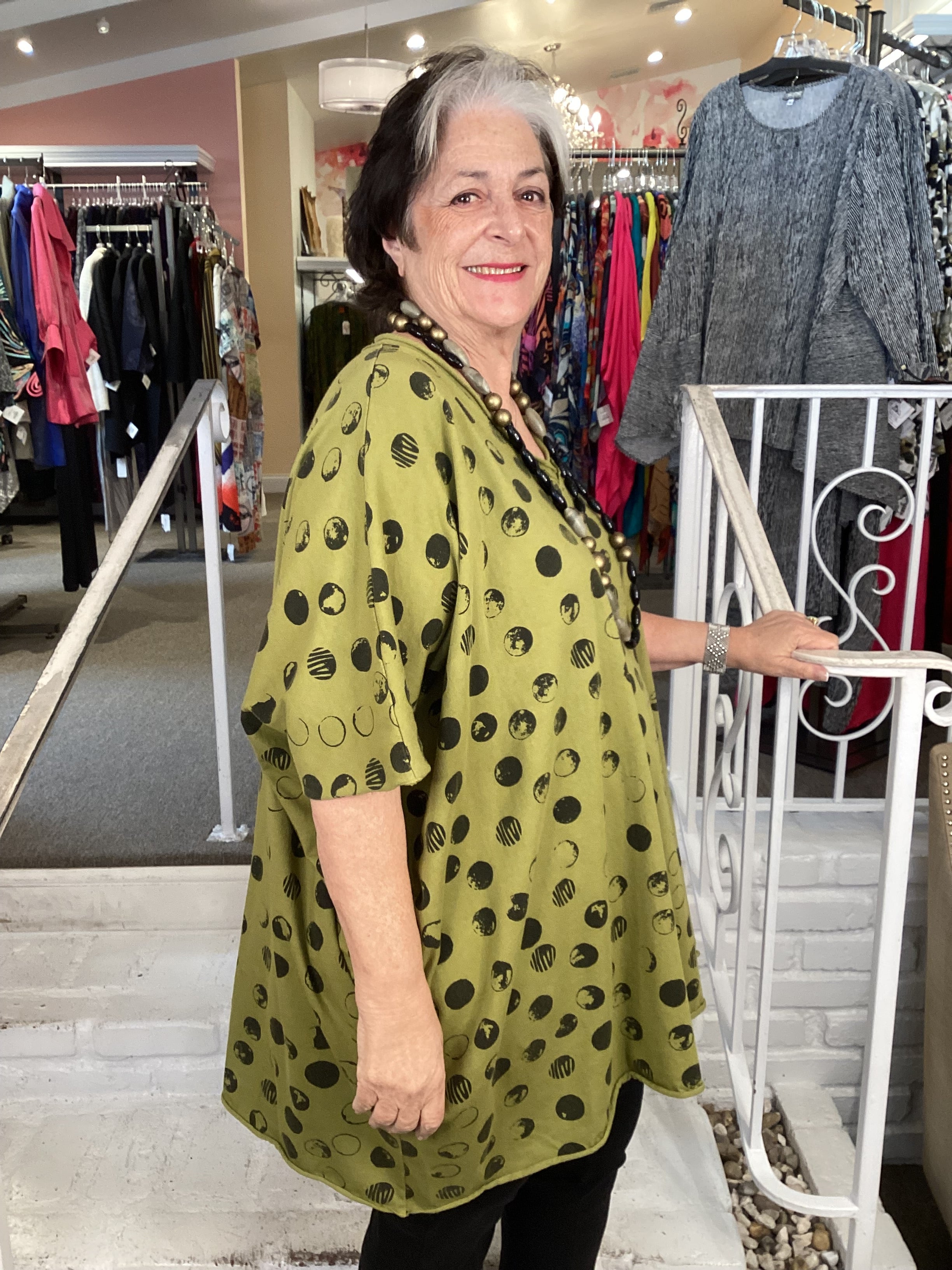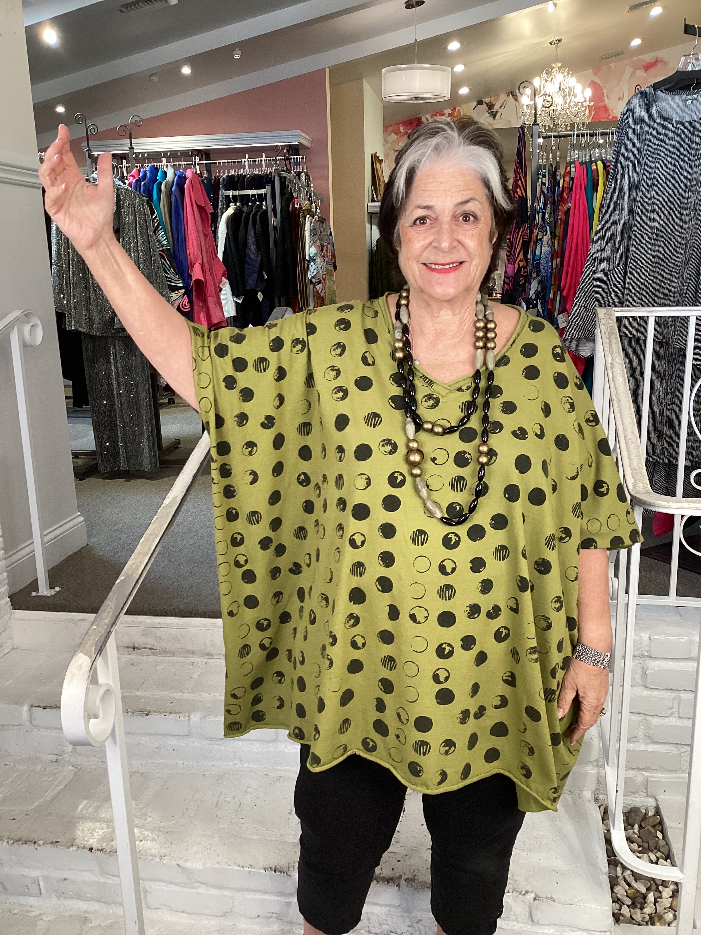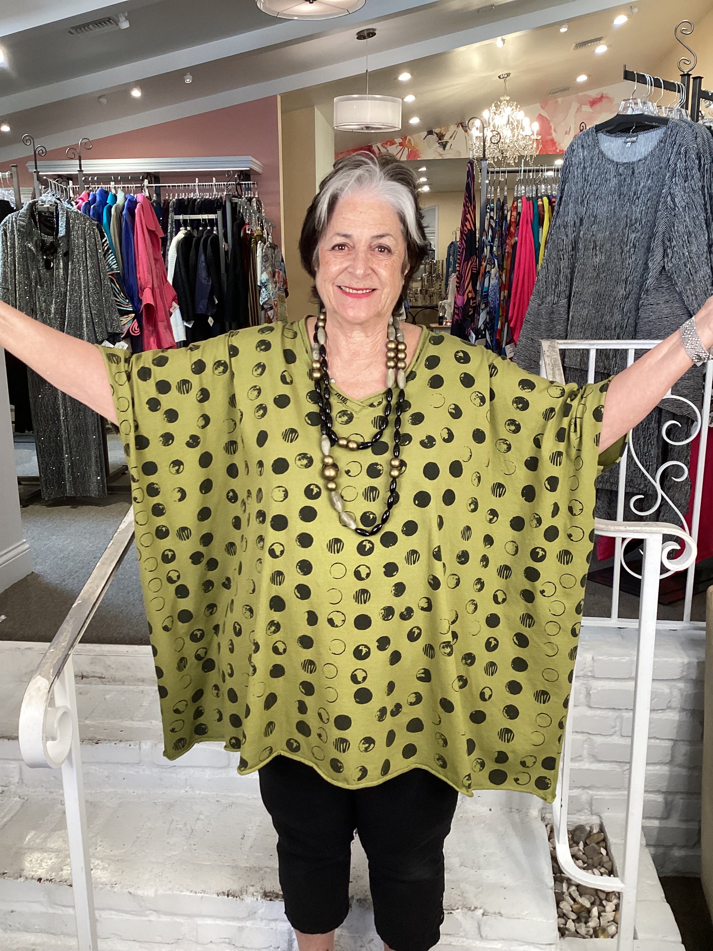 Generously cut, this one size cotton tunic has a flowy design with rolled edges at the v-neckline and a poncho shaped silhouette. Finished with elbow length sleeves, this every day tee is available in several fabulous colors and prints. Pop it over leggings or jeans and you're off in comfort.  This one size top measures 78" bust, 30" long.