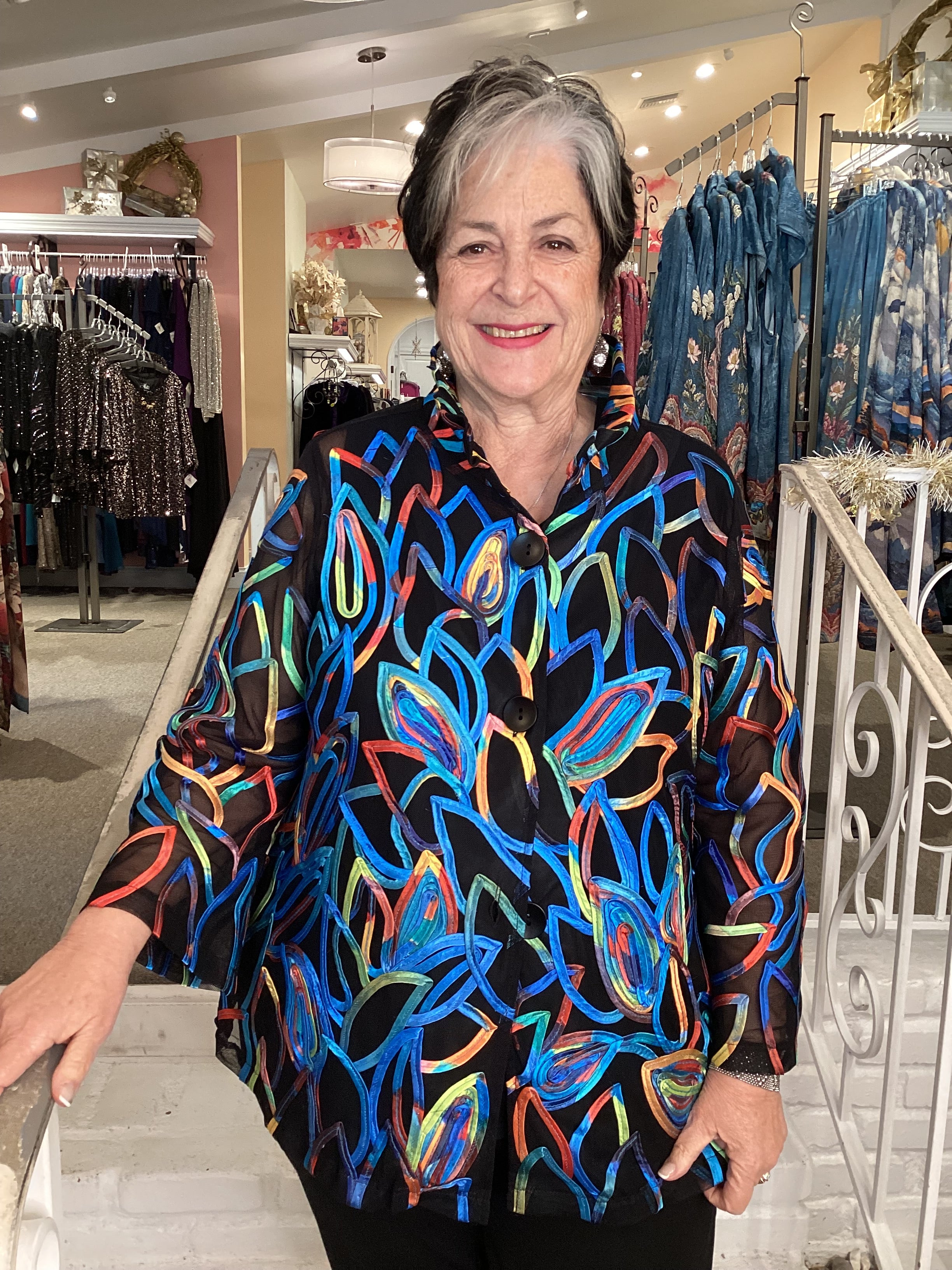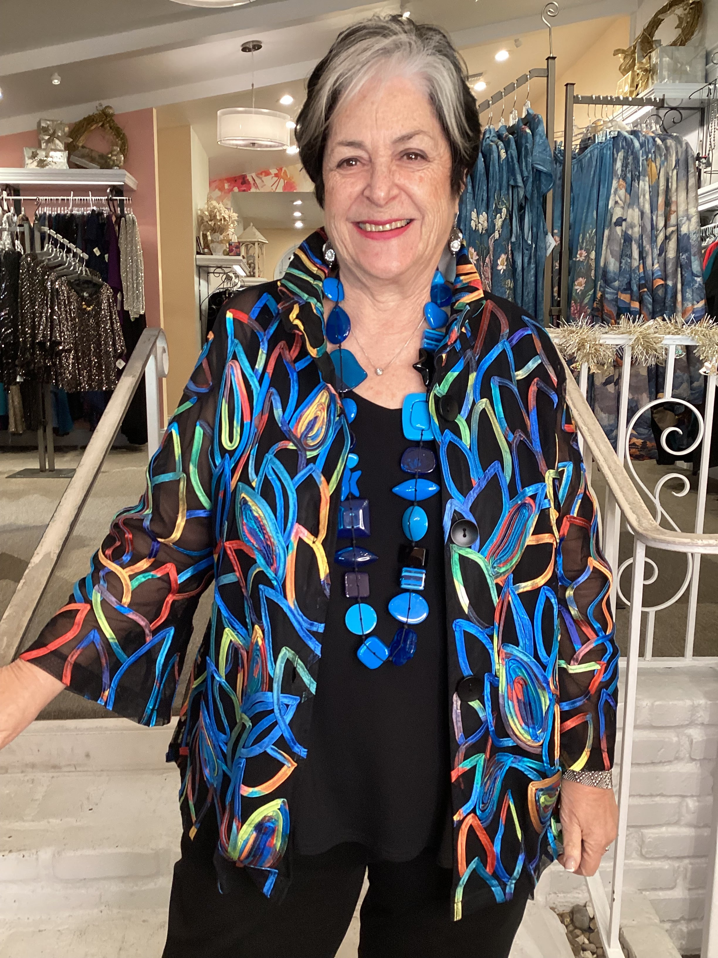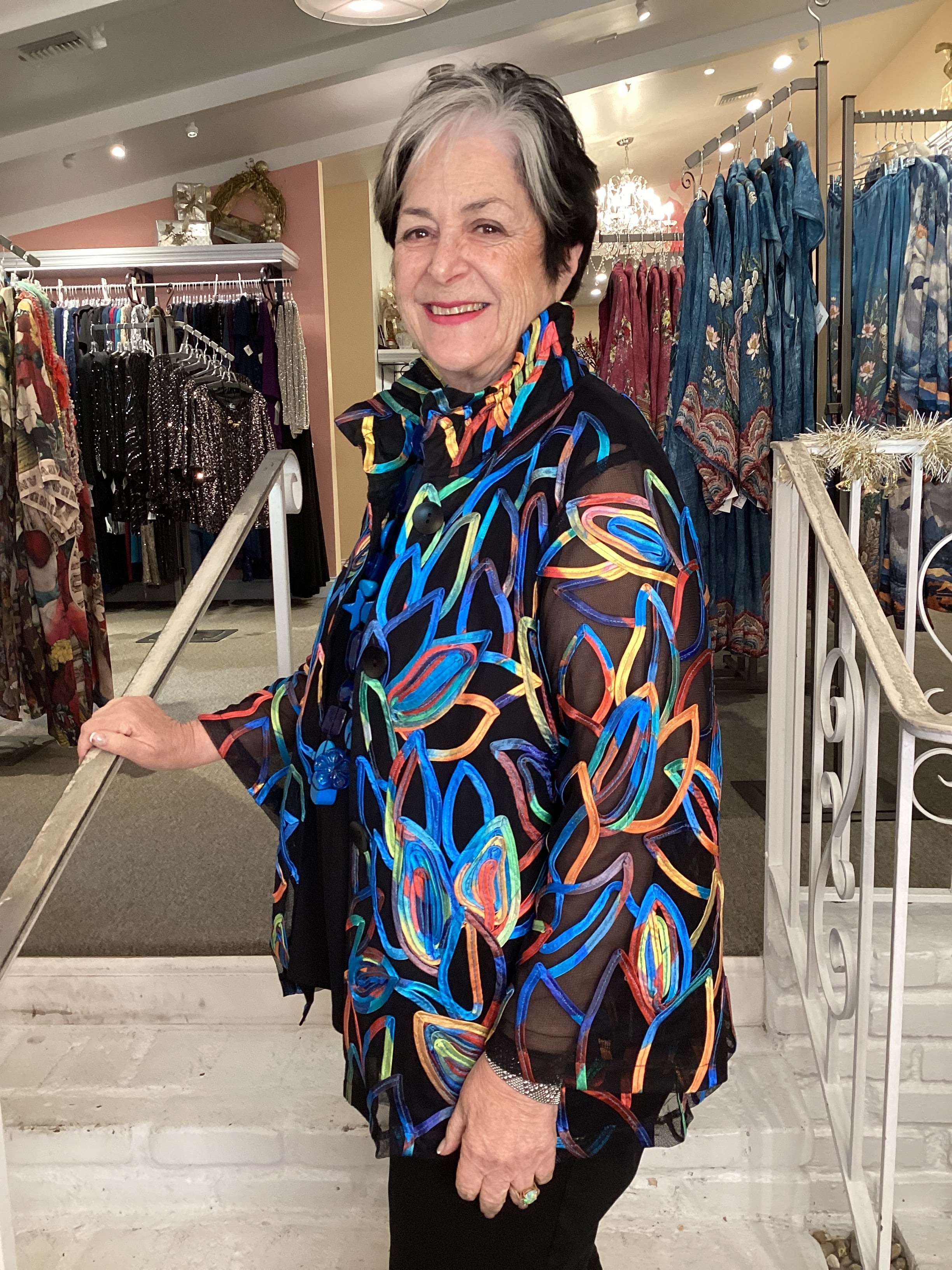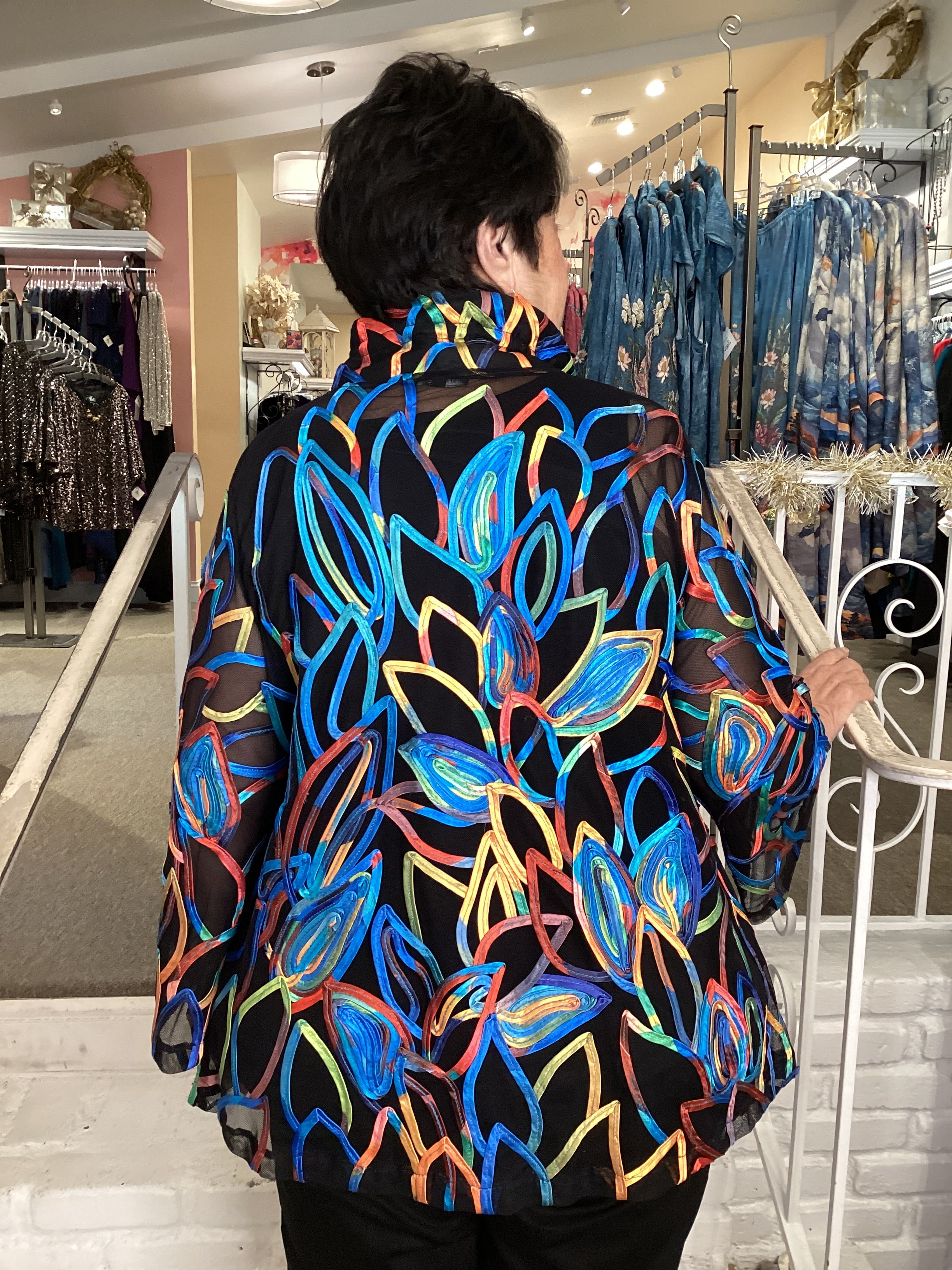 This is a classic Damee jacket, black mesh, button front, generous long sleeves, sheer black lining and wired collar. The sleeves are set in and the silhouette flares out at the waist/hips. The unique soutache consists of vibrant multicolor satin in floral motif. The bust measures 48", hips 58", length 30".