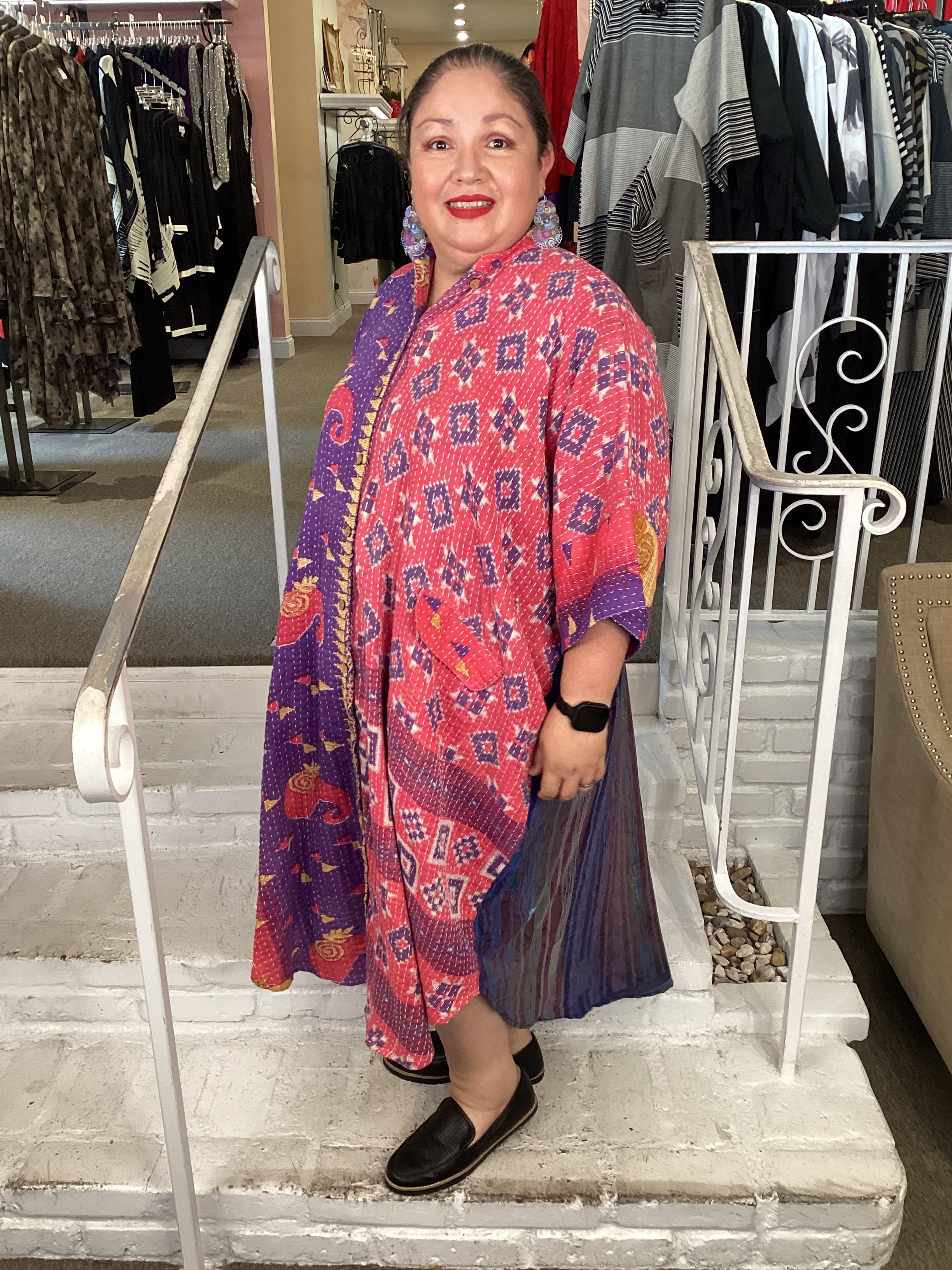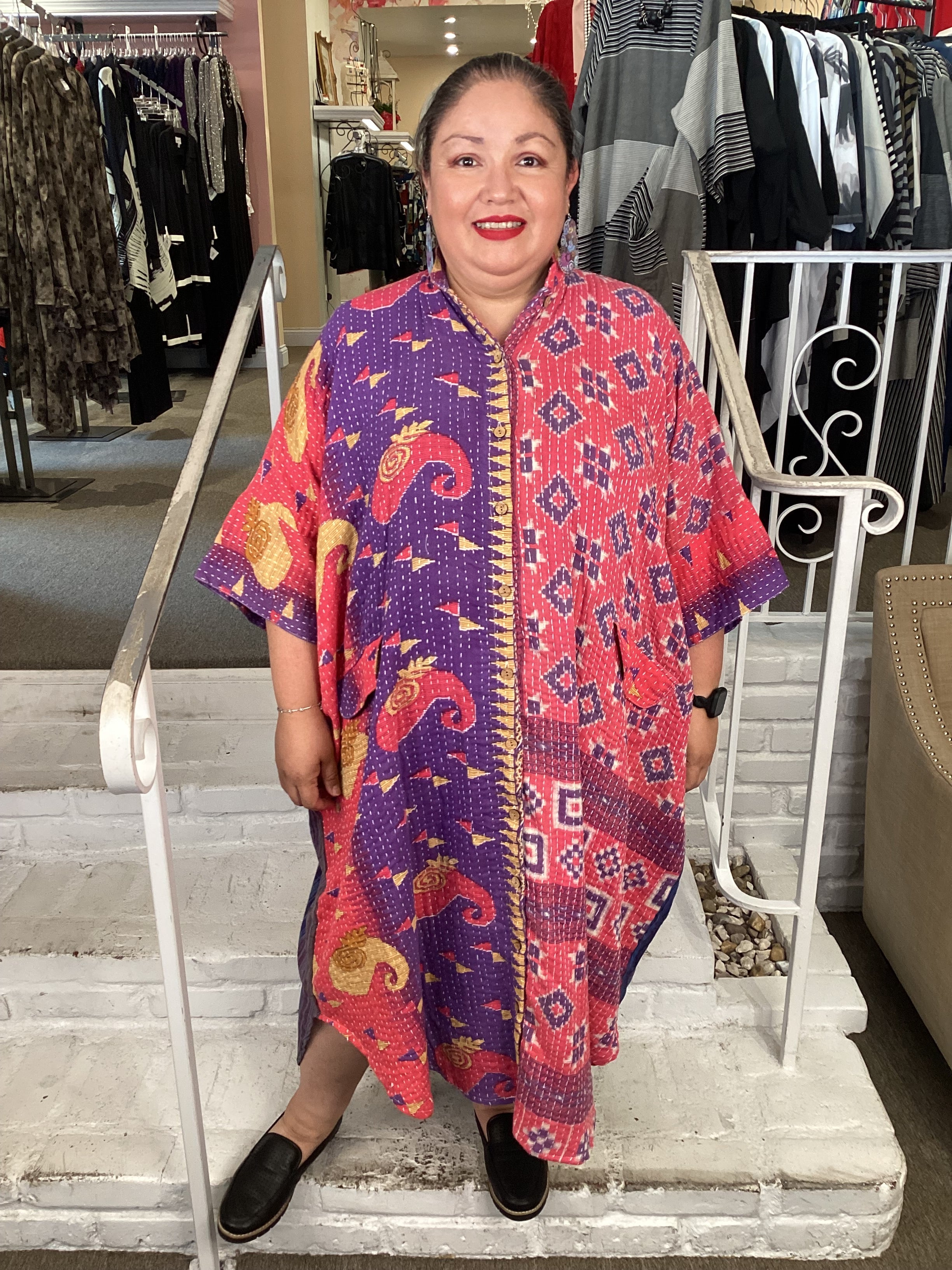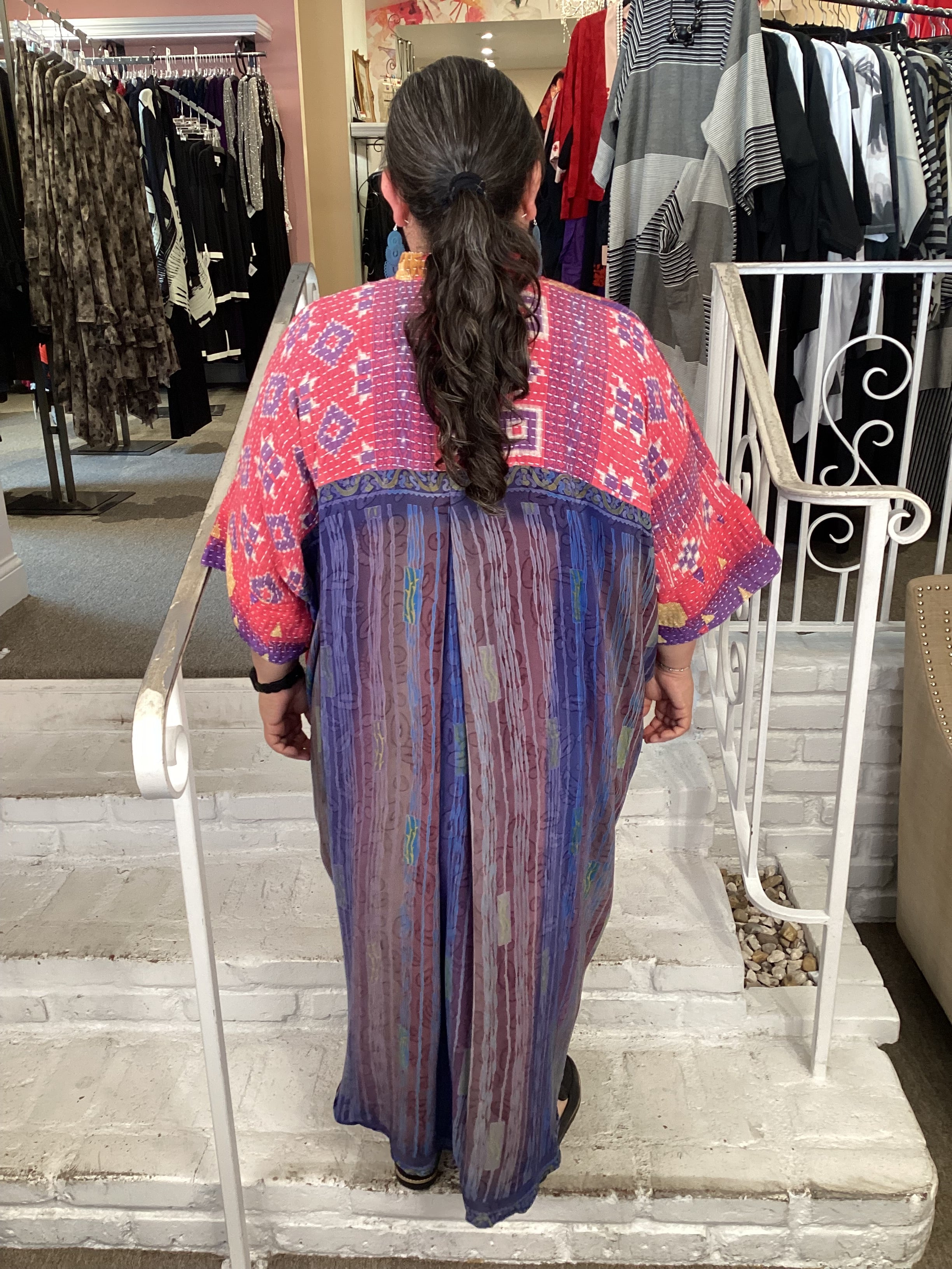 Made from the designer's vintage stitched cotton, this oversized kimono features button front, two deep pockets in the front, a curved shirt style hem and Mandarin collar. Generous sleeve opens the fold back button cuff 20". The back is comprised of stitch cotton yoke with a lower pleated panel of printed poly.