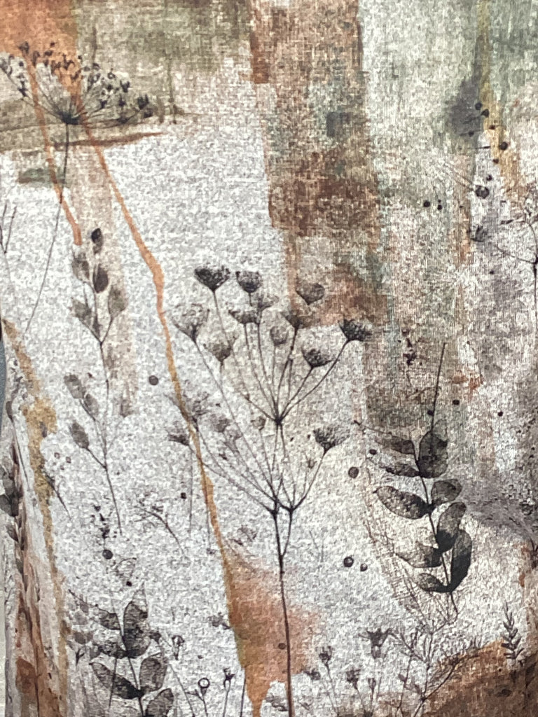 Experience cozy charm with the BRUSH TUNIC. Made from super soft French brushed knit, this fun top shows off a lively abstract design. It has a high round neckline, long sleeves, a front center seam, and a button-detailed patch pocket that extends beyond the hem for a whimsical touch.