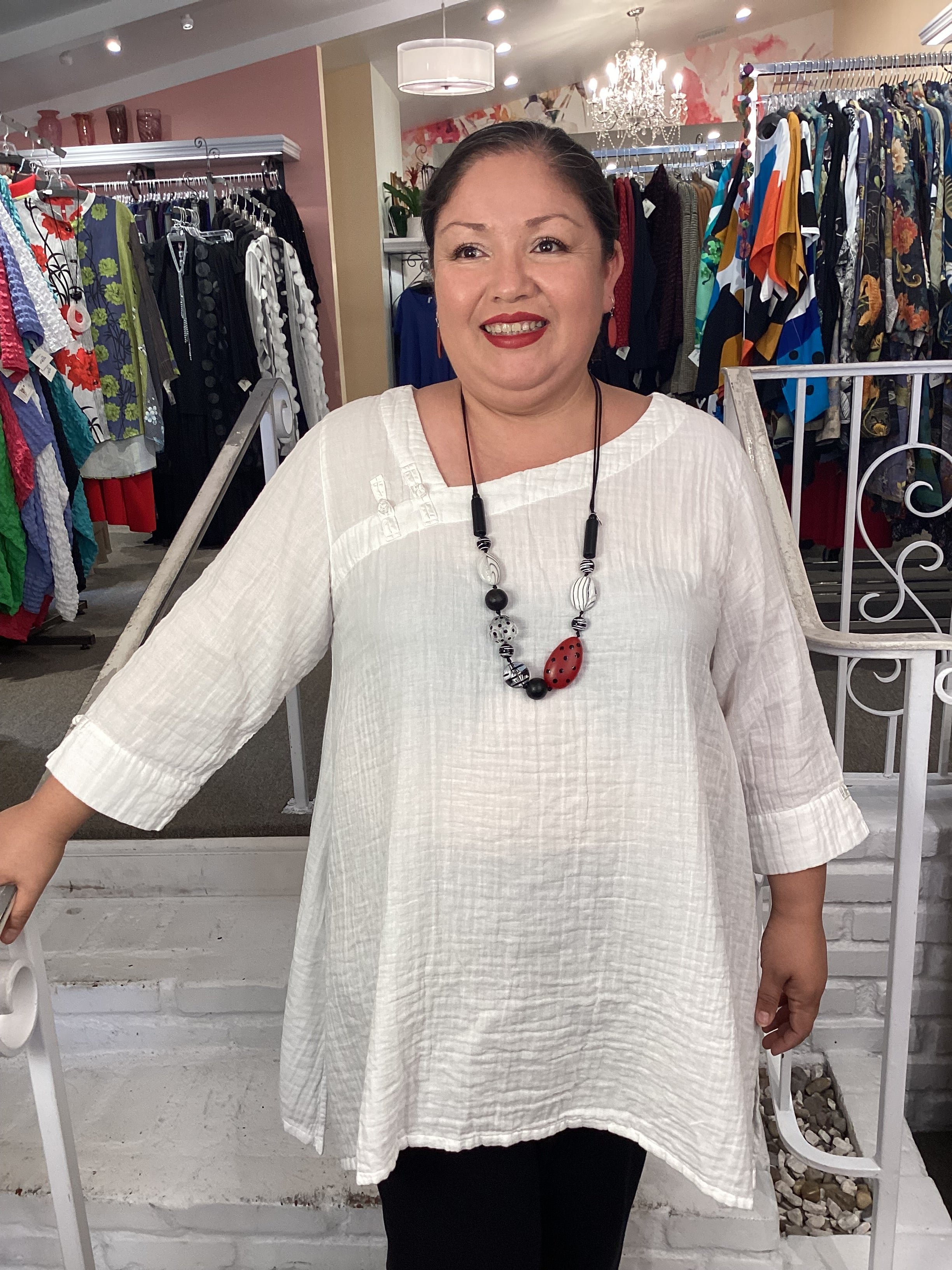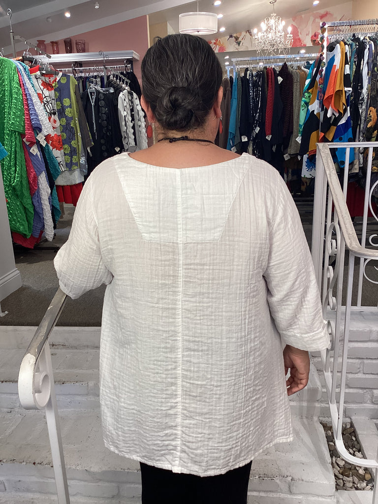 Expertly crafted from soft cotton, the FROG GAUZE TUNIC in offers a comfortable and versatile option for any wardrobe. With a unique symmetric neckline and 3/4 sleeves, this tunic also features side slits for added style and ease of movement. Perfect for any occasion.