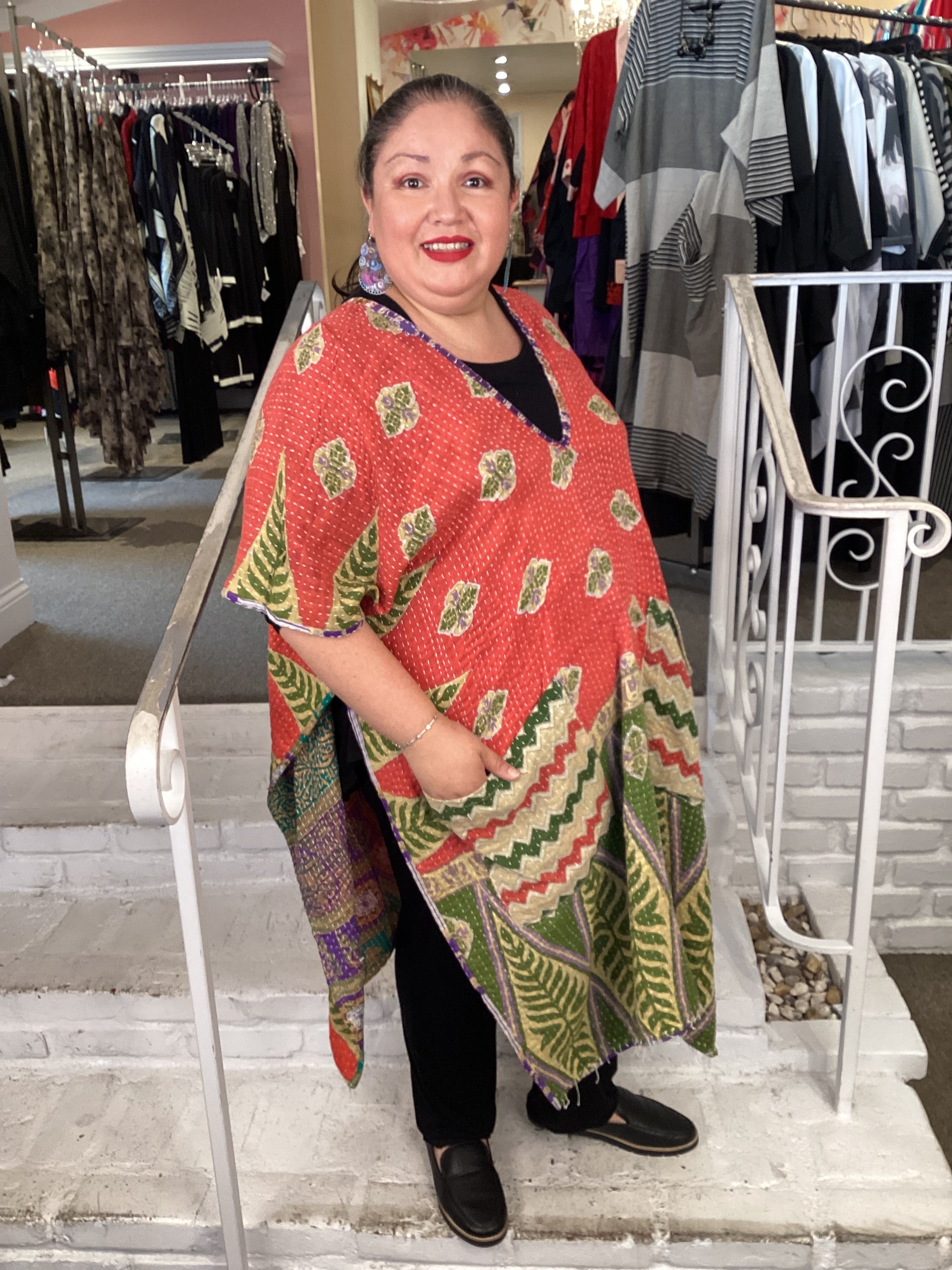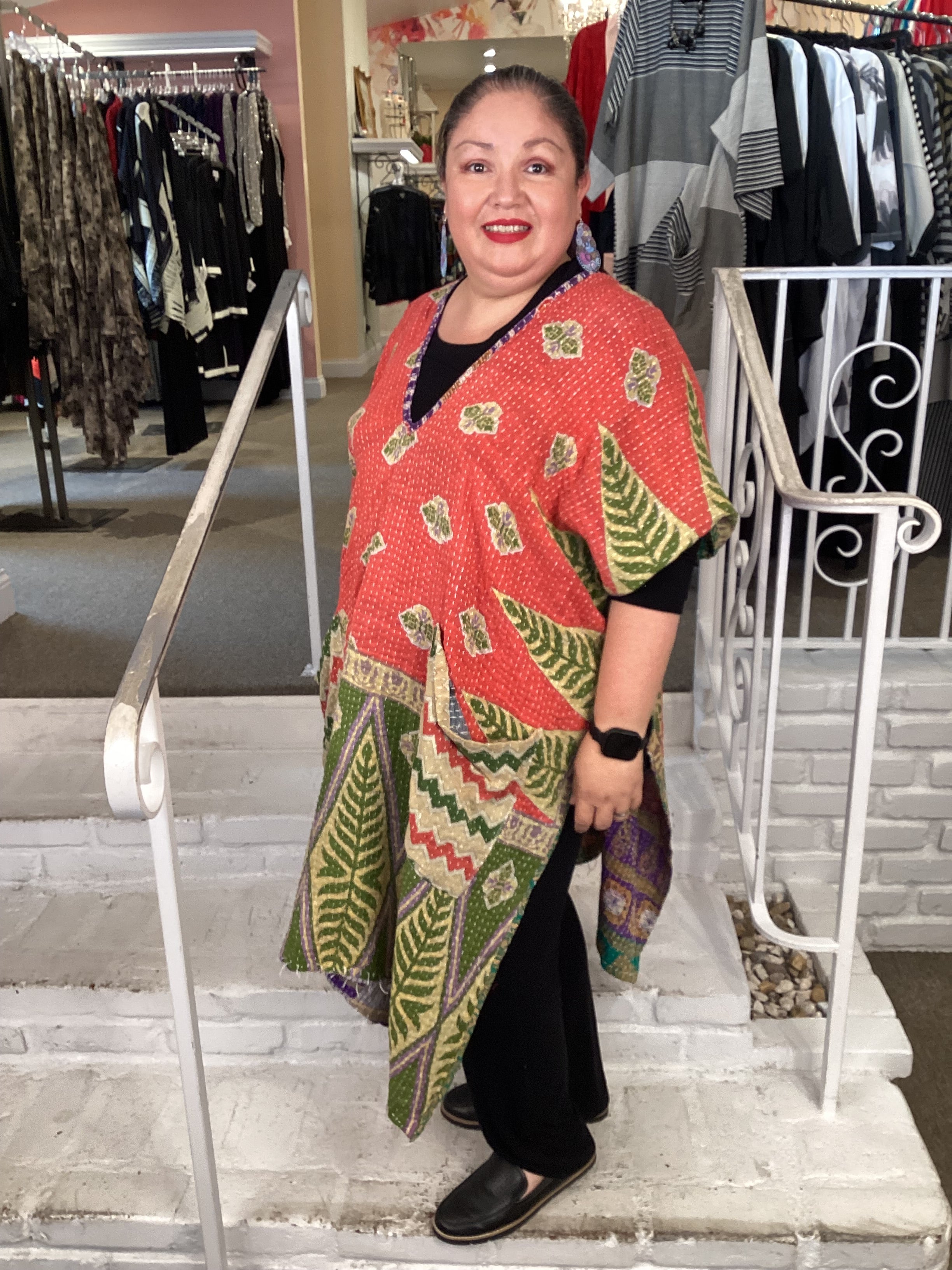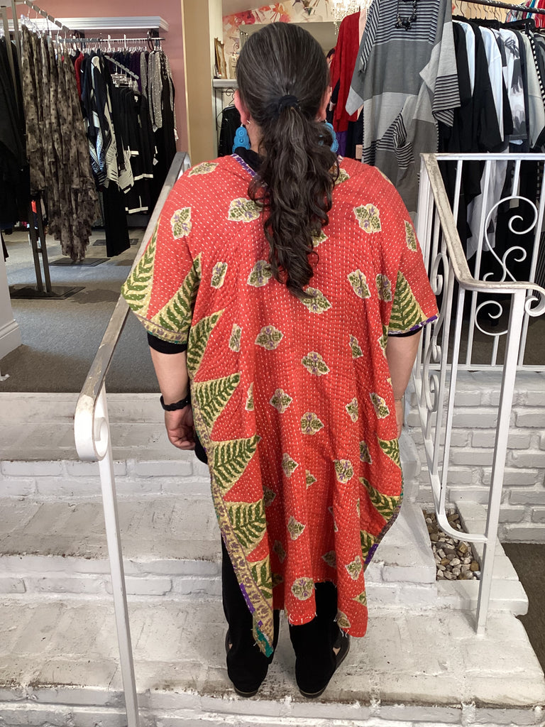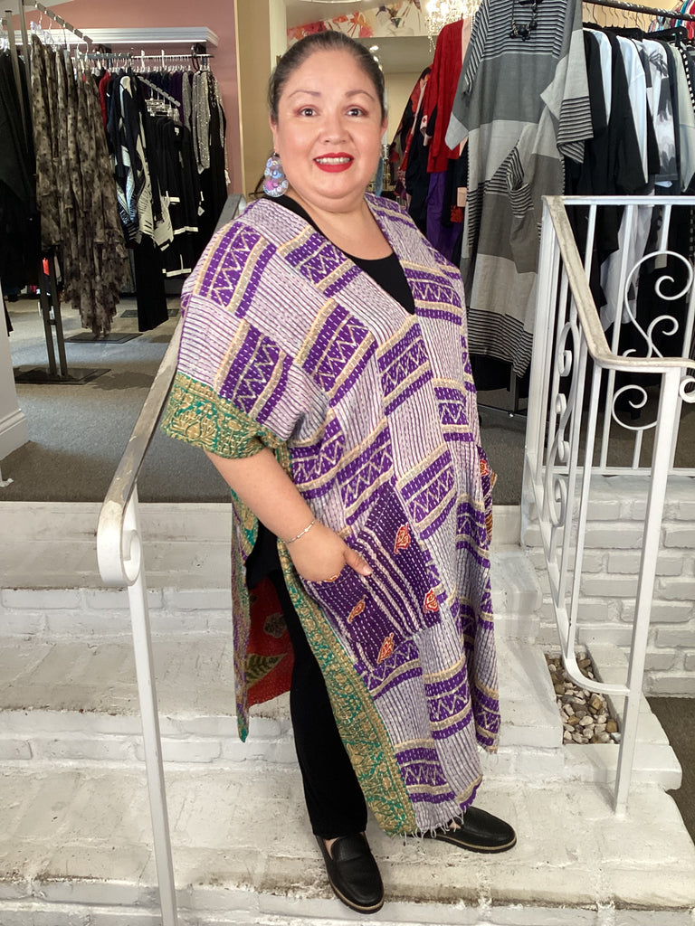 The GOOD LUCK TUNIC is a reversible, free-size essential designed for effortless wear. Featuring a deep V-neckline, slouchy pockets on both sides, and side slits for added movement, this piece transitions seamlessly across occasions. Hand-stitched from vintage cotton sari fabric with traditional kantha detailing, it combines artisanal craftsmanship with modern versatility—a thoughtfully constructed layer that works as hard as you do.