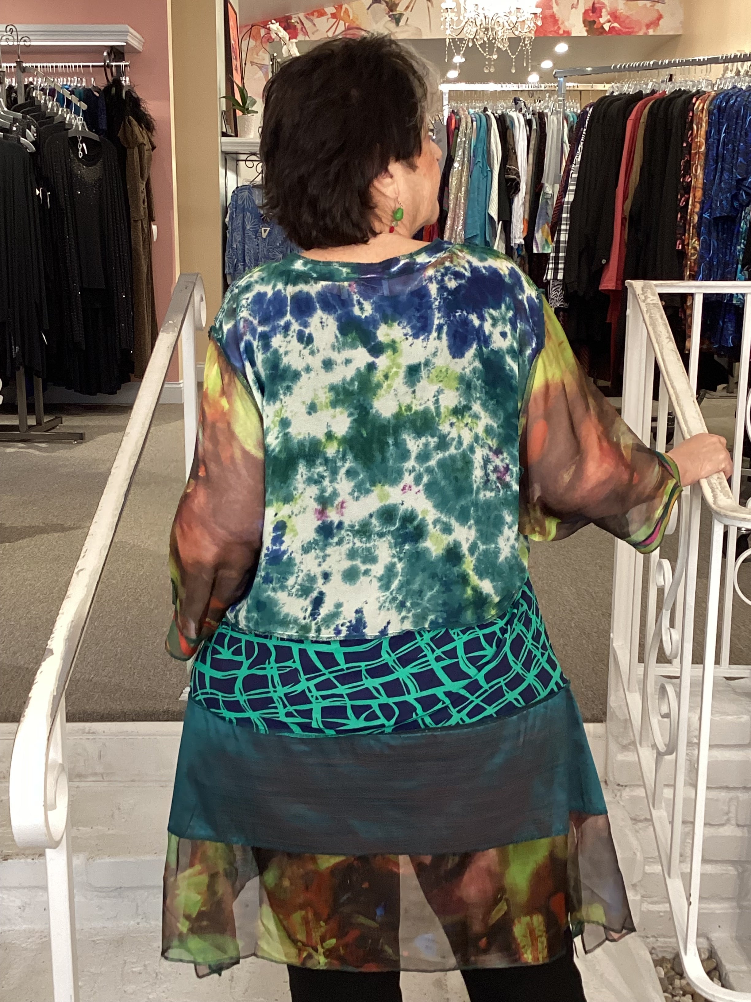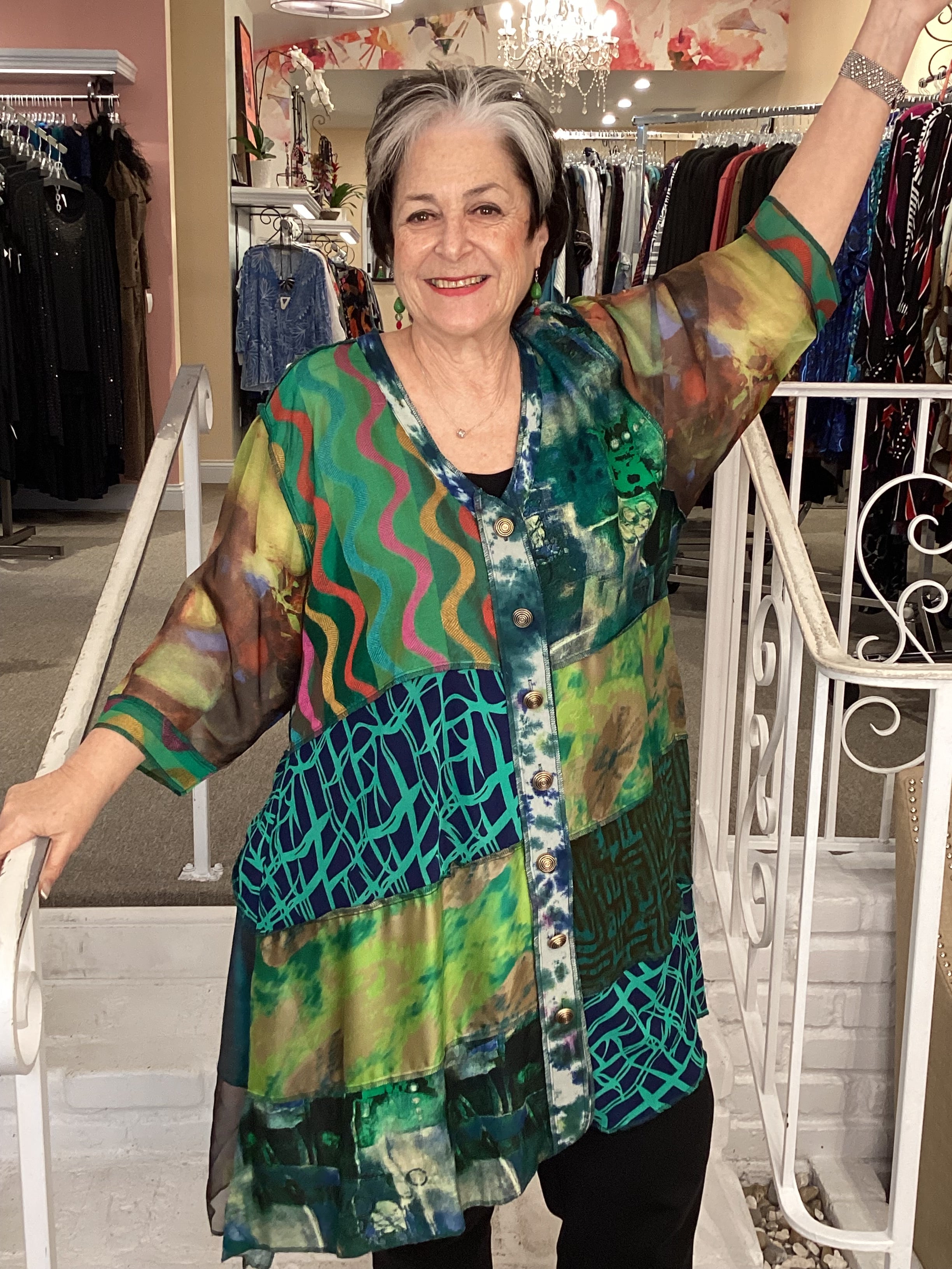 This lightweight generous Happy Coat will be a happy addition to your wardrobe!!! The long version has 3/4 sleeves, round neckline, and button front closure. This one size will fit up to a 1X. Each color way has a multi combination of prints and fabrics. Great a-line silhouette for layering as some of the fabrics are semi sheer.