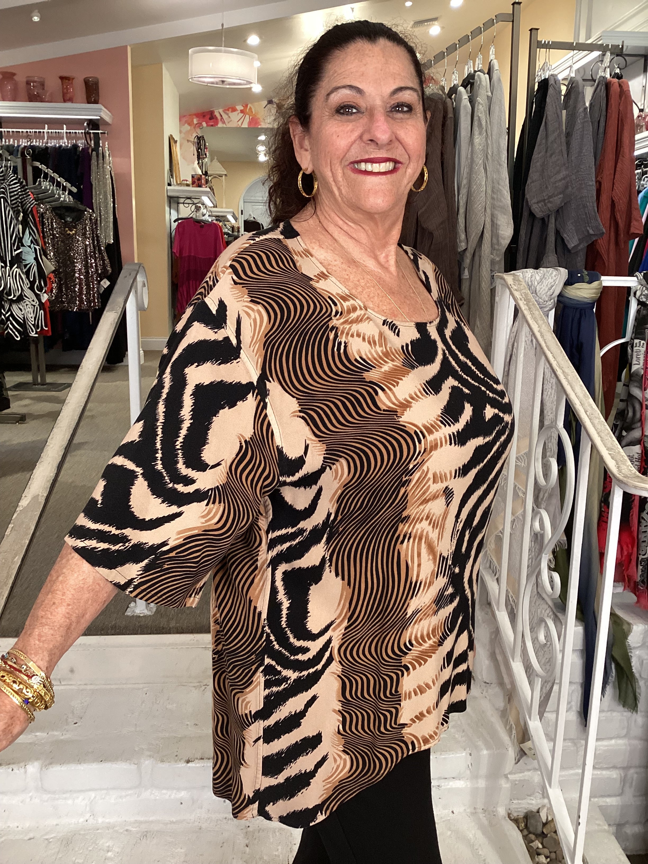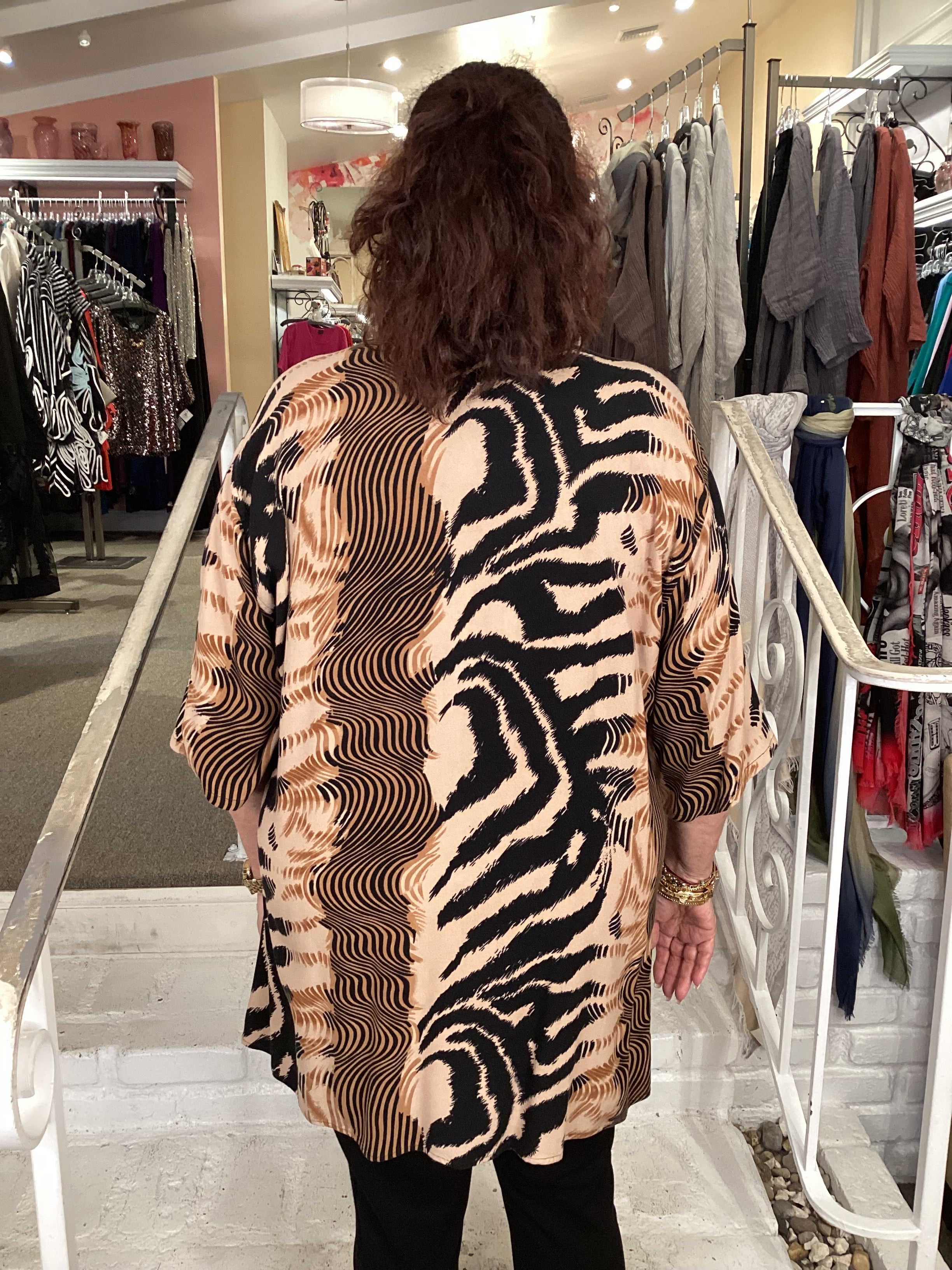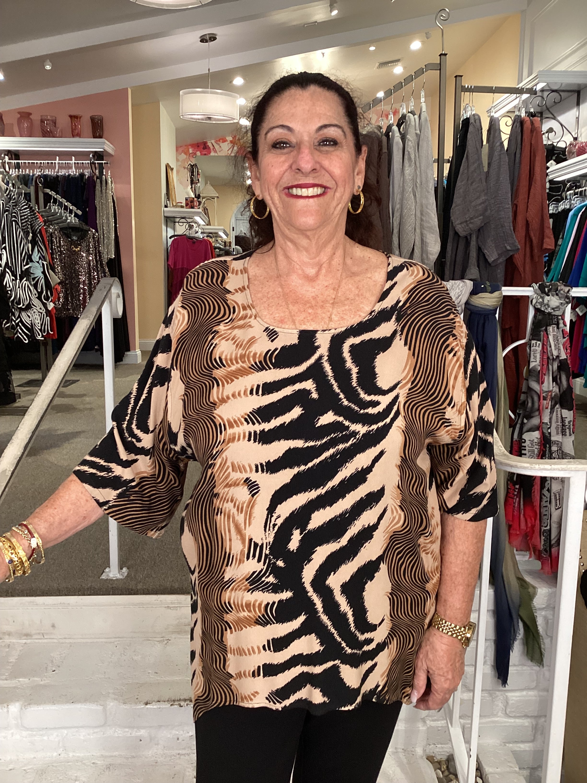 Featuring a classic round neckline and practical elbow-length sleeves, this versatile piece offers effortless wearability for daily styling. The high-low hemline creates visual interest and a modern silhouette, complemented by an eye-catching tiger saddle print that adds distinctive character to any outfit.
