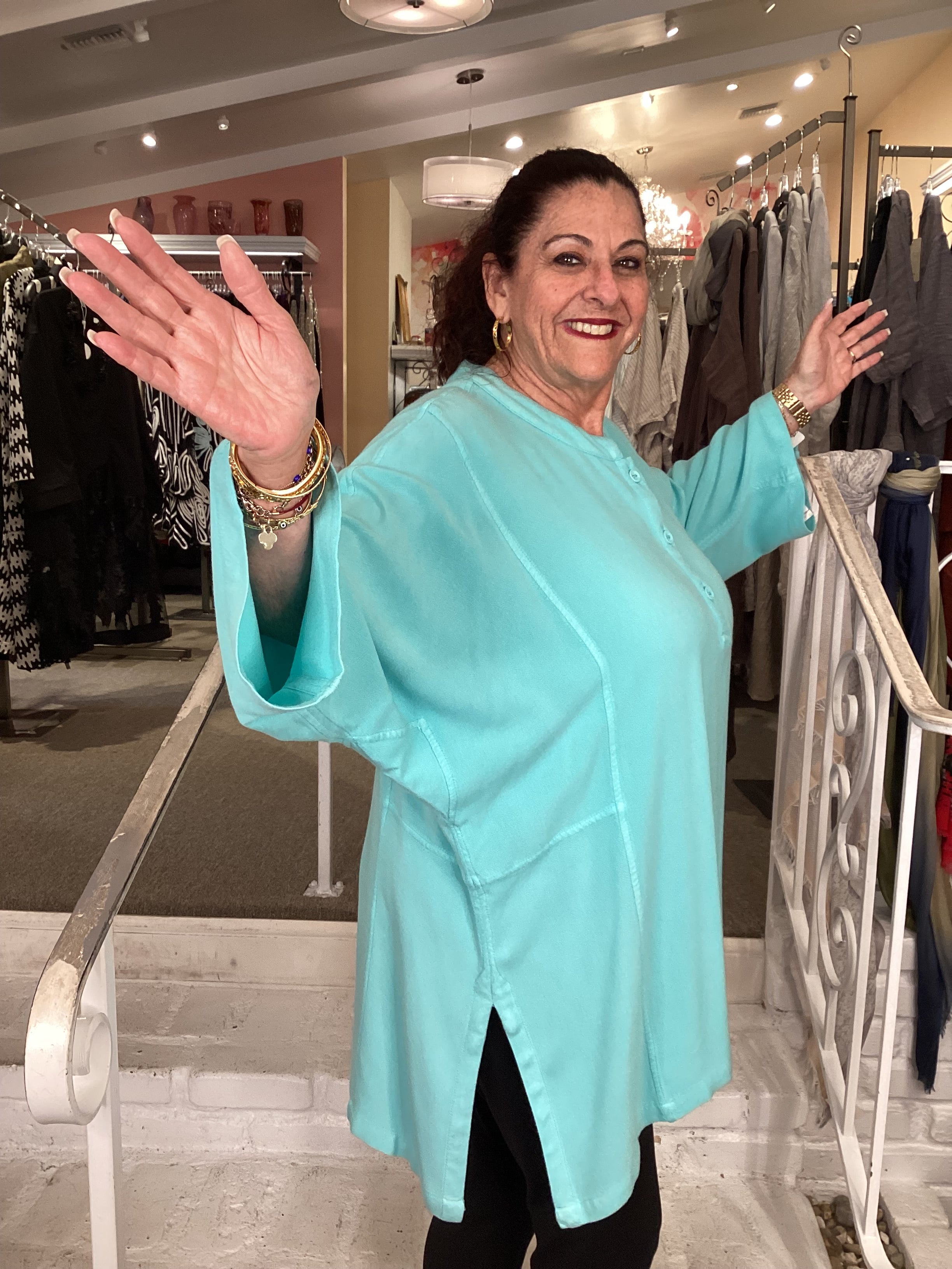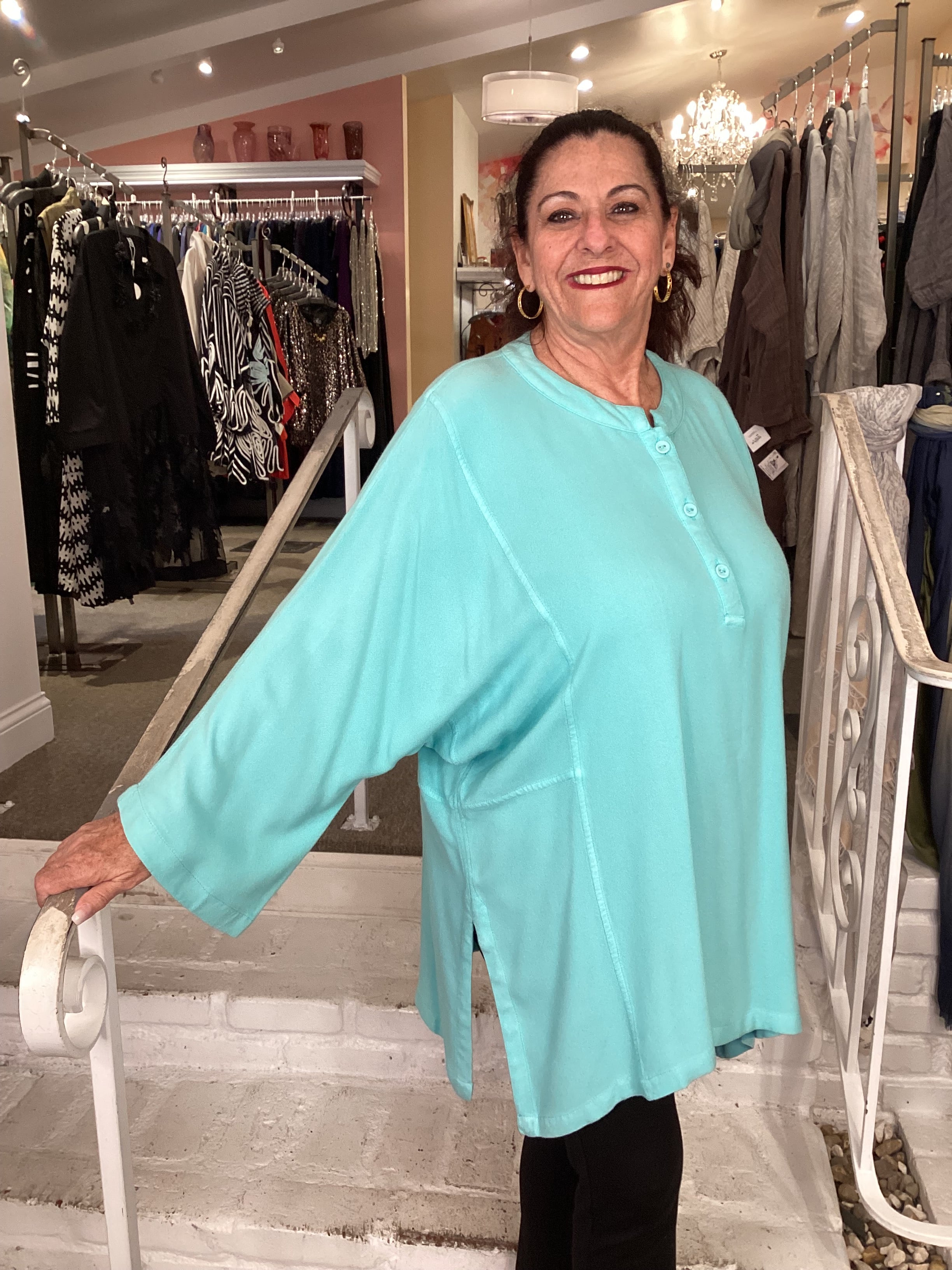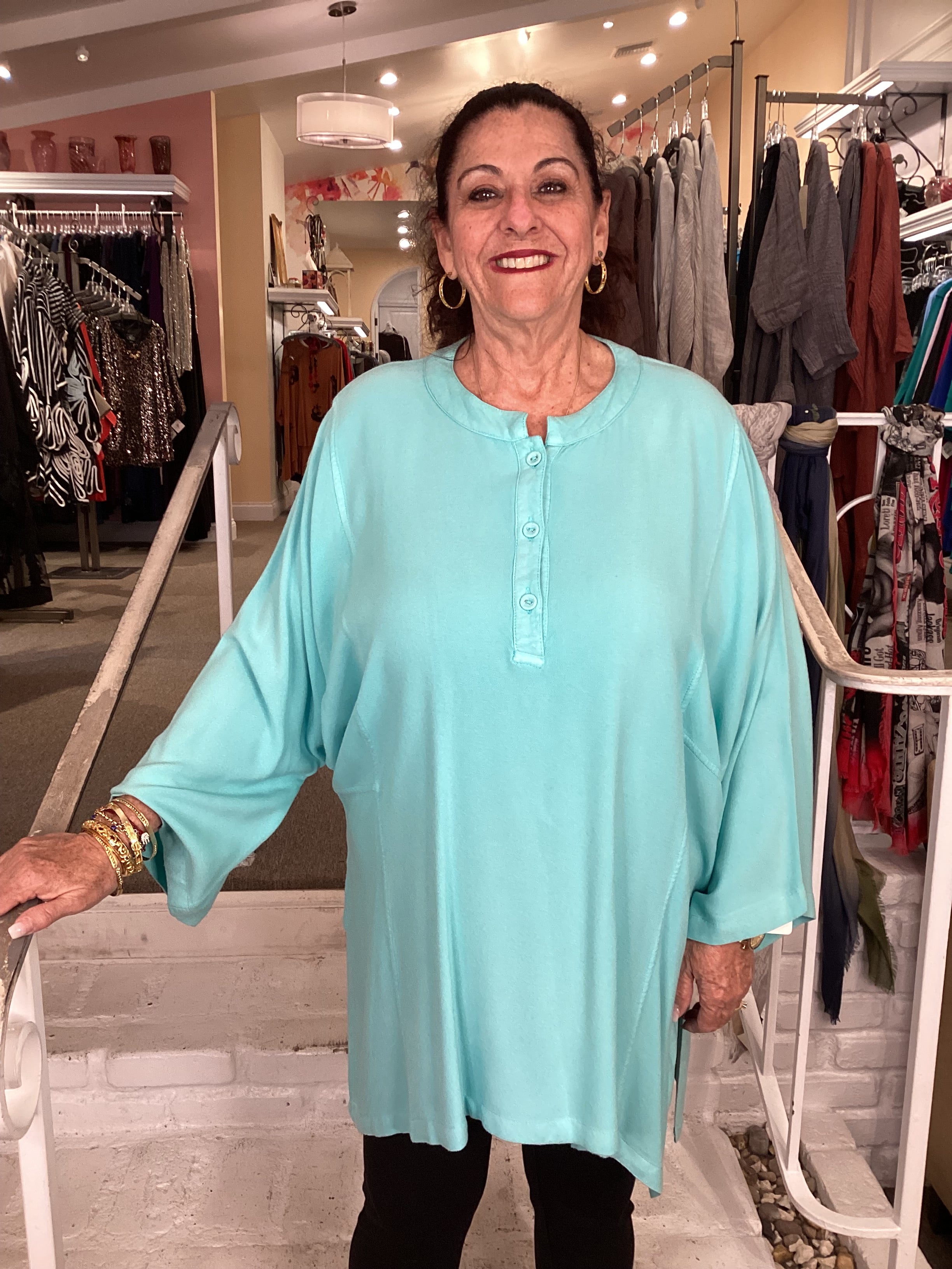 Crafted from a luxurious cotton-rayon blend, this high neck top delivers both comfort and style. The mandarin collar provides a refined neckline, while three front buttons—designed to close partway for a modern, layered aesthetic—offer customizable coverage. Side slits enhance mobility and create visual interest, complemented by thoughtful underarm insert detailing that ensures a flattering fit. The 3/4 sleeves strike the perfect balance between coverage and versatility, making this Caribbean-inspired piece an essential addition to any wardrobe.