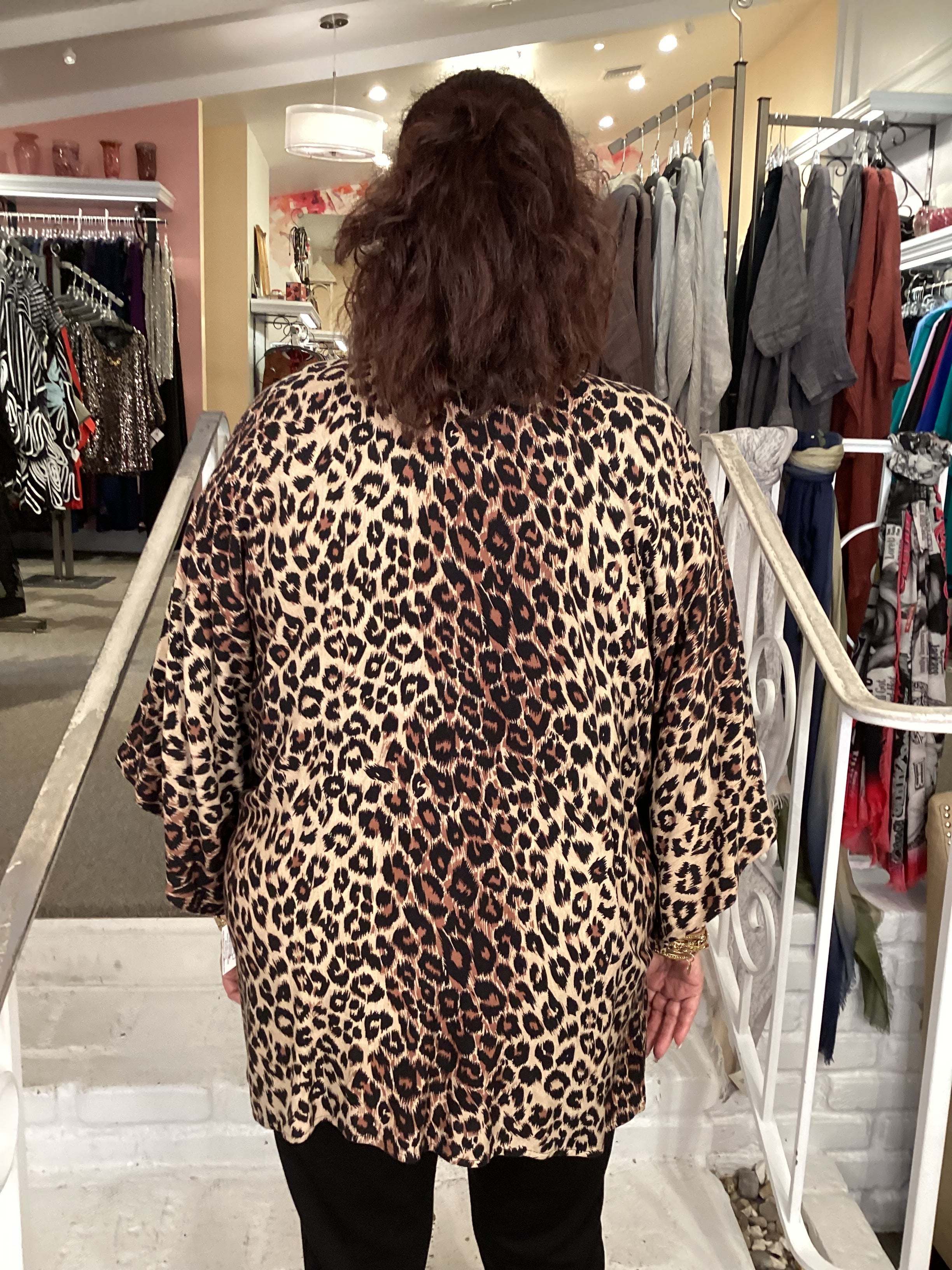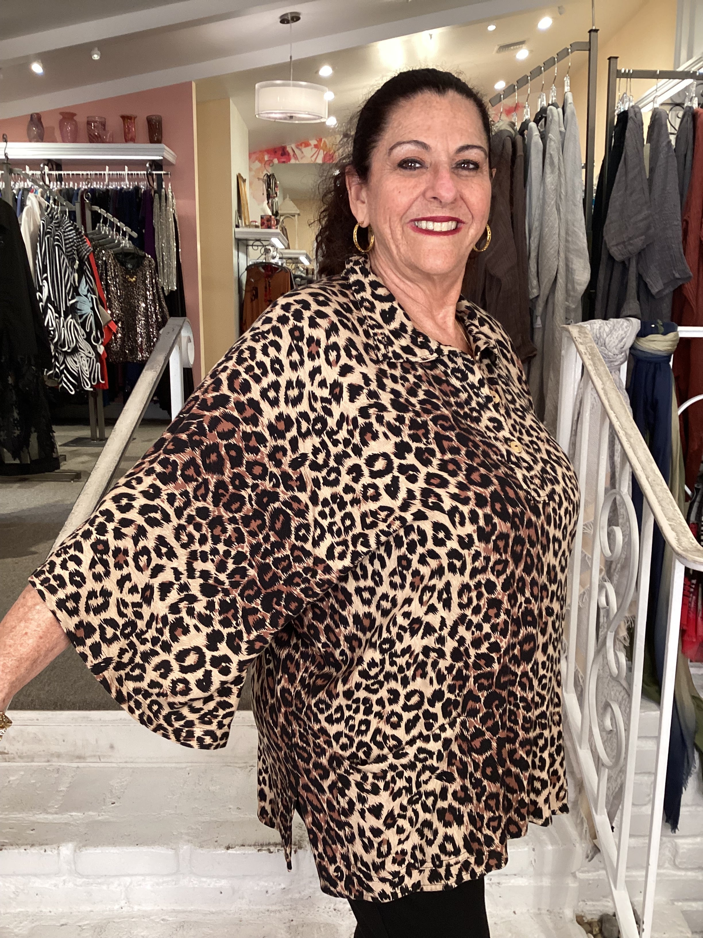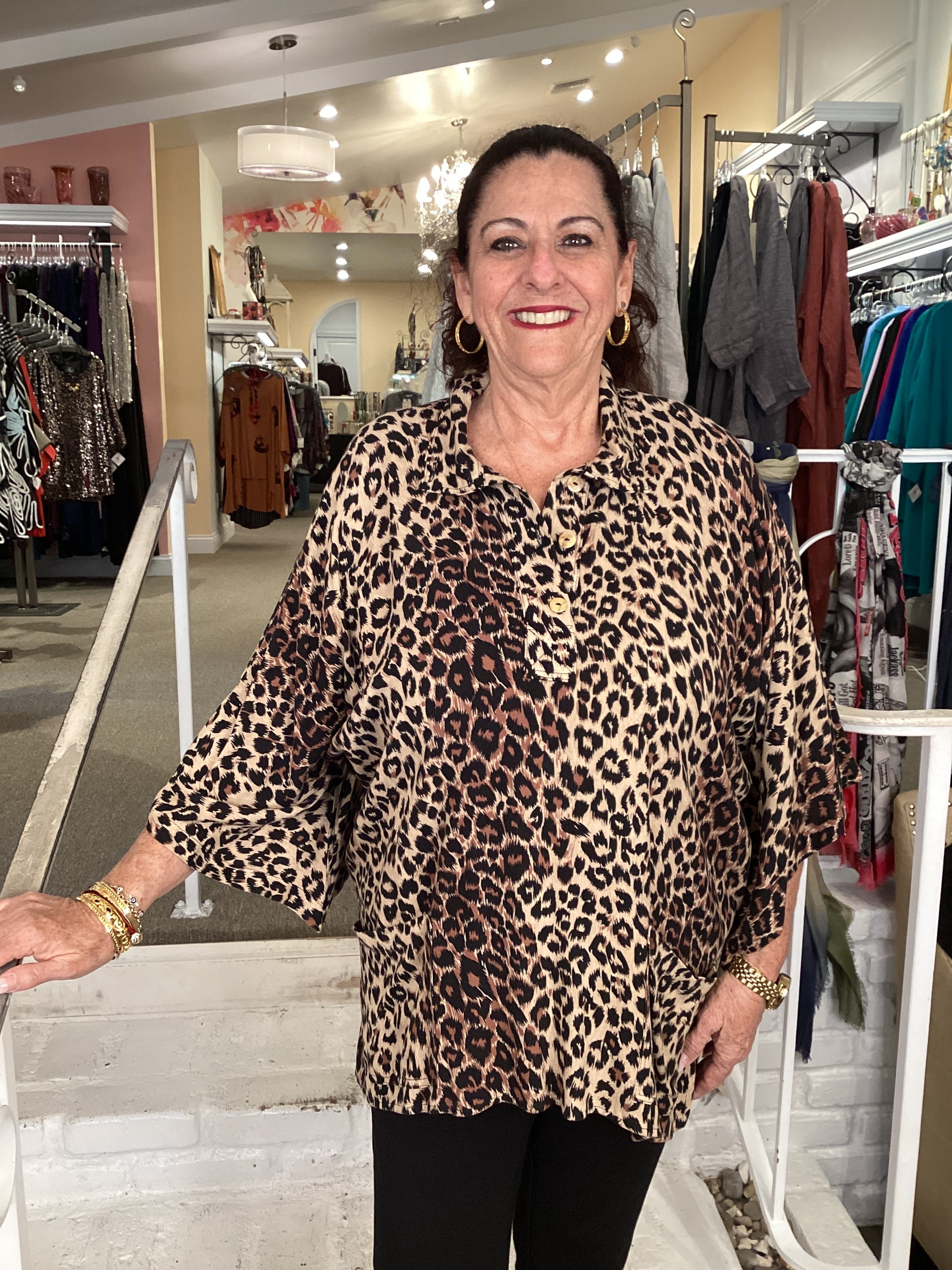 This sophisticated leopard saddle print top features a refined high neckline and three-quarter sleeves for polished everyday wear. Functional front pockets add practicality, while the three-button front closure offers adjustable styling without fully opening. Subtle side slits provide comfortable movement and a flattering silhouette. Perfect for layering or wearing solo, this versatile piece transitions seamlessly from office to weekend.