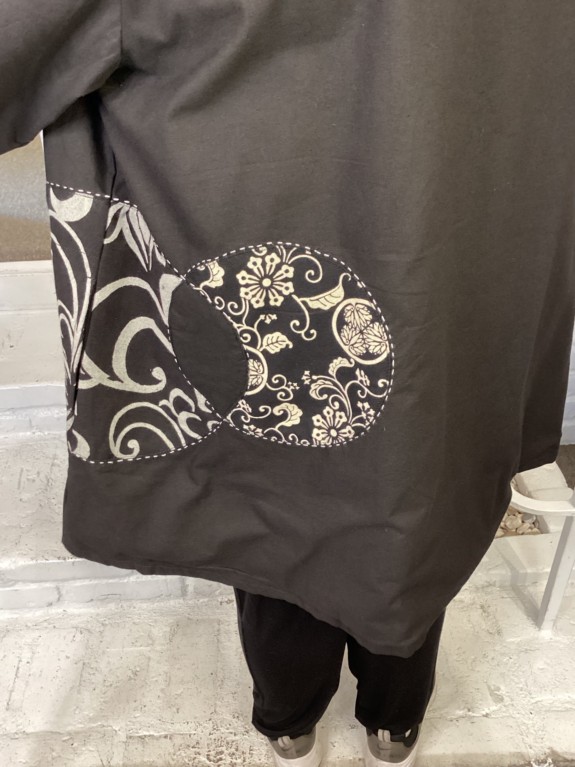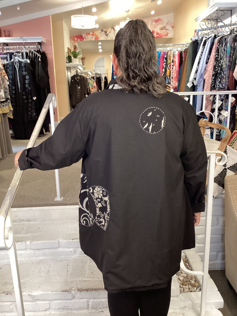 This soft, supple cotton jacket is adorned with multiple textile appliques and hand stitching front and back. A button front cotton classic with a modified Nehru collar, pockets and an a-line silhouette. The bust measures about 52" with a length of 34".