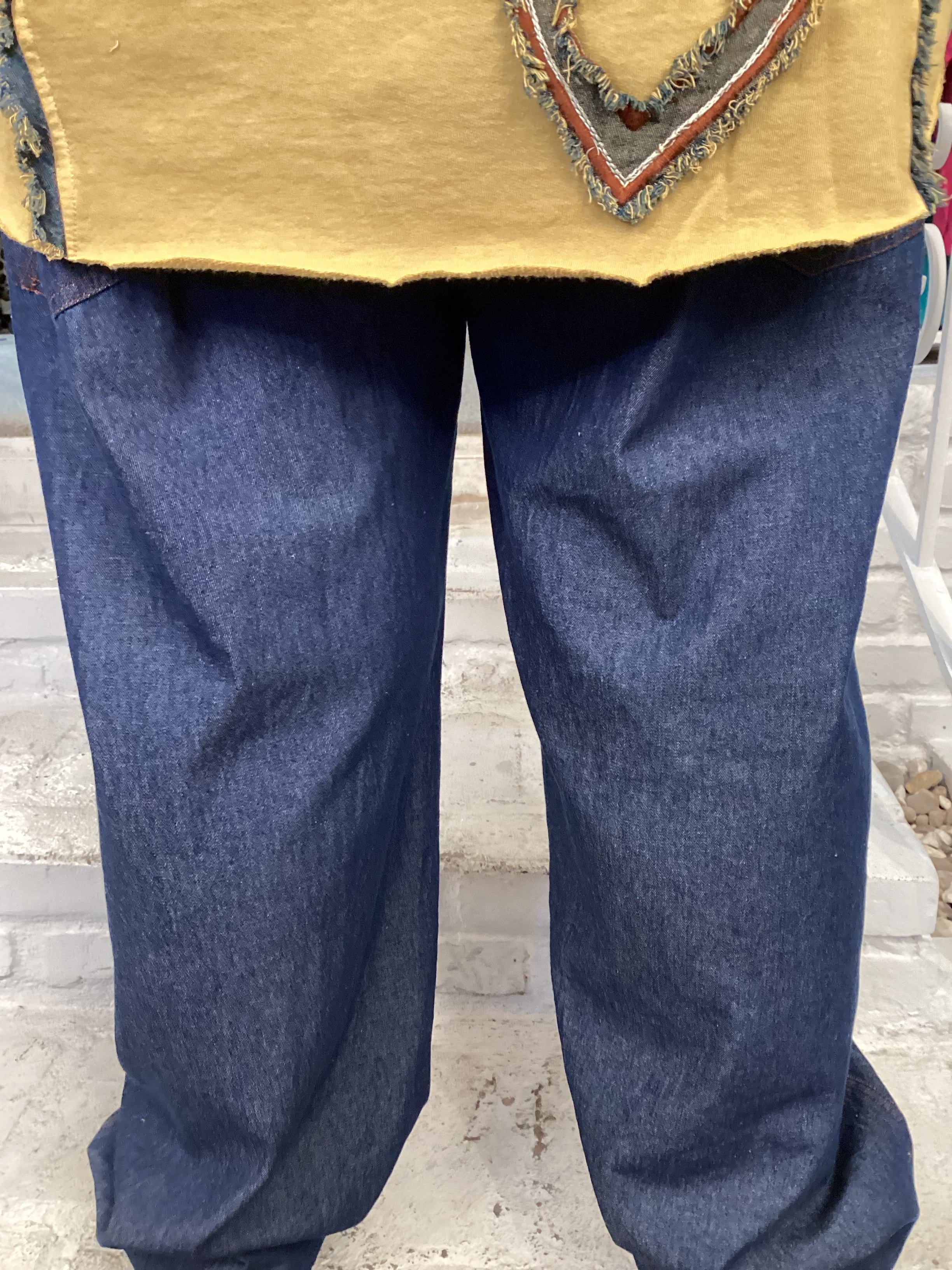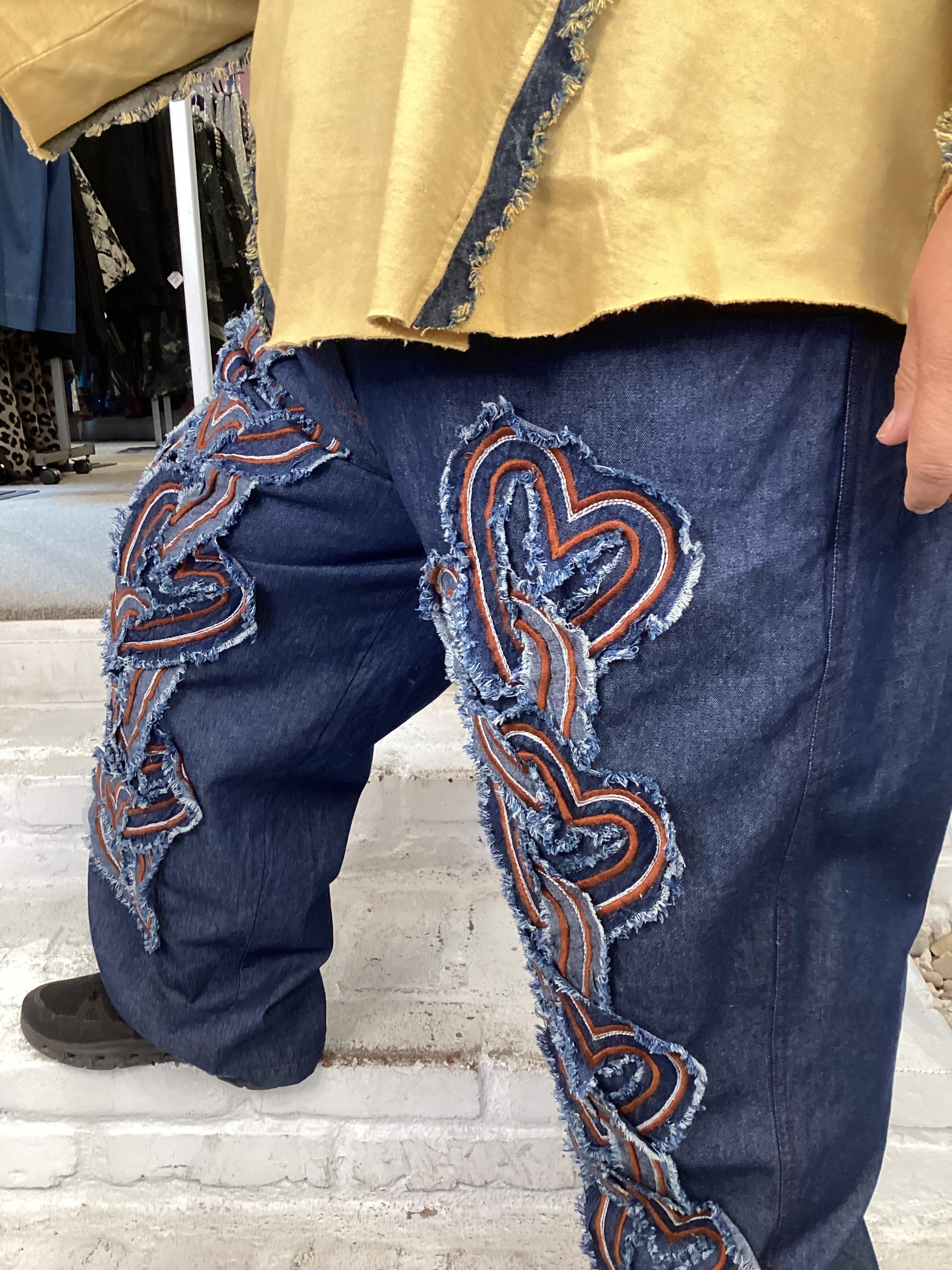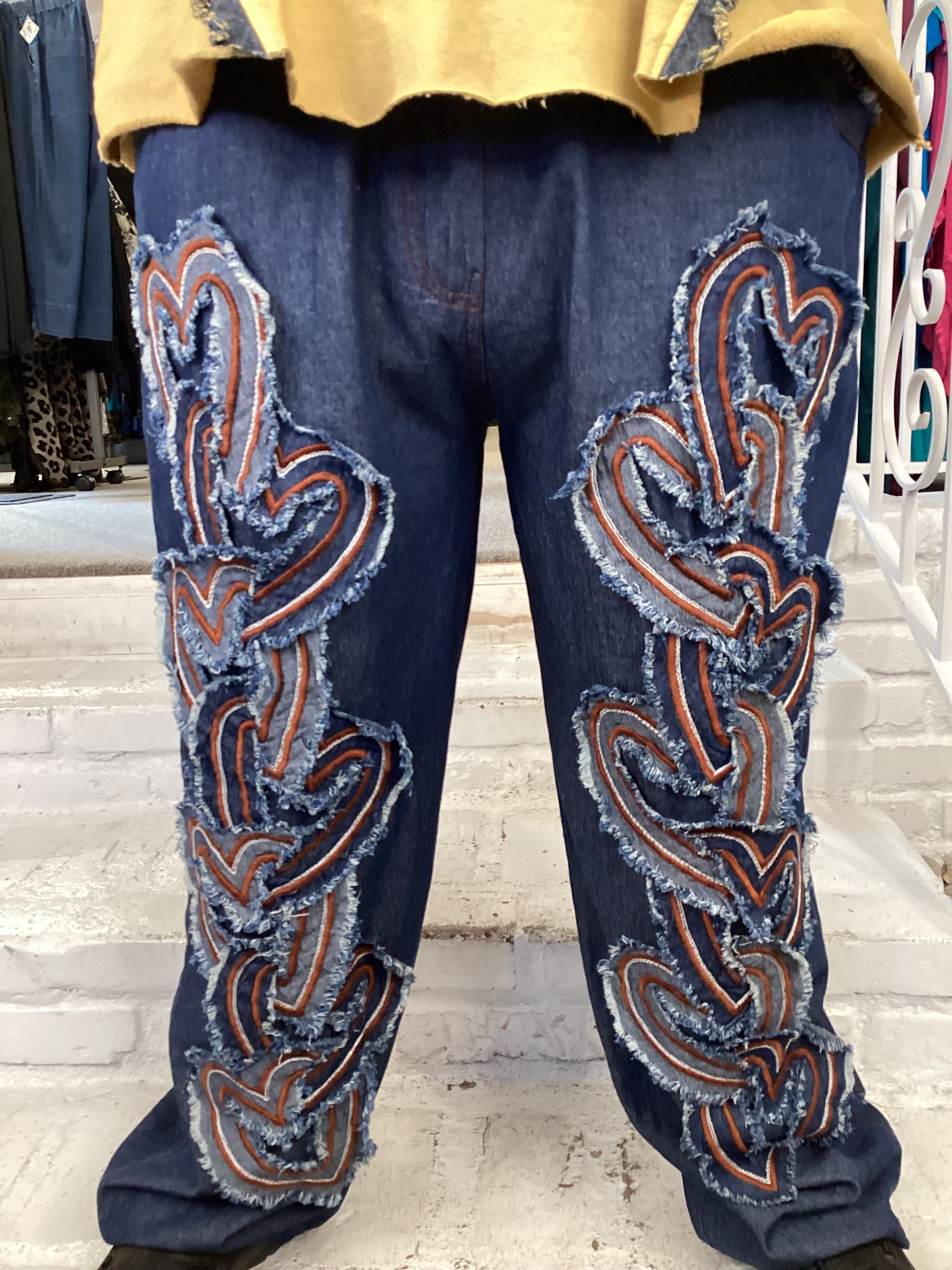 You'll be ready for anything in these linked heart jeans, with appliques up and down on both front legs. Distressed denim cotton with multiple pockets, elastic band in back, button/fly closure, belt loops and applique galore!!!The 1X waist is 38-40", hips 50", length 38". The 2X waist is 40-42", hips 54", length 38".
