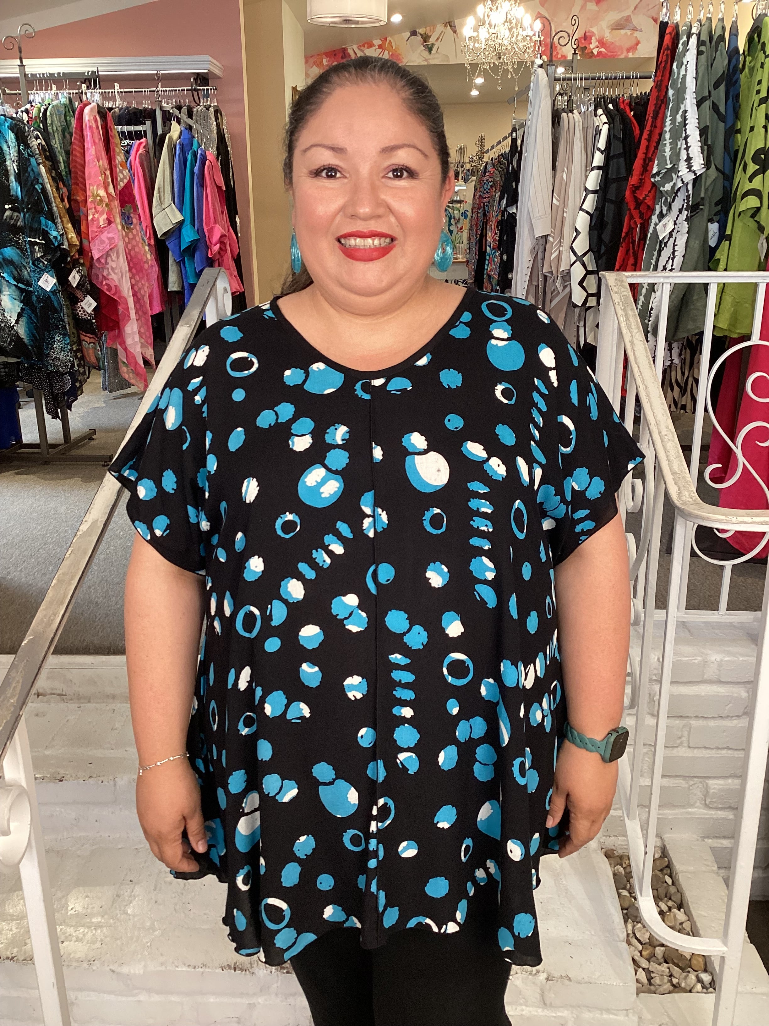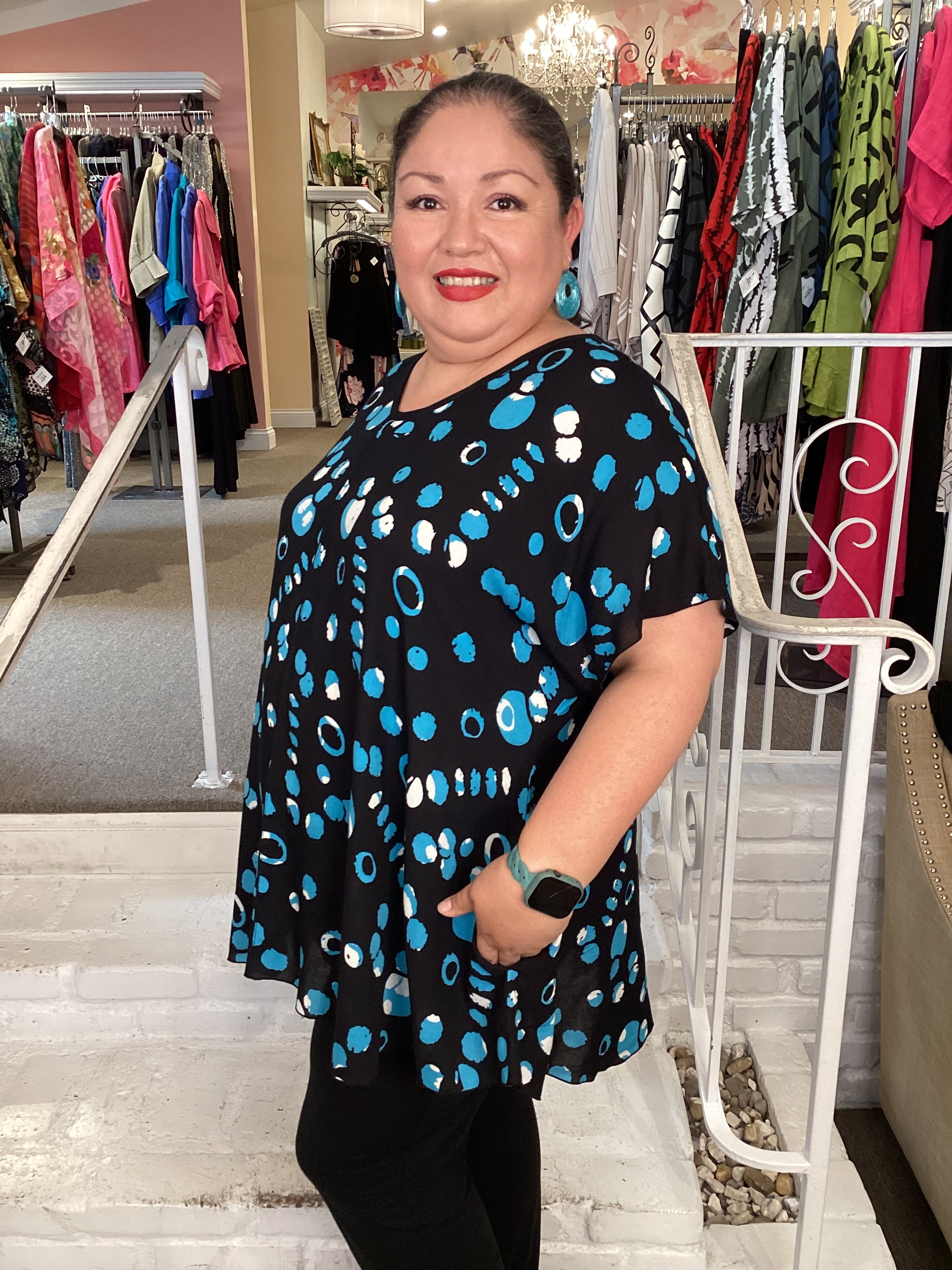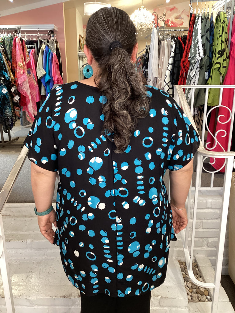 This top showcases a striking white and turquoise pattern against a black backdrop, creating a stylish and flowing look. The Kiana Tunic by Lyng boasts a flattering v-neck, 3/4 sleeves, and discreet side pockets. Its extended length makes it perfect for mixing and matching. Team it up with your go-to leggings for a fun and breezy summer vibe.