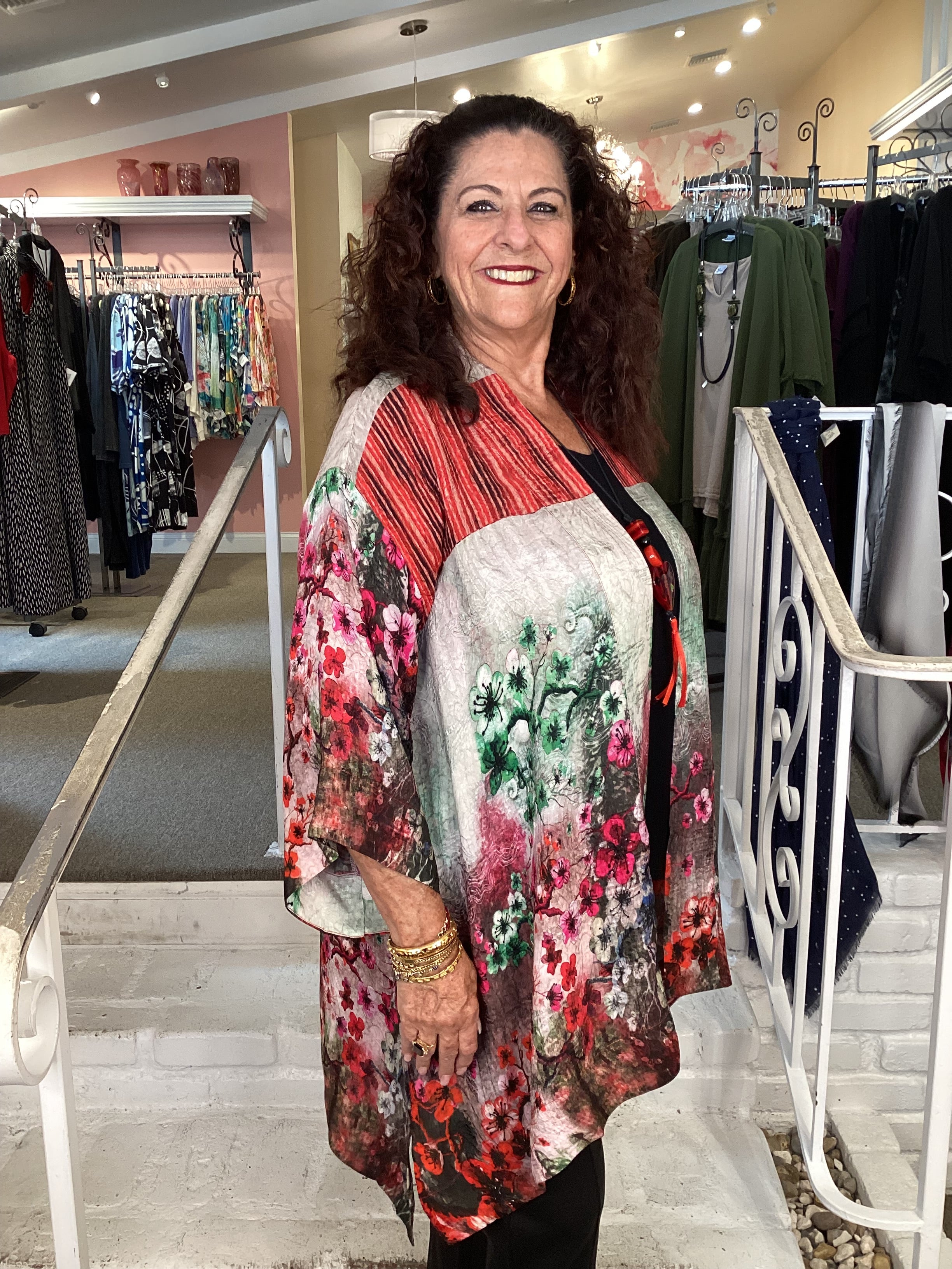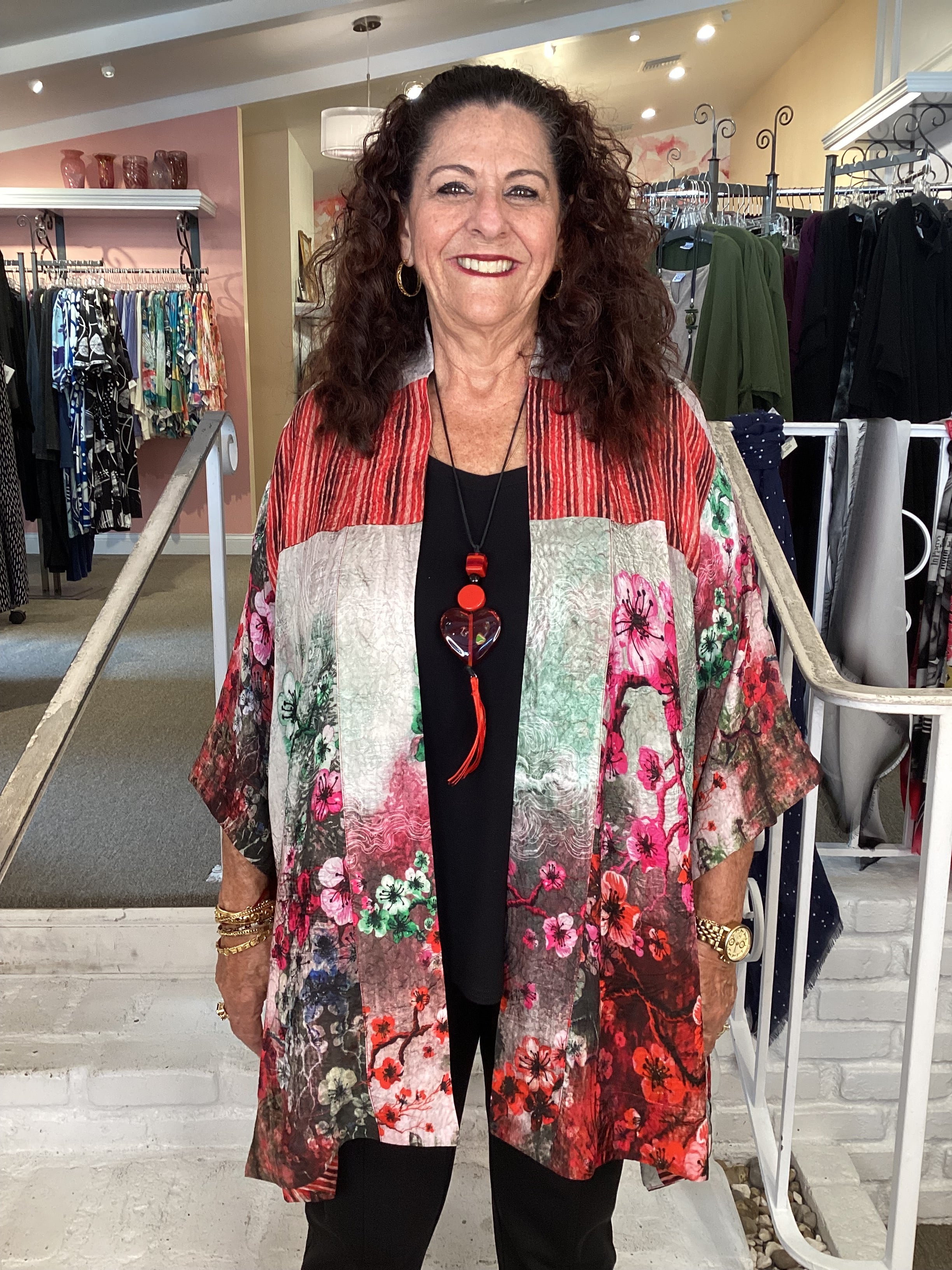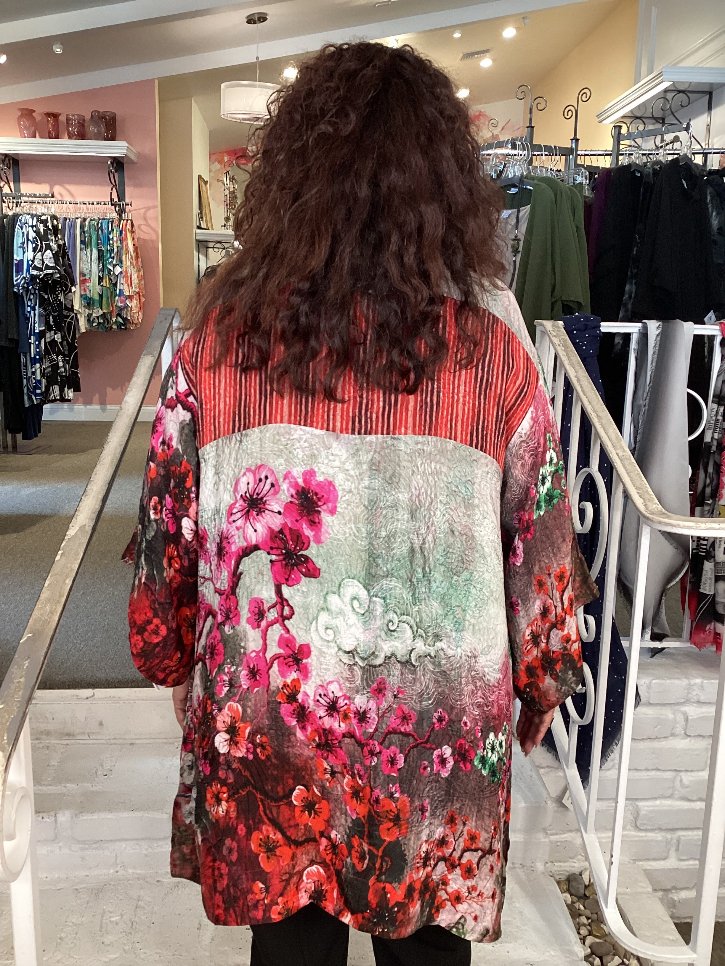 Beautiful open-front kimono top in our signature Silk Blend fabrication. Florals and shibori elements in natural earth tones blend beautifully. Wear it for a dressed-up look or casually over a T-shirt and jeans. With a flattering A-line shape, side slits, and 3/4 sleeves, it's the perfect addition to any outfit.