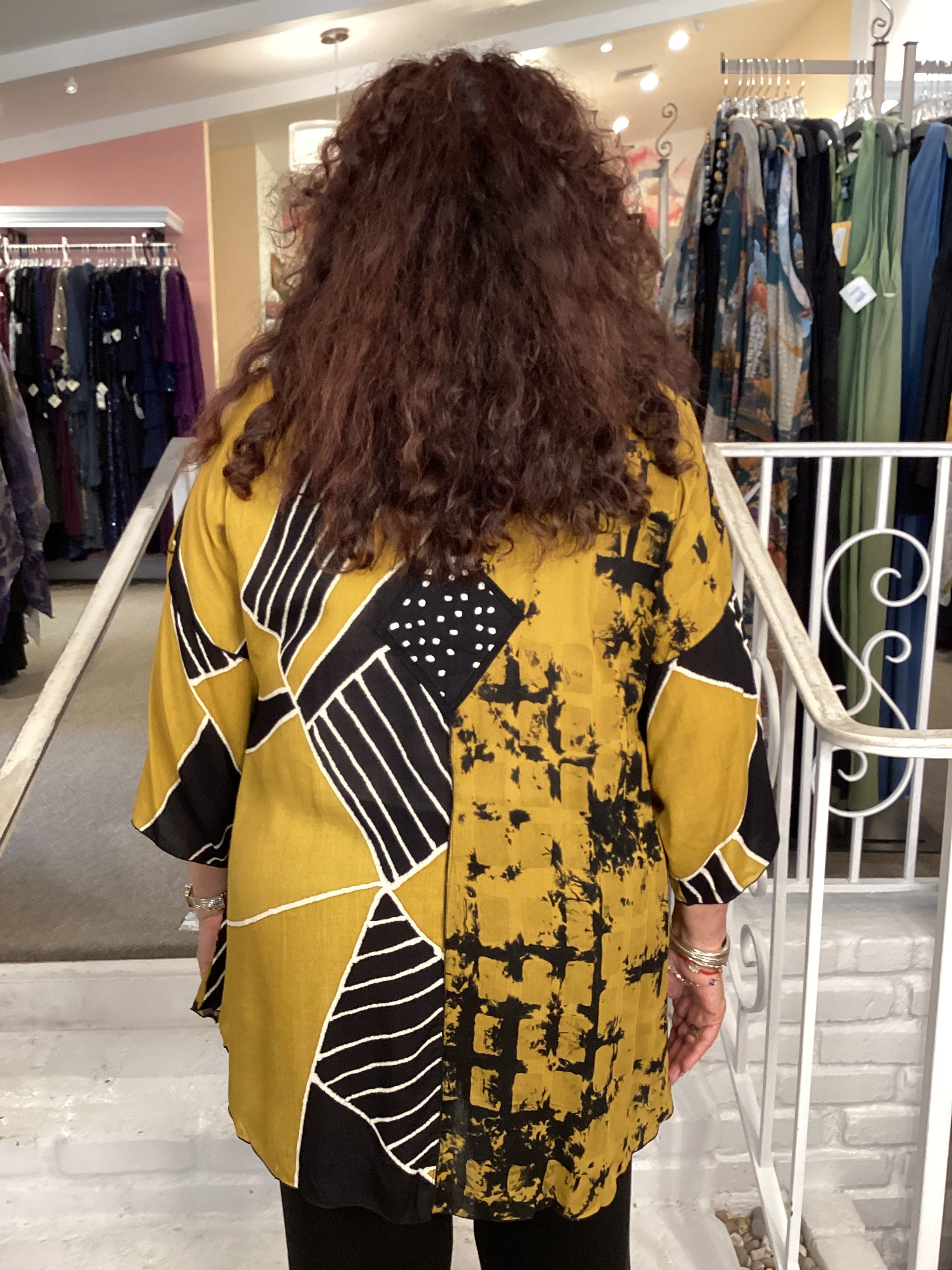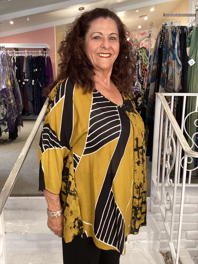 The perfect blouse for warm weather. Crafted with cool and comfortable rayon, this roomy A-Line swing cut features elbow length sleeves, a V-neck, and side-seam pockets. Hand-batiked in Bali by local artisans, the blouse is unique and includes a special Lyng touch of contrasting fabric panels.