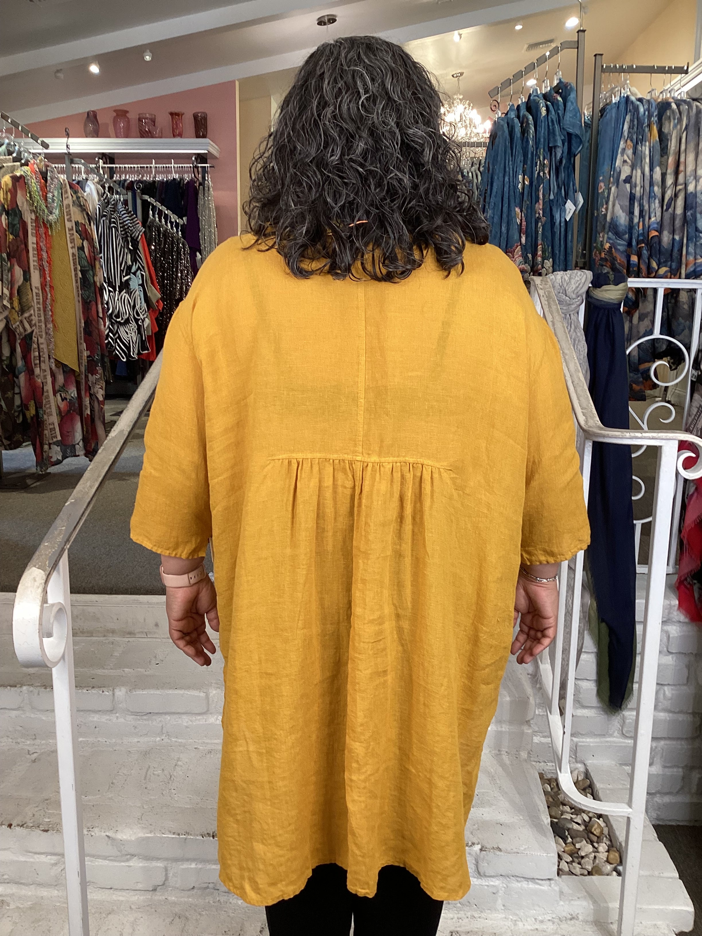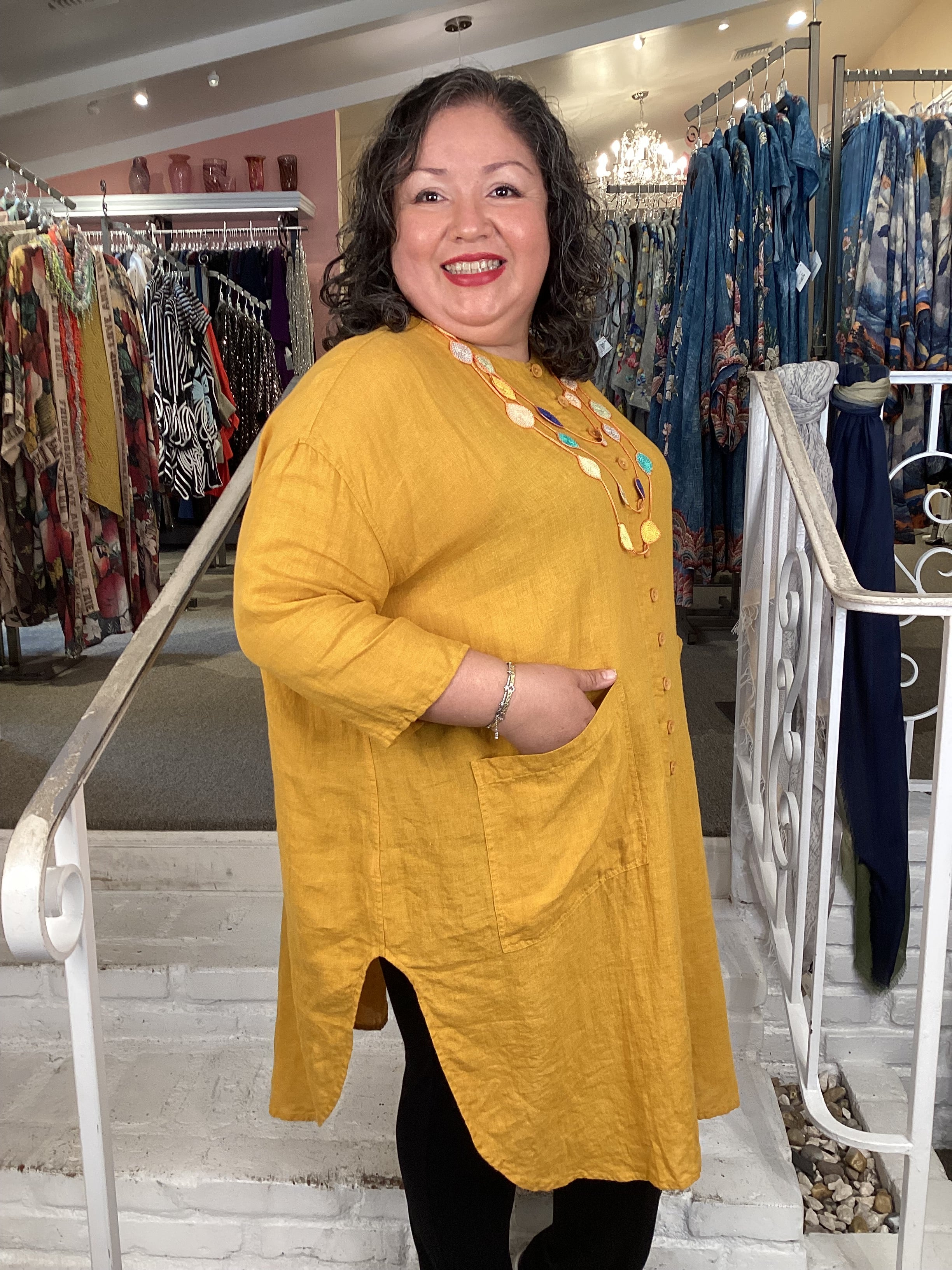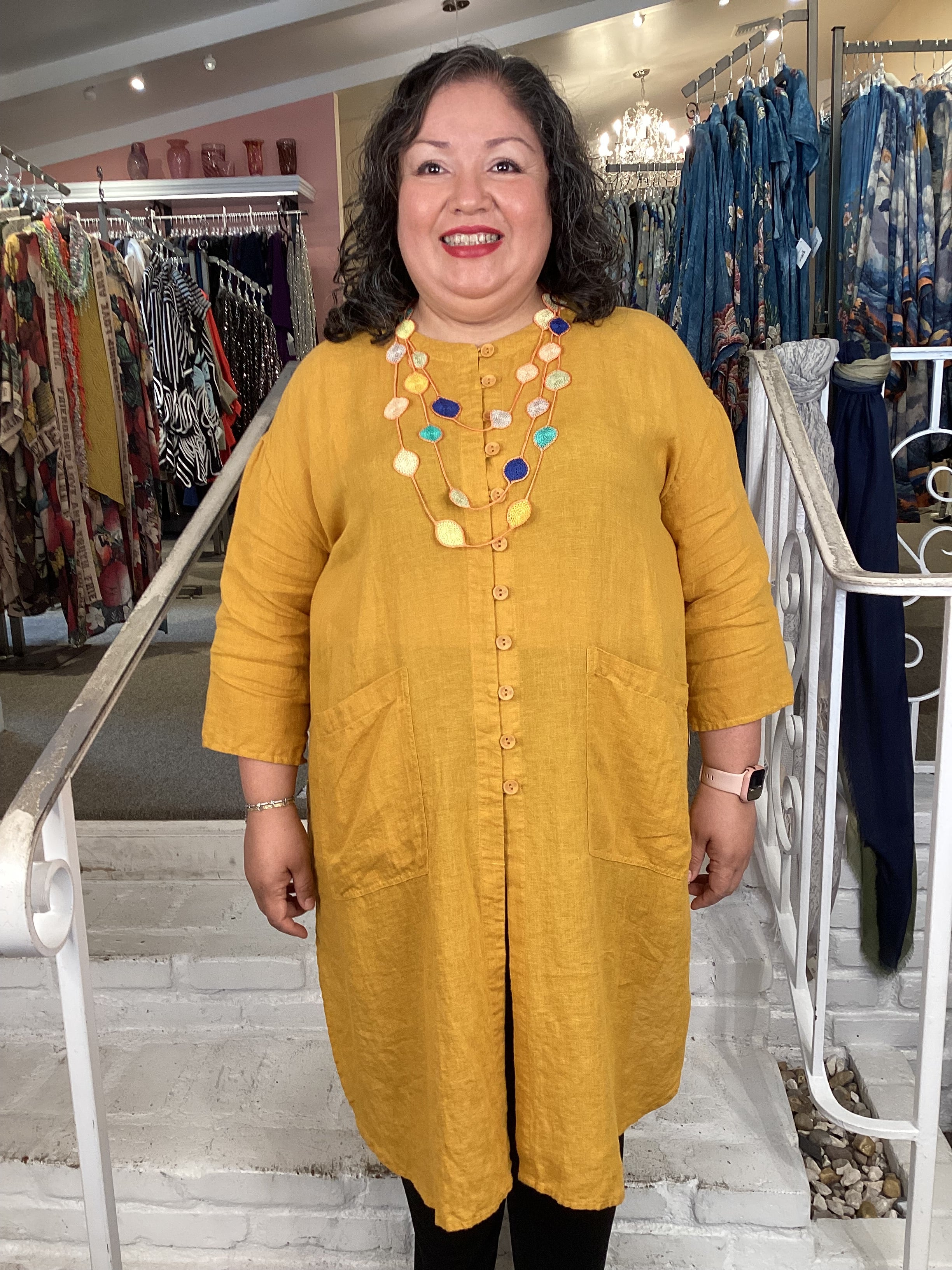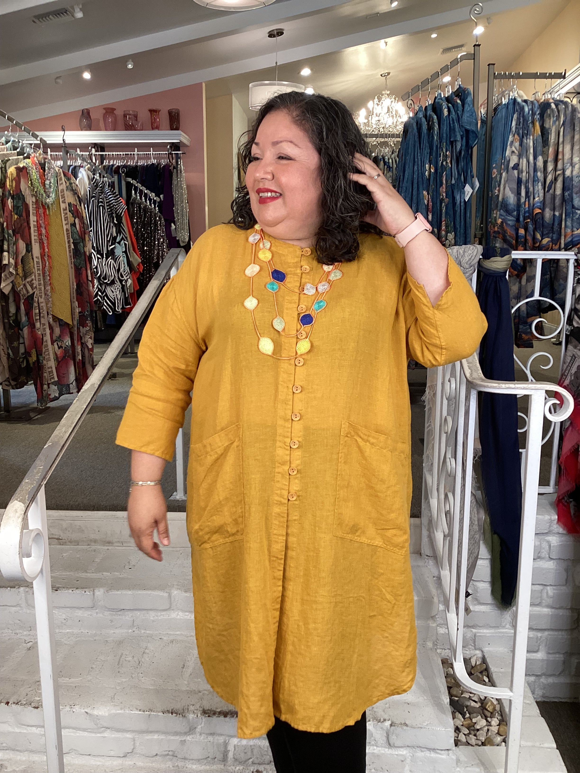 This expertly crafted tunic showcases rich mustard-hued linen, featuring a refined button loop closure and practical shirt tail hemline. Two generous front pockets add functionality to this versatile piece, making it an essential addition to any wardrobe seeking both style and substance.
