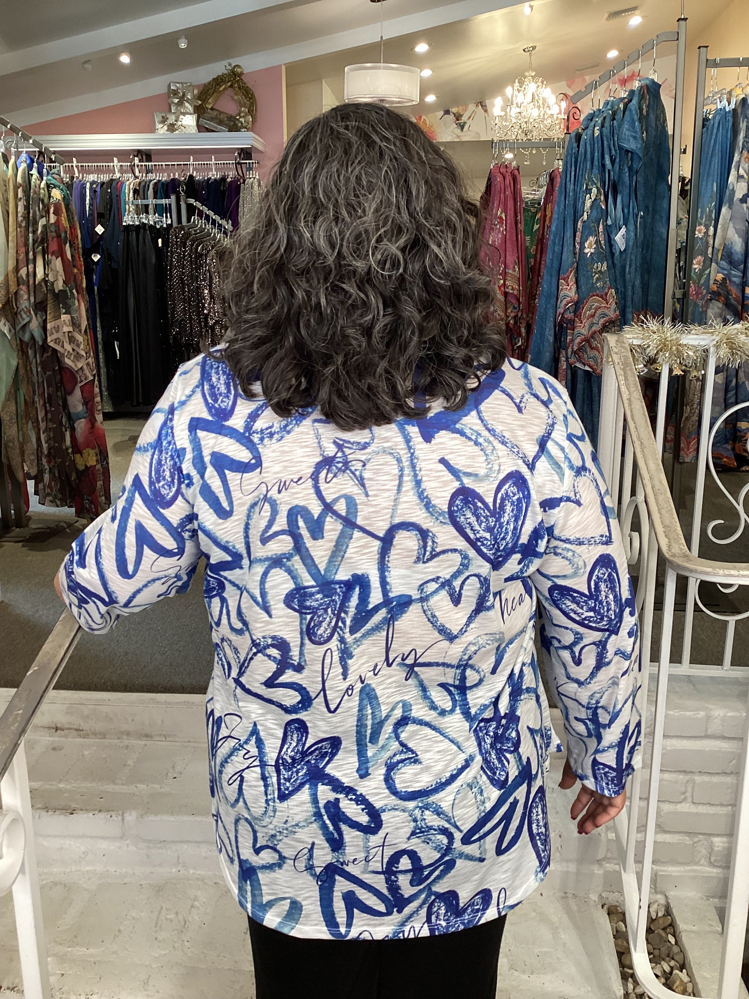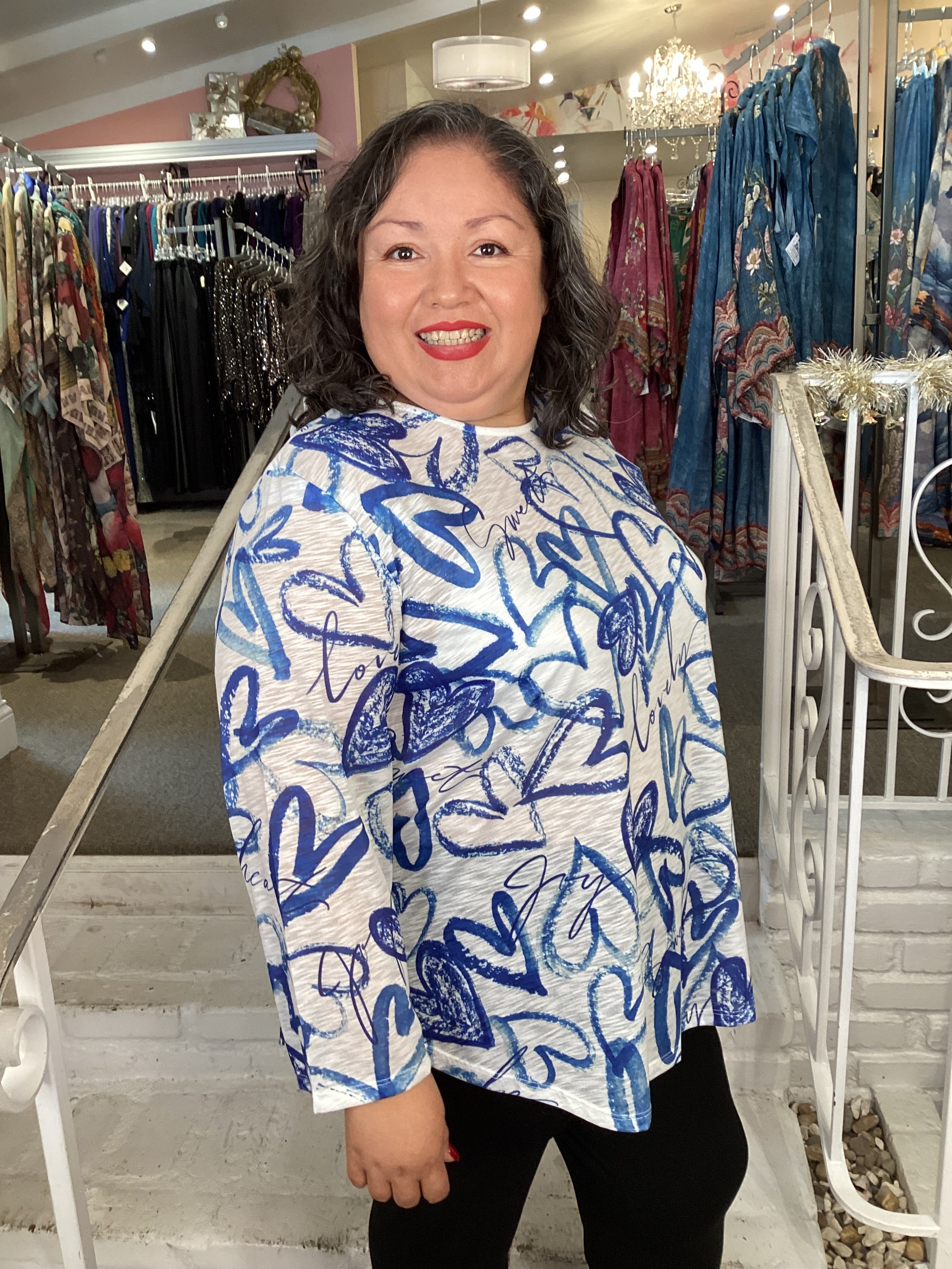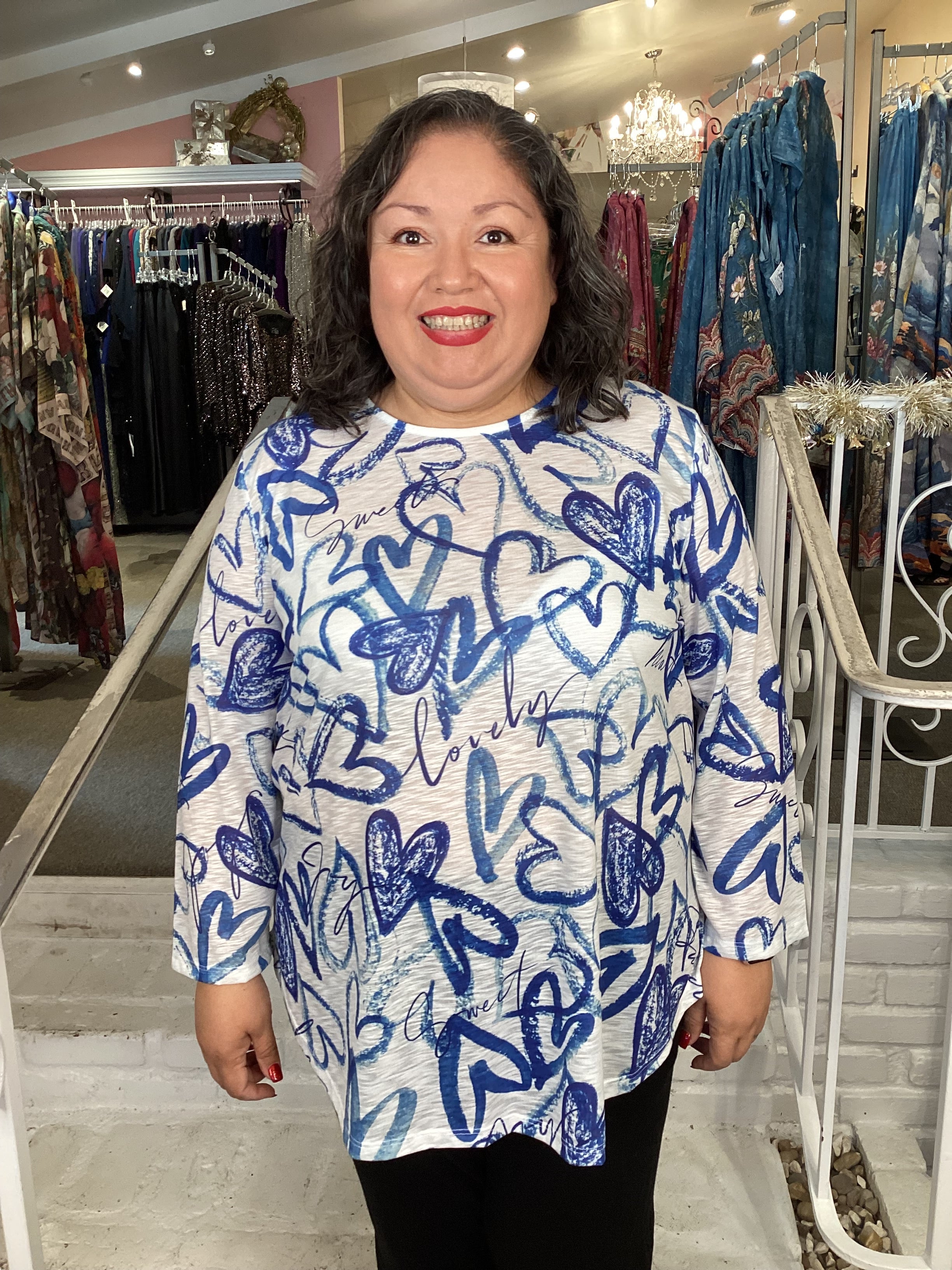 Crafted from soft burnout fabric, this long-sleeve top showcases an elegant blue and white heart motif that balances romantic appeal with contemporary style. The rounded neckline and flowing A-line silhouette provide flattering coverage, while the distinctive double-layered hem adds visual interest and dimension. Lightweight yet substantial, this piece transitions effortlessly from casual to dressed-up occasions, making it an essential layer for a well-rounded plus-size wardrobe.