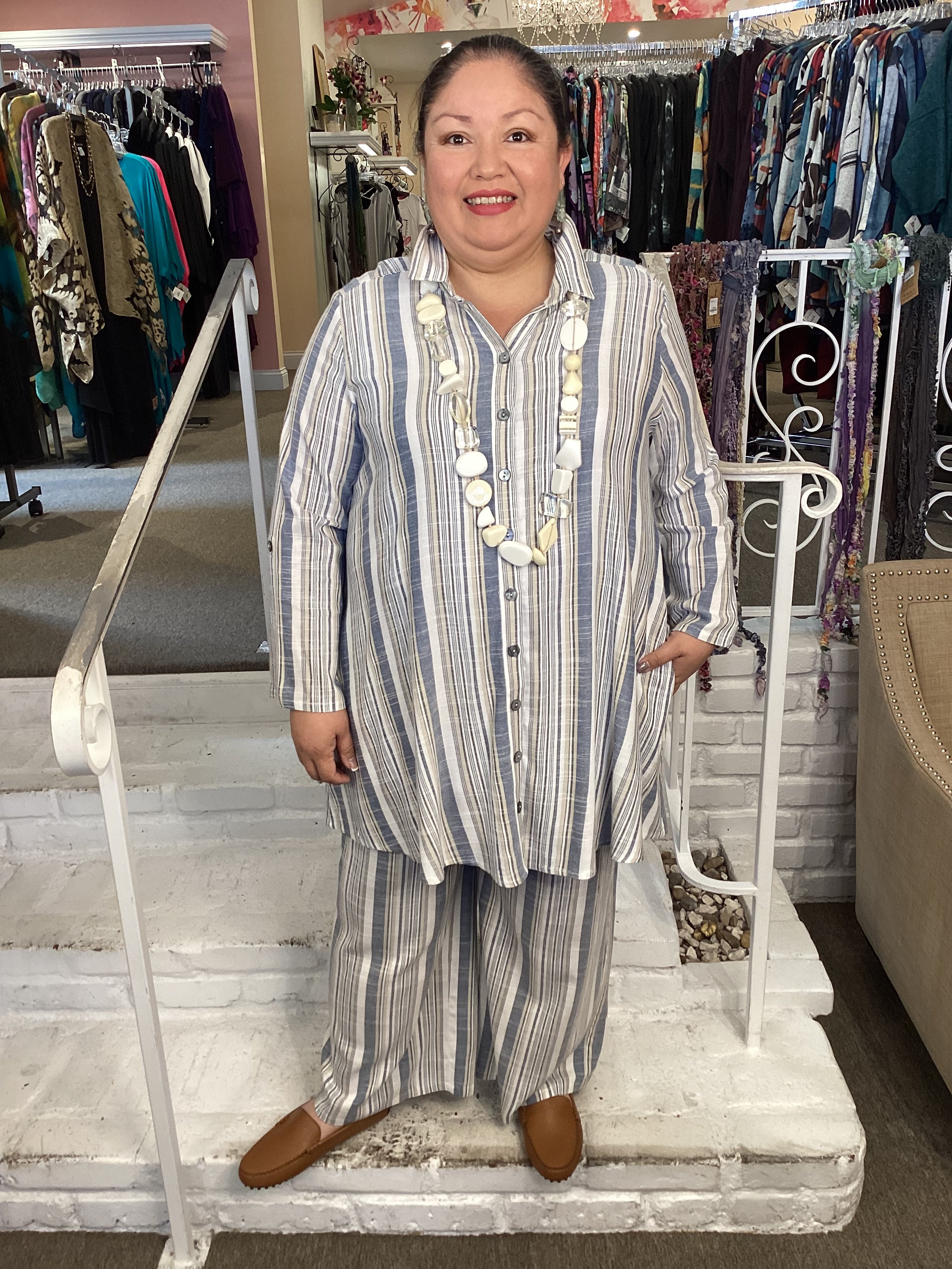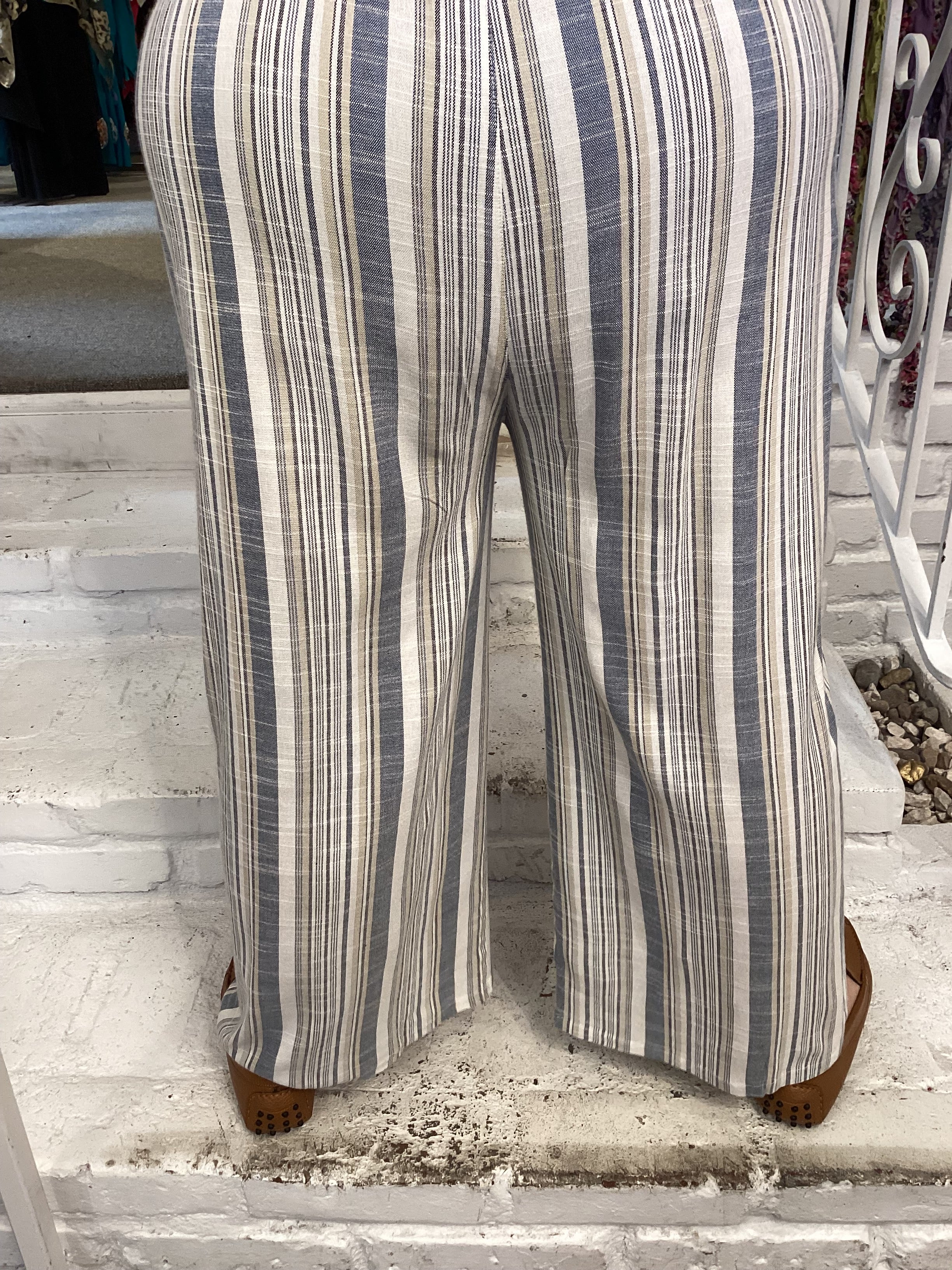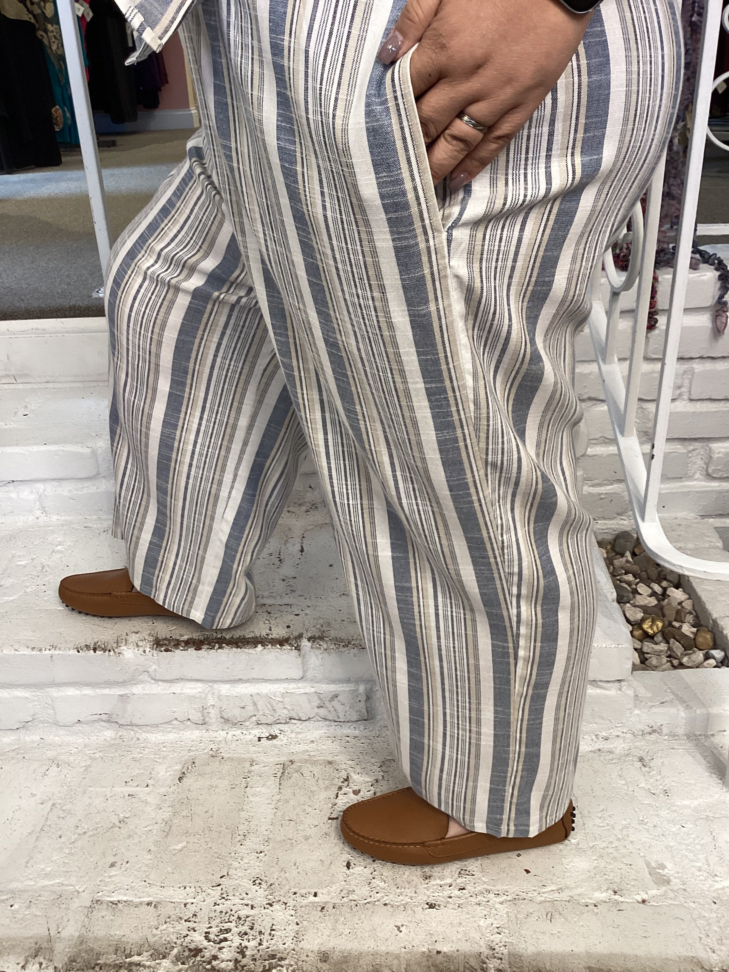 Experience the ultimate comfort and style with our Landon Capri Pant in a stunning blue, sand, and white stripe design. Featuring a stretch waistband for the perfect fit, convenient side pockets, and a lightweight fabric for all-day wear. Stay stylish and comfortable in this must-have capri pant!