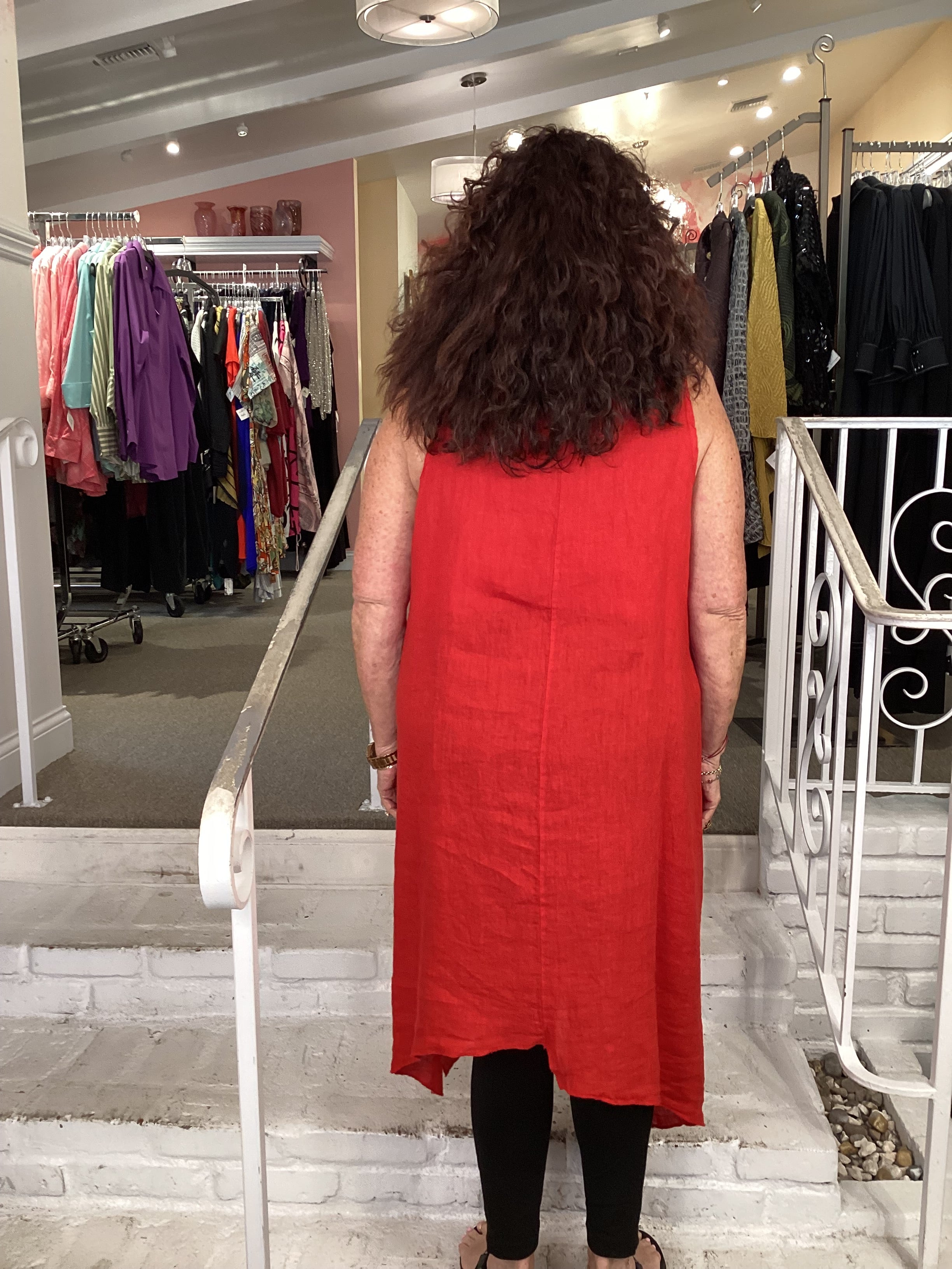 This simple a-line sihouette is detailed below the hips with faux layers on the front. Very generous at the hips, draping on the sides. Soft comfortable linen summer tank dress with a jagged hemline. The bust measures about 46", hips 58", length 36"
